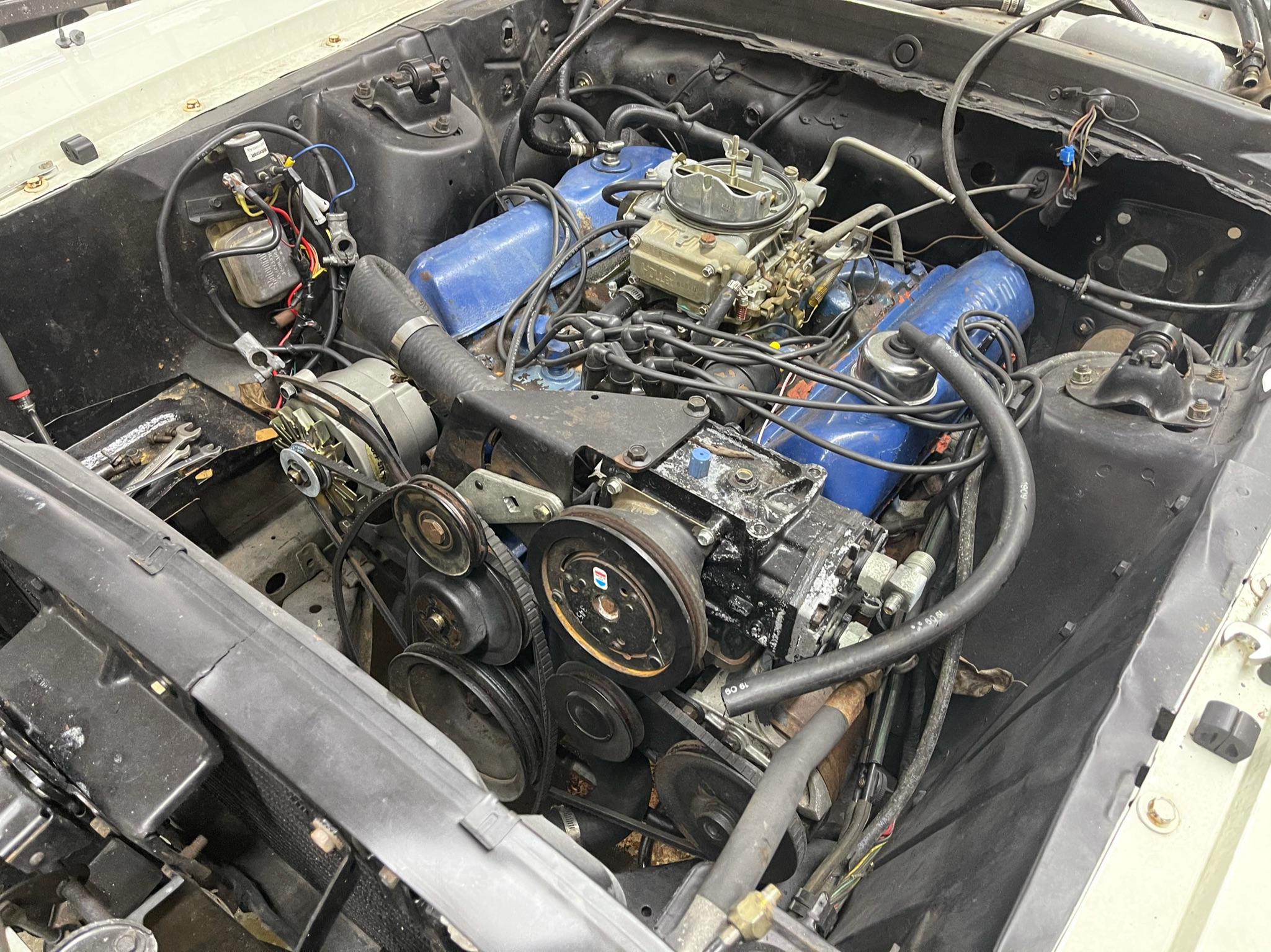 Modifications include: Custom "Candy" overlay Glasurit 55 line refinish in KTL "Cayenne"; Original bumpers have been shaved to body and re-chromed by Advanced Custom Chrome of Erie, PA; shaved and modified hood scoop; Chassisworks 4 link, Varishock, coil over suspension; IDidIt tilt away steering column: Baer Brakes T4 in "Black Ice" finish and Baer brake booster; Schott Performance 18" Venom series wheels in Polished finish; Mickey Thompson Tires; Dakota Digital custom built gauge cluster to mock original style with analog and digital upgrades; Sparc Industries, Stallion steering wheel, wrapped with Moore and Giles Tribeca Black leather, Vintage Air upgrades, CVF black and polished combo pulley system, Holley Terminator X fuel injection on top of the rebuilt, original 390 FE engine, Dougs headers, Promaxx heads, CVF Valve covers and hood hinges; XS Power Battery; Painless wiring; Dewitt's Custom Radiator; Boom Mat by DEI sound-deadning; Titanium header, heat wrap by DEI.