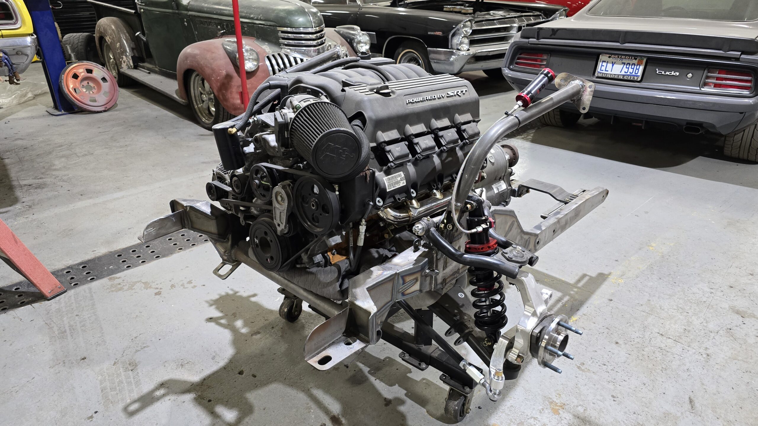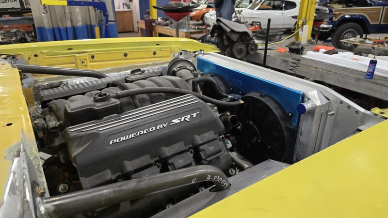 A few years later, the car underwent another major transformation. The big block was replaced with a modern 392 Gen 3 HEMI controlled by a Holley Terminator Max X ECU, paired with a ZF 8HP70 eight-speed transmission. Suspension was upgraded again with a QA1 coilover system and Wilwood disc brakes, while a Moser Engineering 8¾ rear axle was added for the track.