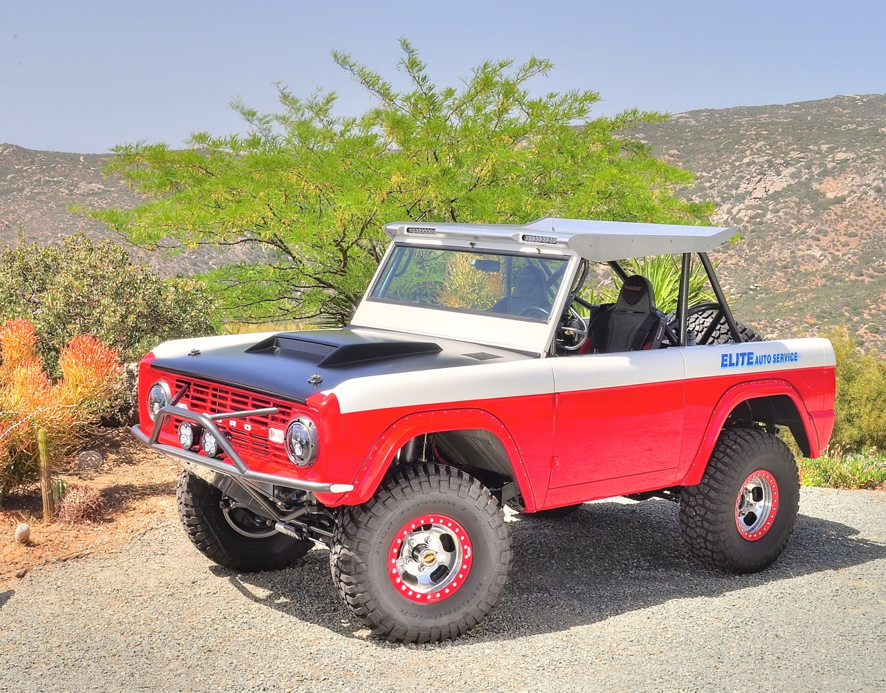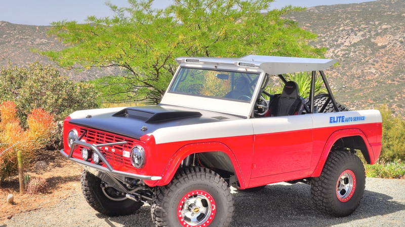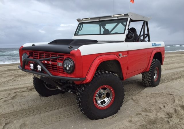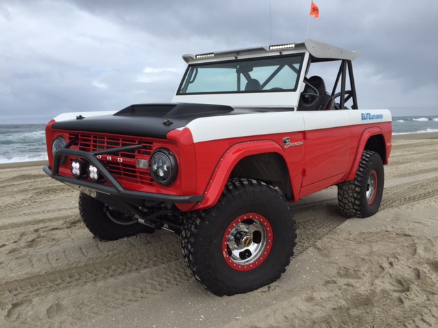 Fully built from the ground up by Elite Bronco's of El Cajon Ca. Fuel injected 5.0 Cobra engine, Lokar dipsticks, Wilwood disk brakes, Bilstein shocks, coil over and by-pass 2.5", Baja designs LED lights, custom OMF beadlocked US Mags wheels, powder coated frame and cage from Powder One of El Cajon, Painless Performance Wiring, Flaming River tilt column, many layers of urethane PPG paint, BFG 33' mudders,