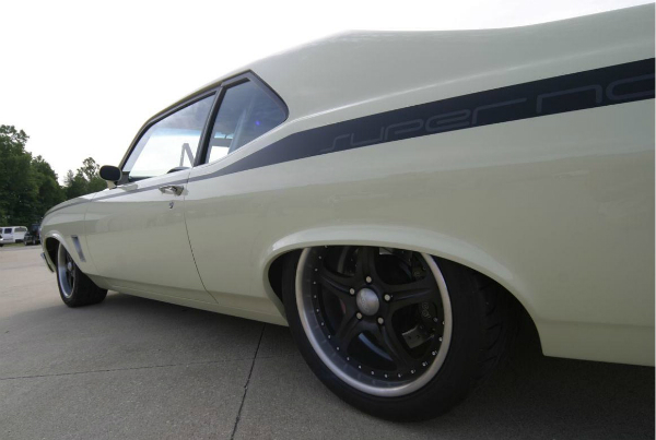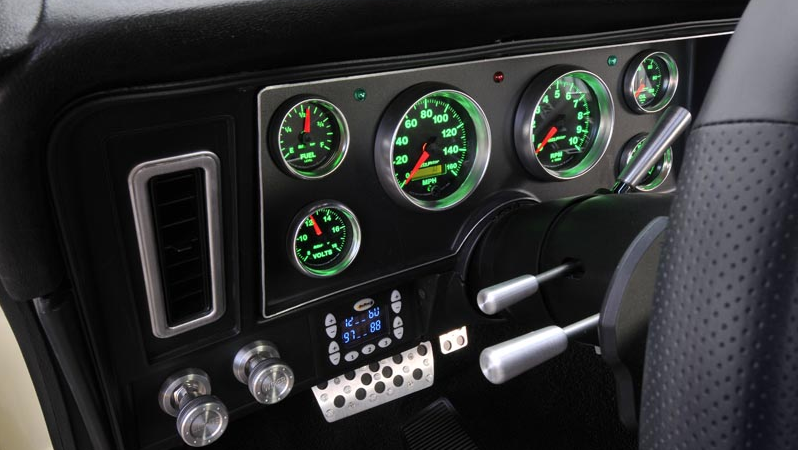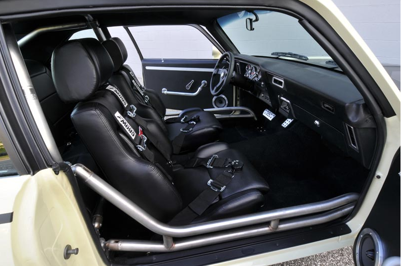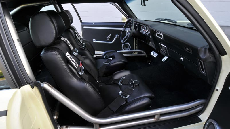 Suspension: Alston Chassisworks front clip, complete Ridetech “Shockwave” system, with bolt-in air bar 4 link rear suspensions, Ridetech “Air Pod” compressor system, Bolt-in stainless “Tiger Cage” roll cage and Detroit Speed mini-tubs.
