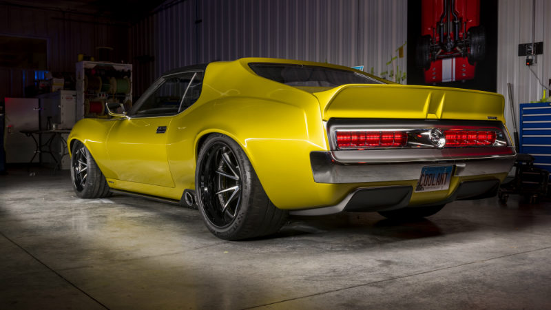 The Rings extended the Javelin’s wheelbase by moving the wheels forward six and a half inches. The car’s distinctive wheel arches were moved forward and recreated in carbon fiber to pair with a new hood, front fenders, grille and front valance. Other custom details include tail lights, bumpers, trim and engine bay accessories all machined out of blocks of aluminum at the Ringbrothers facility.