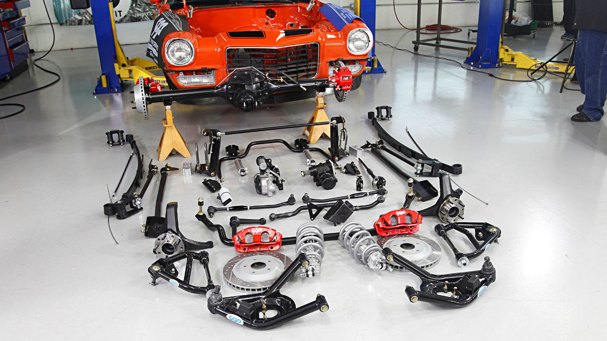 10. By the end of Day 1, we had the Camaro stripped down and all of the CPP suspension installed under the car. The front kit included CPP’s tubular control arms and their badass spindles that utilize C7 Corvette sealed bearing hubs, which are quite a bit stronger than the C6 hubs used in many kits. The front 13-inch rotors came slotted, drilled, and zinc washed.