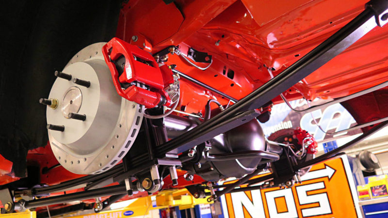 8. To replace the old 10-bolt peg-leg rear, CPP supplied a complete 9-inch rear filled with 3.70 gears and a Detroit Truetrac posi. The rear came with the 12-inch disc brake system already installed, which was a real time saver. You can also spy CPP’s narrow leaf springs. When combined with their shackle kit, the system will give us just enough room for the 315mm rear tires.