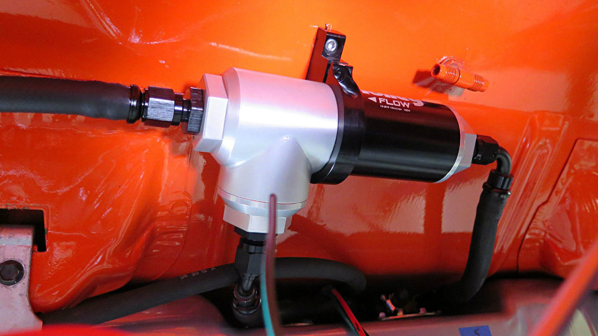 12. The plumbing was made easier with this slick combination fuel filter and regulator from Holley. As implied, the regulator has an integral, fully serviceable fuel filter. This saves space and money since less fittings are needed to plumb it all in. The regulator itself came preset at the required 59.5 psi needed by most LS EFI systems.