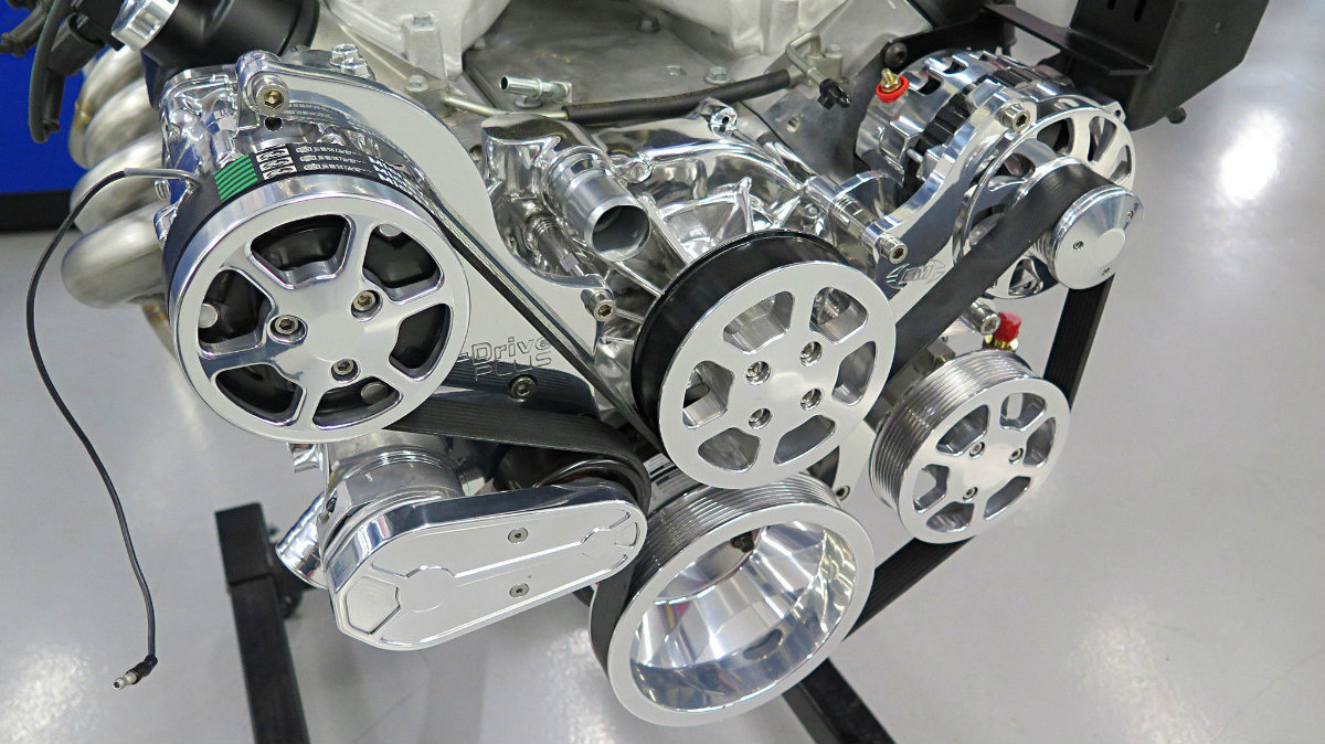 16. We then bolted on Eddie Motorsports S-Drive Plus drive system. The parts came fully polished and clearcoated so that it will stay looking good with little effort. We like this system since it includes brand-name accessories like the Powermaster 140-amp alternator, Tuff Stuff water pump, Sanden A/C compressor, Maval power steering pump, GM heavy-duty tensioner, and Gates belt. The S-Drive Plus also incorporates an eight-rib drive belt that can hold 33 percent more power than a six-rib belt.