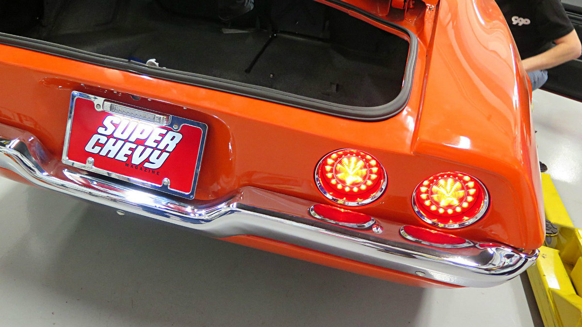 31. The guys from United Pacific also stopped by with a complete LED lighting kit for our Camaro. We opted to ditch the backup lights in the taillights and have two pairs of brake lights with an attention-grabbing sequential module. To make up for losing the reverse lights we added a very cool license plate, also from United Pacific, which incorporated a plate light and very bright LED reverse lights. Day 3 and most of Day 4 were spent wiring up the Camaro.