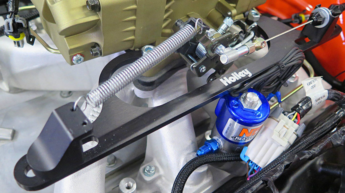 36. The throttle cable from the Clayton Machine Works pedal was run to the Holley Terminator and hooked up just like any carburetor would be. You can also spot the nitrous solenoid for our NOS Cheater system. Why? Because a little more power is almost just enough.