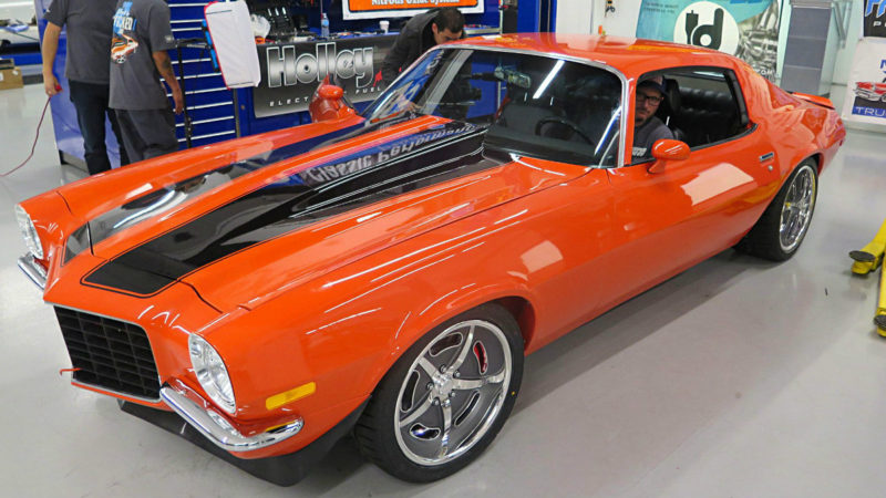 30. Speaking of ECUs, we mounted the Holley and Performance Automatic computers to the Camaro’s flat firewall. Both units are weathertight so this was the best option. You can also see our rather attractive black transmission dipstick from Lokar.