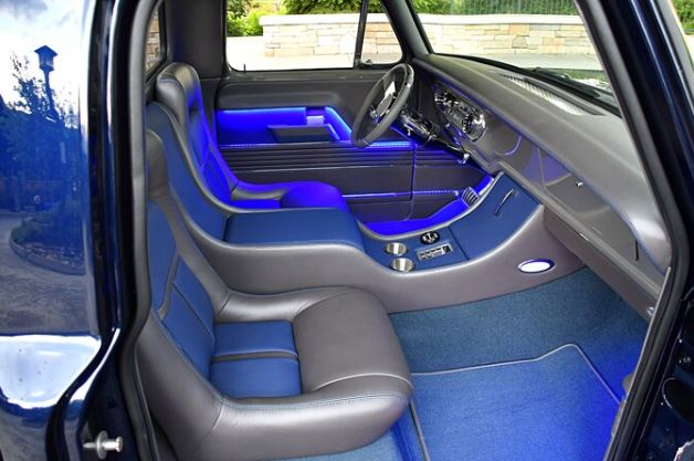 The final step was the custom interior, accomplished by Steve Holcomb from Pro Auto Customs in Knoxville, Tennessee, using a combination of light gray and blue leather. Everything exudes upscale luxury. The smoothed dash uses a 1964 Falcon panel fitted with Dakota Digital instruments that monitor critical functions. The driver holds onto a Flaming River steering wheel that spins on an ididit column. The forward portion of the console holds controls for headlights, wipers, and A/C controls. In the center, the distinctive push-button shifter is clearly in view, sharing space with the Turbonetics boost controller and cup holders. Additional switches and fuses reside under the central armrest. The headliner, door panels, and under the dash are all backlit with blue LEDs. Music fills the cab, thanks to four speakers, front and rear, playing soundtracks from John’s iPhone via Bluetooth.