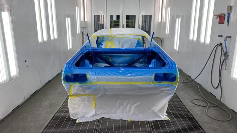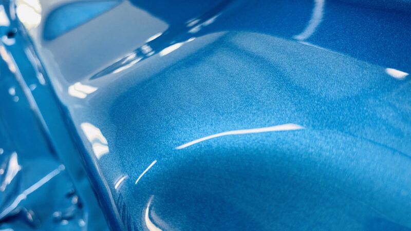 The original medium blue metallic was reimagined into a custom hue inspired by a Range Rover blue, infused with pearl and other proprietary techniques. This unique color, expertly applied by our painter, Jeff, radiates brilliance, especially when paired with the fresh chrome trim and white interior.