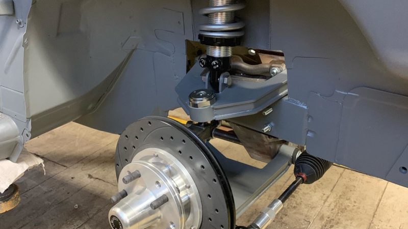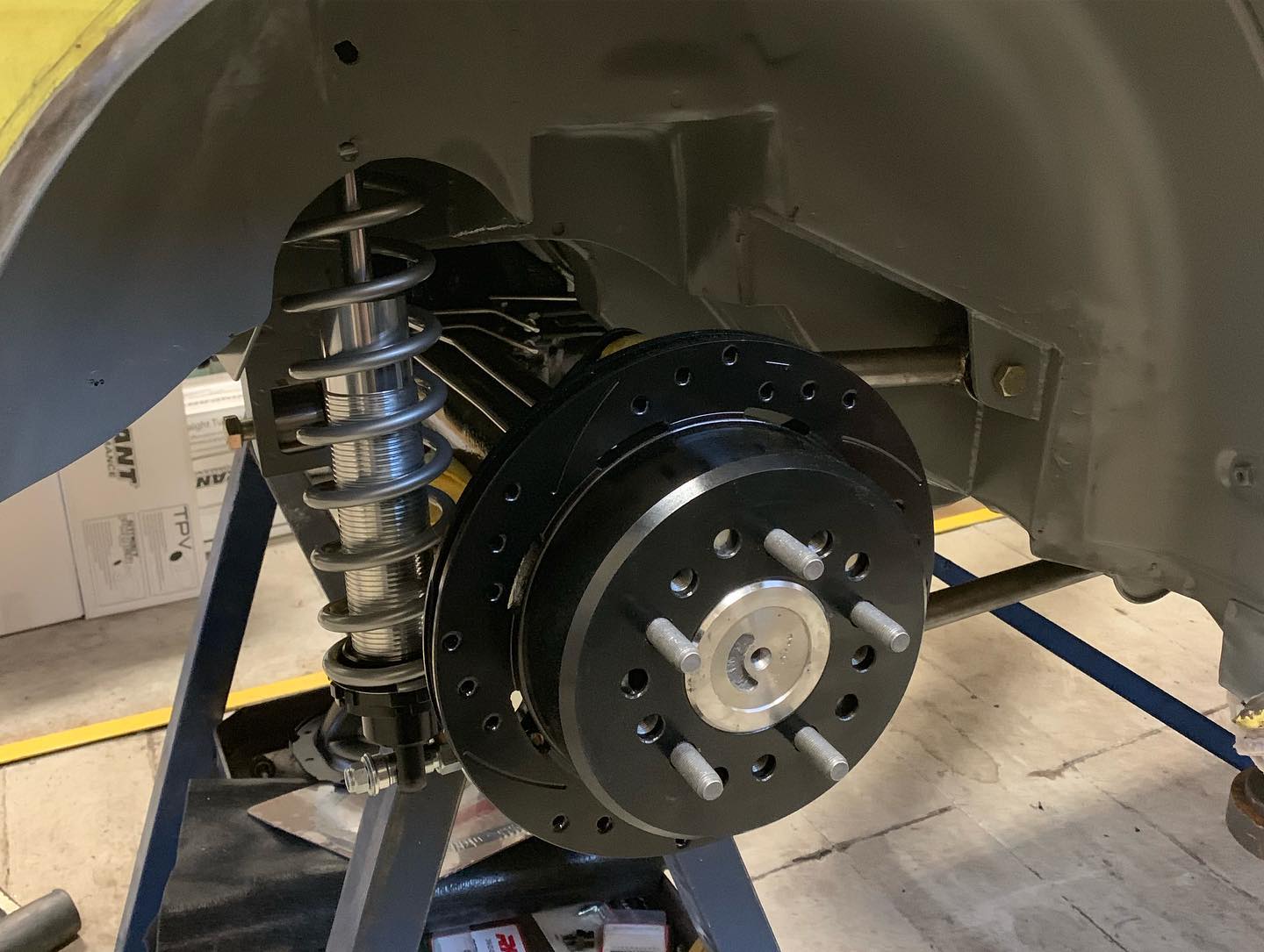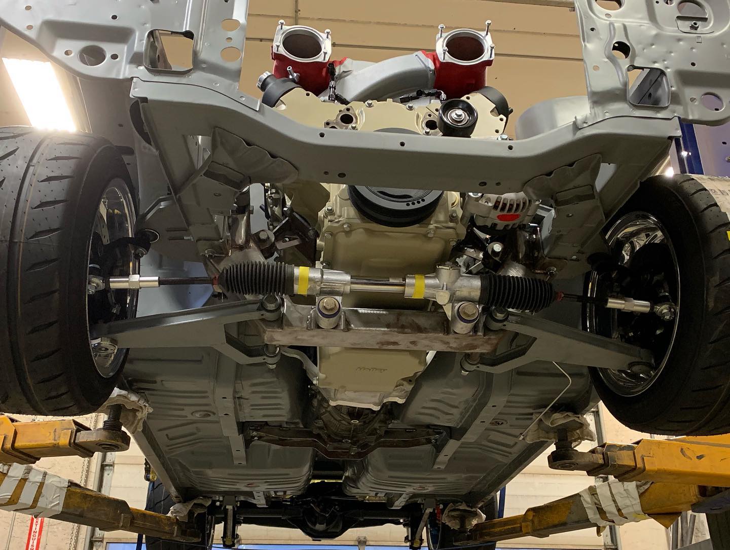 In order to get the engine in the car a new front suspension was designed around the factory mounting point of the original front crossmember. To do this the car was 3D scanned by ACL Designs, this gave the guys a computer model to work off of and virtually build the suspension with a 3D model of the engine in place helping speed up the build and see potential fitment concerns. The new design eliminated the struts and now features a double arm front suspension centered around a set of Wilwood Pro Spindles. The lower control arms have been engineered with a larger steering angle in mind for the drift car look the team was after. The front suspension also utilizes a custom length Flaming River manual rack and pinion unit and with a simple steering arm change the car could go from street driver to drift car with ease. For packaging purposes the upper control arm was designed to accept a set of QA1 High travel coil overs. For slowing down the car the is equipped with 11” Wilwood disc brakes with Forged 4 piston calipers powder coated in a custom accent colour which matches the engine.