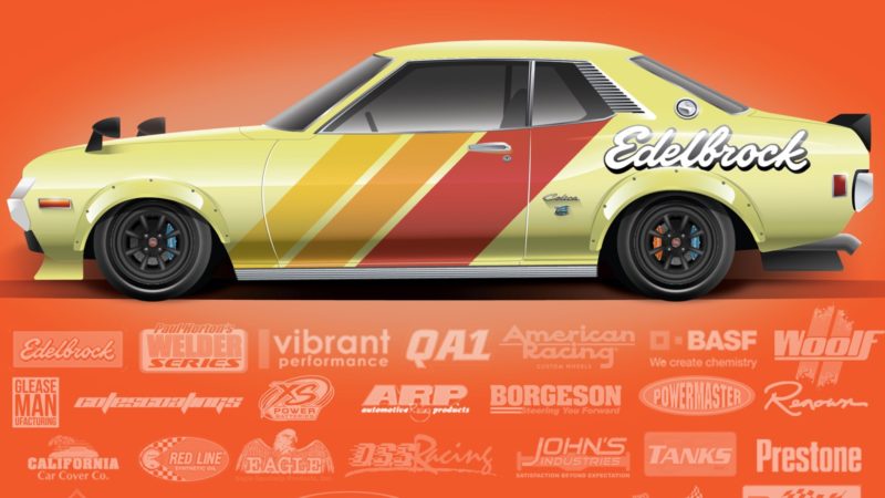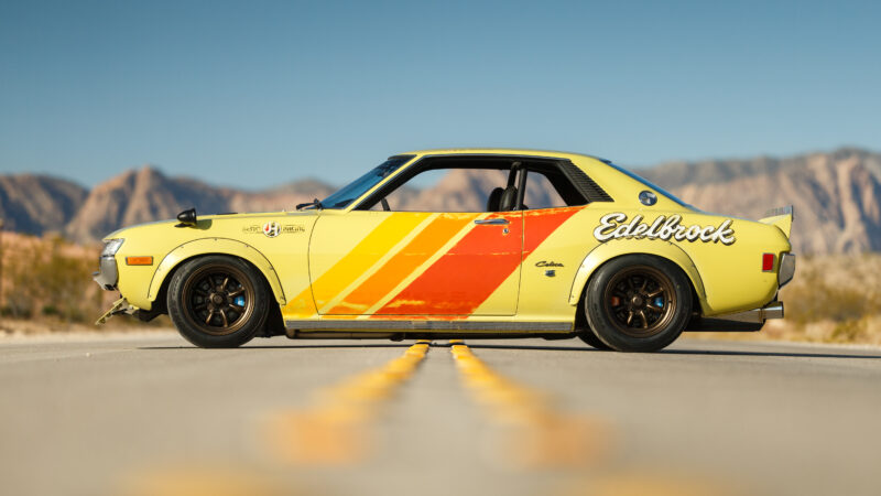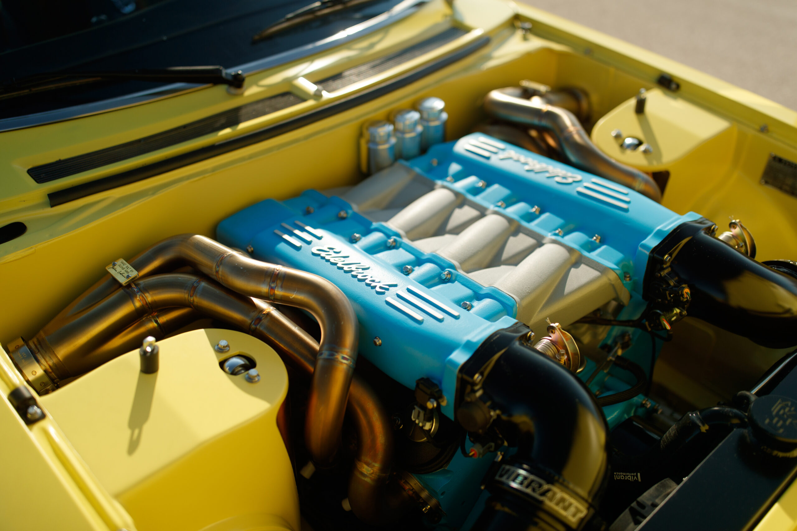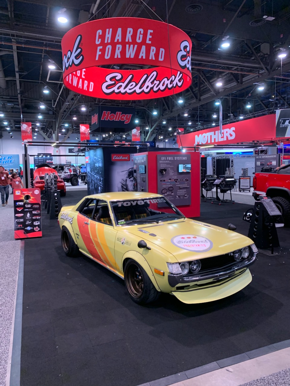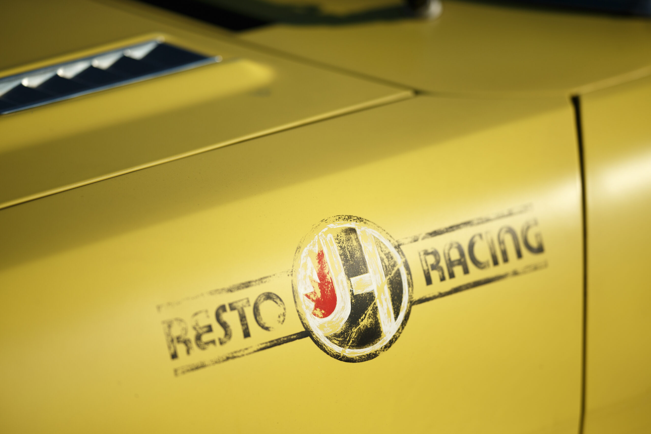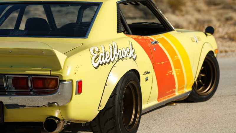 That’s not to say the interior has been overlooked, just the opposite is true. Keeping with the 1970's authenticity required, perfect textiles with the proper look and feel were chosen. When looking at the interior, starting at the dashboard you will find premium material from Relicate Leather and craftsmanship from the crew at JH Restorations and Vlad Nesic of Nesic Upholstery in Chatham, Ontario. The original dashboard has been leather wrapped and top stitched matching exterior accent colours. When the driver looks down he will be looking past a Alkantara Wrapped Renown Steering wheel and will be able to monitor the vitals and speed of the car through a set of custom Designed Dakota Digital gauges, built to mimic the originals but are updated with new electronics and give a little supercar flare. A yellow tachometer calls up visions of some modern day Ferraris. To the right of the steering wheel on top of the oversized transmission tunnel sits the Relay Shifter for grabbing gears and one more handle to the right is a Hydraulic handbrake with a hockey tape grip, a call out to being “Remade In Canada” the JH Restorations tagline, A fact that everyone at JH Restorations is extremely proud of. Both the shifter and handle are custom billet pieces from Bowler Performance Transmissions. The brake and clutch pedals in the car are a set of wilwood racing pedals fitted with Clayton machine works pedal pads with a matching accelerator pedal pulling on the twin throttle body cables from Lokar. The seating and door panels have also been updated by removing the old brown velour and cracked vinyl, and replacing it with black leather and a loud Westfalia Plaid pattern. Carpeting in the car is minimized by only lining only the floor areas with ACC Daytona Weave carpet, whereas the tunnel and inner rocker panels have been painted, color matched to the exterior of the car adding a distinct look to the interior. With the minimal amount of carpeting to deaden sound and heat intrusion, the crew utilized Dynamat in areas that are covered with carpet or firewall coverings and a spray on heat and sound barrier was applied to the underside of the floor. Behind the driver sits a roll bar that is bent up for this car and is powder coated in a wrinkle finish. The roll bar serves multiple purposes, for one it mounts the SeatBelt Planet 4 point harnesses. The bar also acts as a chassis stiffener tying the car together side to side and into the rear frame rails. Lastly it acts as impact protection in the event of an unfortunate track day mishap. On the outside much of the original paint on the body was left intact in order to retain its aged look. To protect the original paint, a coat of BASF Matte clear was applied to seal the surface and protect against further deterioration. The guys opted to install a set of metal fender flares in order to cover up the wide tires and give the car a more traditional JDM look. To add some flair to the car a retro style stripe package was chosen from several designs by Chris Benotto Designs and was hand painted on to the car by Matt at Brightworks Auto Art. The stripe package includes a Retro Toyota Door stripe, Fender logos featuring the a vintage looking JH Logo, roof panel name plates and Canadian flag for Owner/Driver, Kevin and of course retro styled ¼ panel and hood logos featuring the original 1970 Edelbrock logo which was used to honor the placement of the vehicle in their 2019 SEMA booth. Also featured on the car with discrete clear vinyl are all the other partners JH and Kevin worked with on the build. To add to the racecar look and feel on the outside of the car, it is fitted with a new chin spoiler, rear diffuser and deck lid spoiler with a clear plexiglass extension, rounding out that look is a set of Retro Mini Light style American Racing Silverstone Wheels wrapped in DOT competition Toyo R888R Tires Designed for high performance and track days.