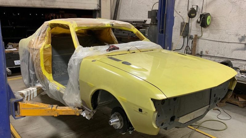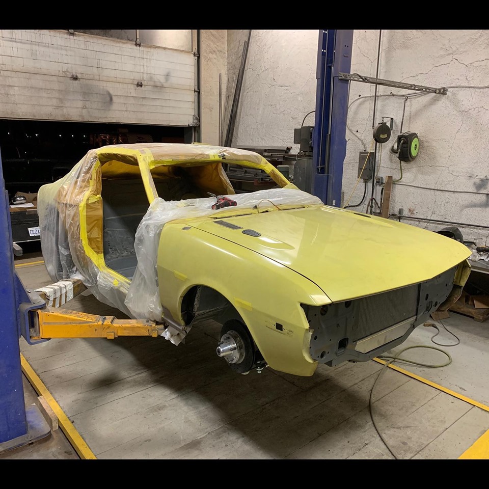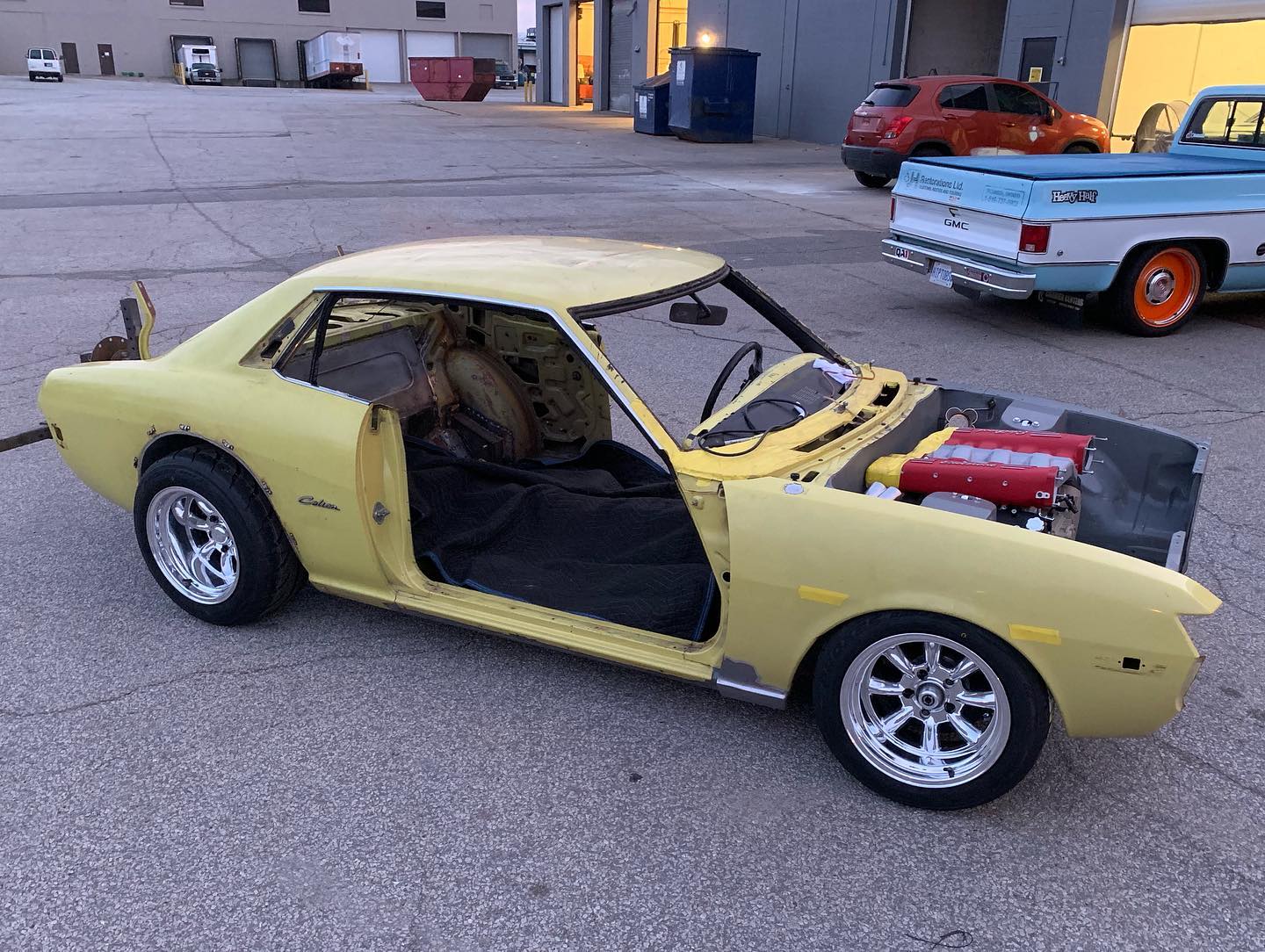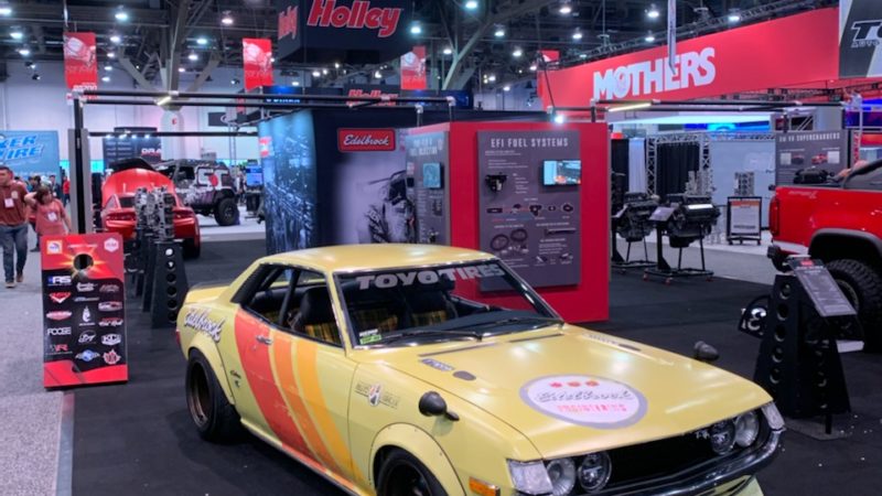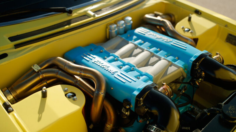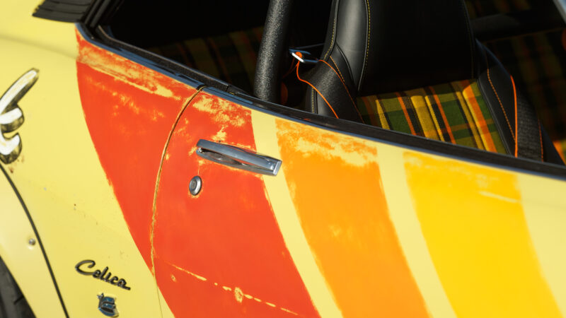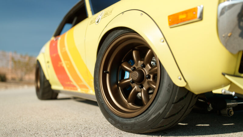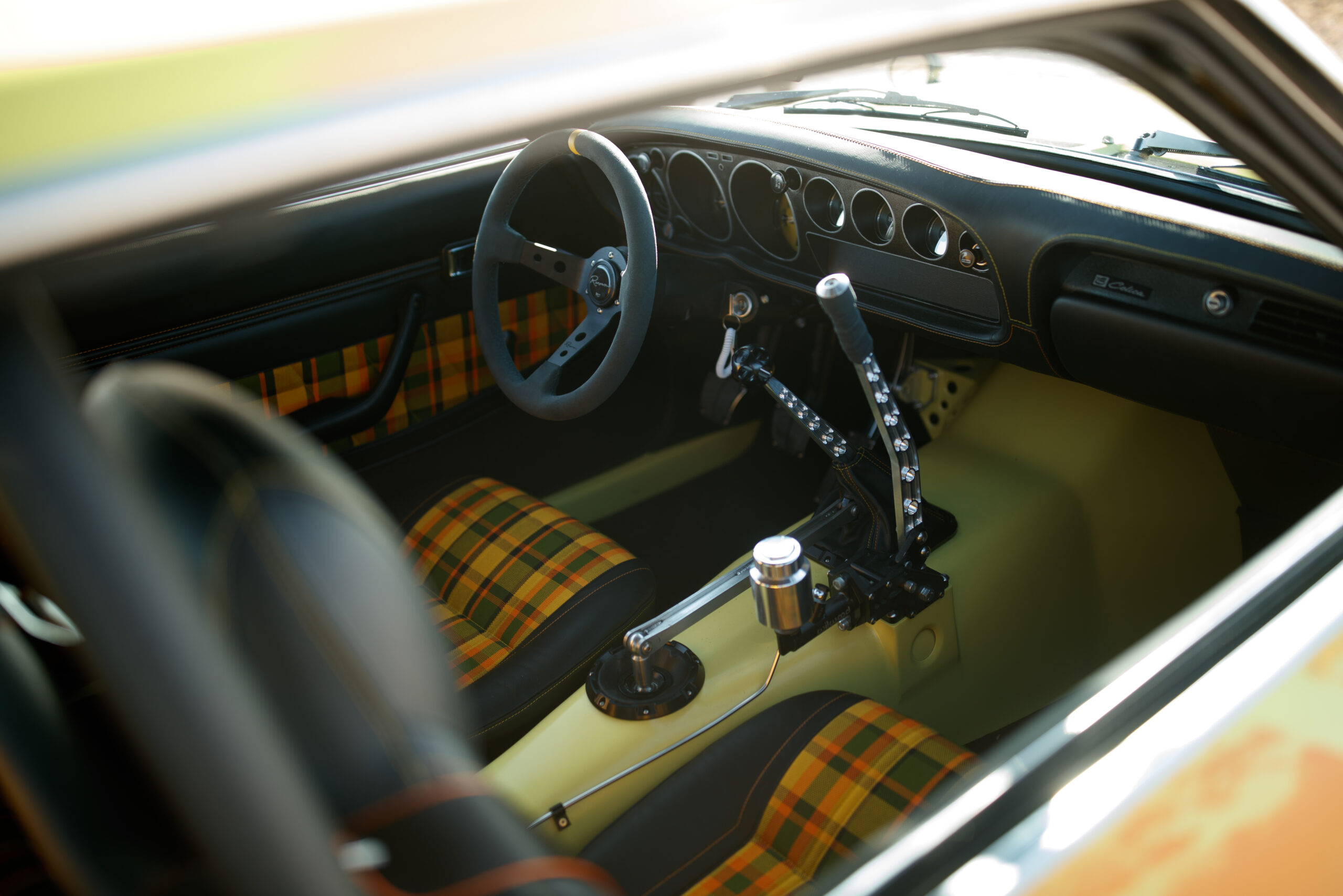 That’s not to say the interior has been overlooked, just the opposite is true. Keeping with the 1970's authenticity required, perfect textiles with the proper look and feel were chosen. When looking at the interior, starting at the dashboard you will find premium material from Relicate Leather and craftsmanship from the crew at JH Restorations and Vlad Nesic of Nesic Upholstery in Chatham, Ontario. The original dashboard has been leather wrapped and top stitched matching exterior accent colours. When the driver looks down he will be looking past a Alkantara Wrapped Renown Steering wheel and will be able to monitor the vitals and speed of the car through a set of custom Designed Dakota Digital gauges, built to mimic the originals but are updated with new electronics and give a little supercar flare. A yellow tachometer calls up visions of some modern day Ferraris. To the right of the steering wheel on top of the oversized transmission tunnel sits the Relay Shifter for grabbing gears and one more handle to the right is a Hydraulic handbrake with a hockey tape grip, a call out to being “Remade In Canada” the JH Restorations tagline, A fact that everyone at JH Restorations is extremely proud of. Both the shifter and handle are custom billet pieces from Bowler Performance Transmissions. The brake and clutch pedals in the car are a set of wilwood racing pedals fitted with Clayton machine works pedal pads with a matching accelerator pedal pulling on the twin throttle body cables from Lokar. The seating and door panels have also been updated by removing the old brown velour and cracked vinyl, and replacing it with black leather and a loud Westfalia Plaid pattern. Carpeting in the car is minimized by only lining only the floor areas with ACC Daytona Weave carpet, whereas the tunnel and inner rocker panels have been painted, color matched to the exterior of the car adding a distinct look to the interior. With the minimal amount of carpeting to deaden sound and heat intrusion, the crew utilized Dynamat in areas that are covered with carpet or firewall coverings and a spray on heat and sound barrier was applied to the underside of the floor. Behind the driver sits a roll bar that is bent up for this car and is powder coated in a wrinkle finish. The roll bar serves multiple purposes, for one it mounts the SeatBelt Planet 4 point harnesses. The bar also acts as a chassis stiffener tying the car together side to side and into the rear frame rails. Lastly it acts as impact protection in the event of an unfortunate track day mishap. On the outside much of the original paint on the body was left intact in order to retain its aged look. To protect the original paint, a coat of BASF Matte clear was applied to seal the surface and protect against further deterioration. The guys opted to install a set of metal fender flares in order to cover up the wide tires and give the car a more traditional JDM look. To add some flair to the car a retro style stripe package was chosen from several designs by Chris Benotto Designs and was hand painted on to the car by Matt at Brightworks Auto Art. The stripe package includes a Retro Toyota Door stripe, Fender logos featuring the a vintage looking JH Logo, roof panel name plates and Canadian flag for Owner/Driver, Kevin and of course retro styled ¼ panel and hood logos featuring the original 1970 Edelbrock logo which was used to honor the placement of the vehicle in their 2019 SEMA booth. Also featured on the car with discrete clear vinyl are all the other partners JH and Kevin worked with on the build. To add to the racecar look and feel on the outside of the car, it is fitted with a new chin spoiler, rear diffuser and deck lid spoiler with a clear plexiglass extension, rounding out that look is a set of Retro Mini Light style American Racing Silverstone Wheels wrapped in DOT competition Toyo R888R Tires Designed for high performance and track days.