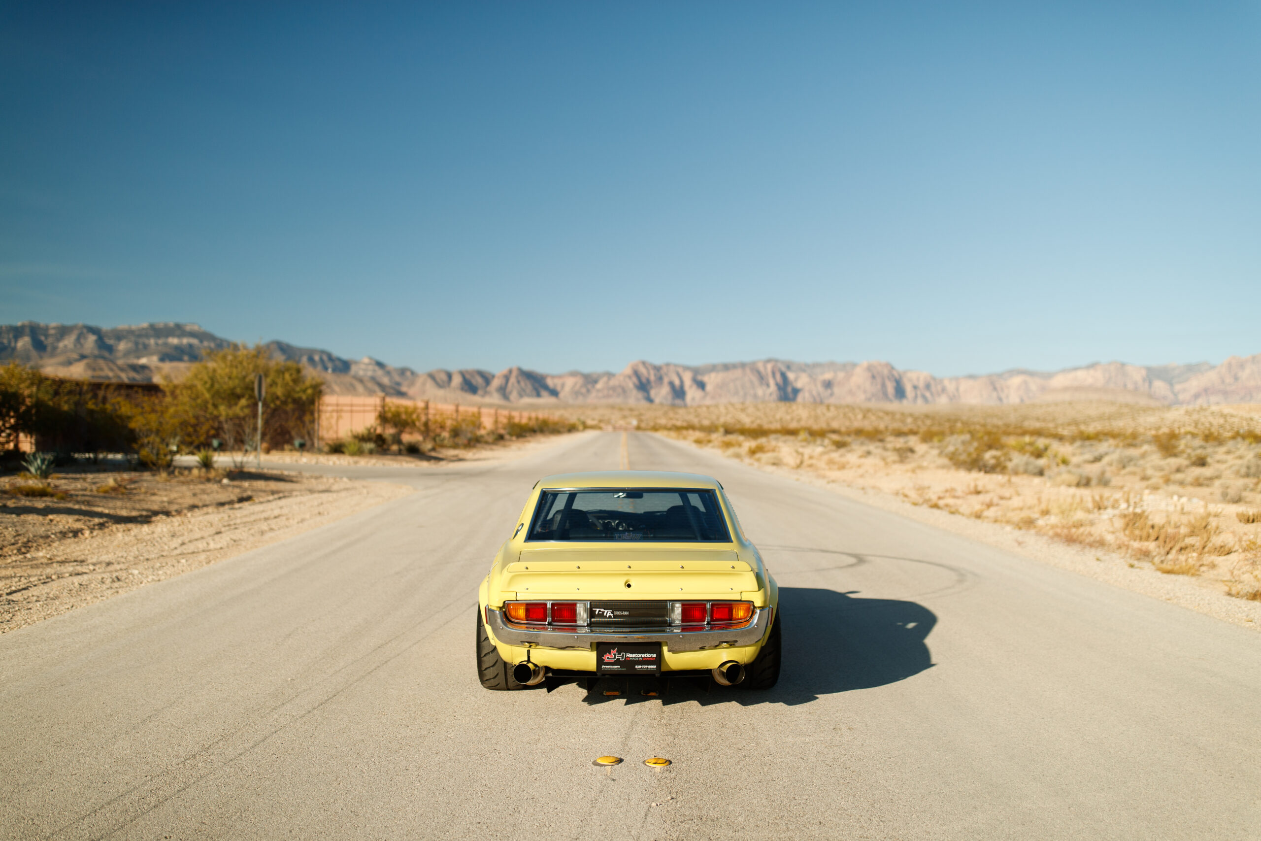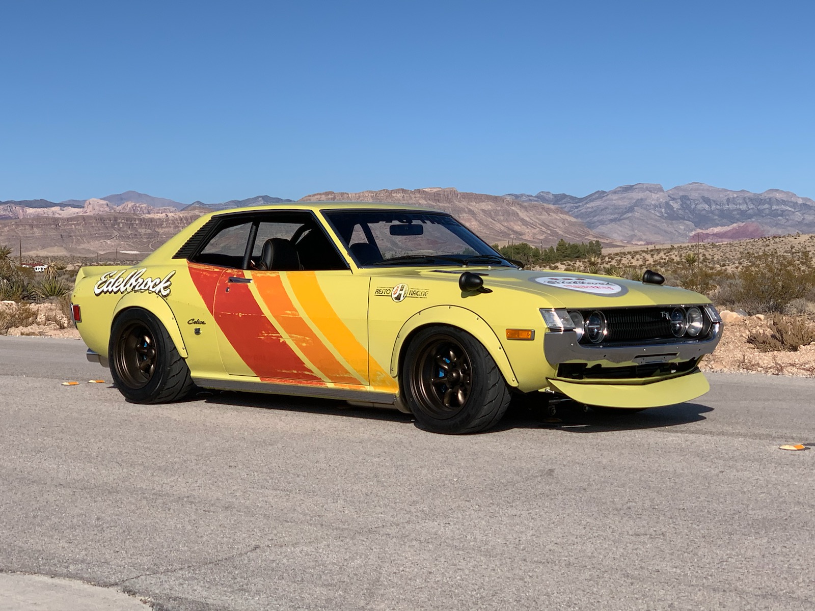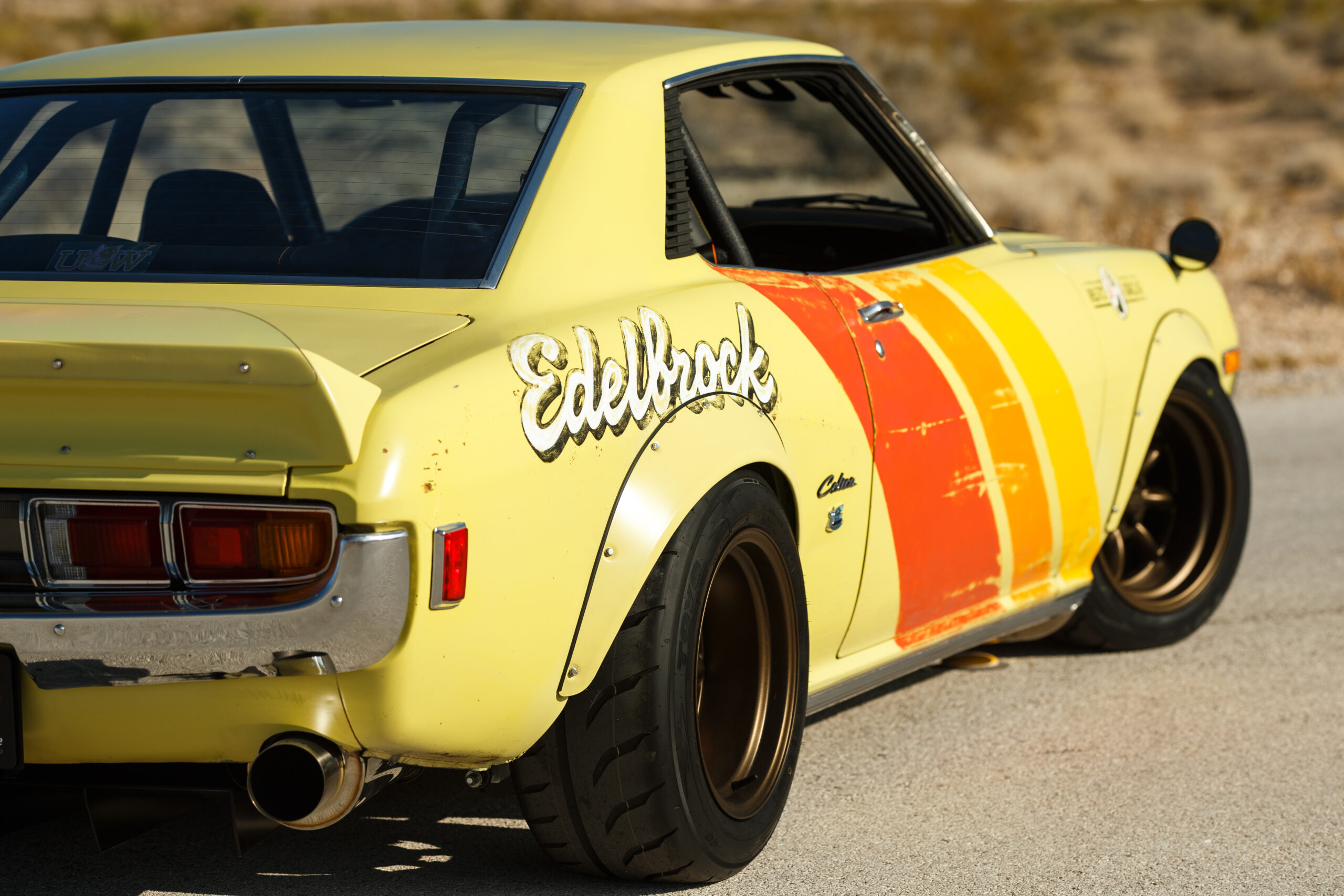 The idea behind this 73' Celica was to build a "What-if" car, "What if Toyota went Trans-Am in the 70's?" Nicknamed the Toyko Trans Am or TTA, it would be built like it would have been built in decades past, then forgotten about, left in a barn to one day be brought back to life, but with the handling and power of the modern era. To achieve this the entire suspension was removed and re-engineered, in house, to work in conjunction with a modern power plant in the form of a 5.7L Chevrolet LS engine mated to a CD009 Transmission originally fitted to a Nissan 370Z with a Ford 8.8 out back. With a 6th gear ratio of .794 and a 23.1” tall tire this is not going to be your typical street driver, the car revs high and comes out of the hole like a scared rabbit, and with its stiff clutch it's not for the faint of heart.