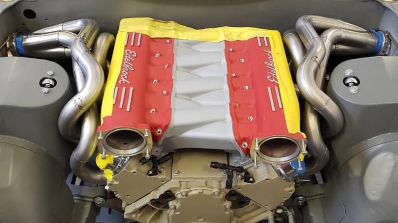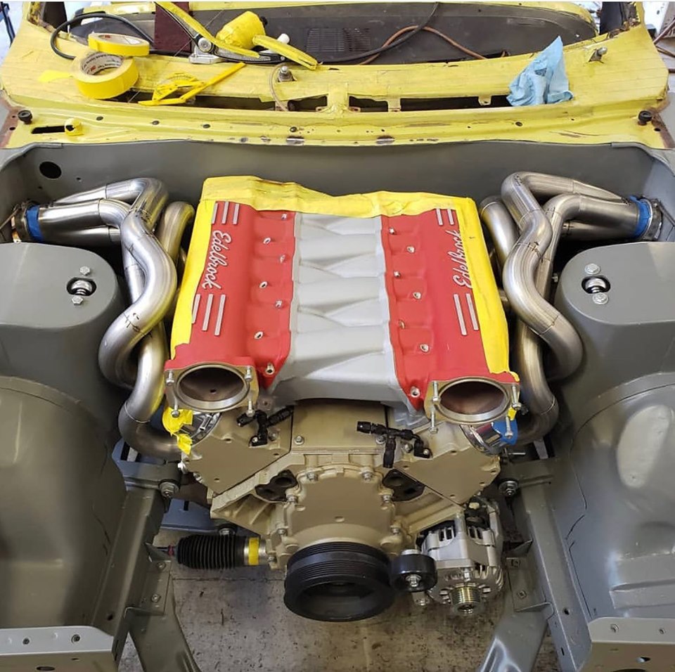 The power plant of this project started out as a 5.3L Saab 9-7x LS-based engine which was bored and honed to a 5.7L. The rotating assembly utilizes a stock LS crank but has Eagle connecting rods and DSS Racing pistons hung on it. On top of the new larger bored block sits a set of Edelbrock E-CNC LS3 style Cylinder heads designed for the small bore engine. To open and close the valves an Edelbrock Rollin’ Thunder .631 lift camshaft was utilized in the block. Next in line the guys opted to use the Edelbrock Cross ram intake and dual 90 mm throttle bodies along with a Pro flow 4 Fuel injection unit to handle the task of the fuel and spark events. Holding the entire mill together is a set of ARP fasteners which include everything from the critical main and head bolts to the fine detail 12 Point stainless finishing hardware. A custom set of stainless steel exhaust headers were built by John Gleason from Glease Manufacturing and utilize a set of ultimate header investment cast flanges. The gasses of the engine expel through a full 2.5” stainless exhaust system. Keeping the engine cool the guys at JH called John from Dewitts Radiator to fabricate a radiator of their own design to flow the prestone coolant, the radiator utilizes a 2.5” thick aluminum core, with as much cooling capacity that could feasibly fit in the tight confines between the grill and engine, as well as the hood and factory frame rails. Attached to that radiator are 2, 12” high performance electric cooling fans from GC cooling, which pull the heat from the engine with ease.