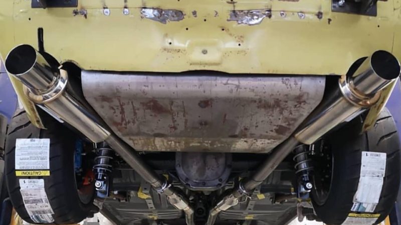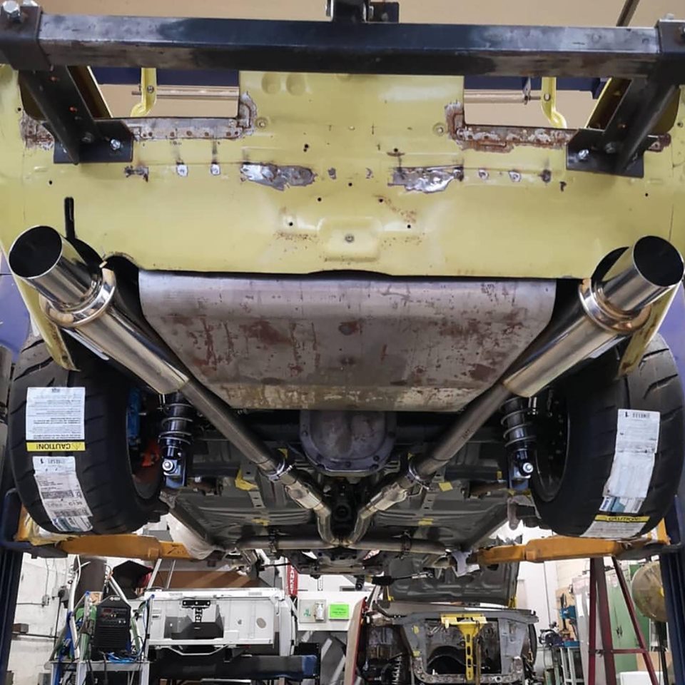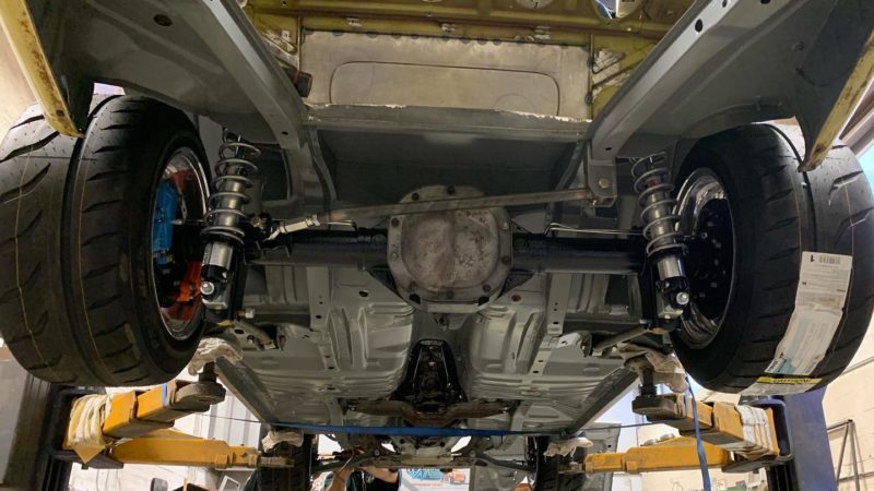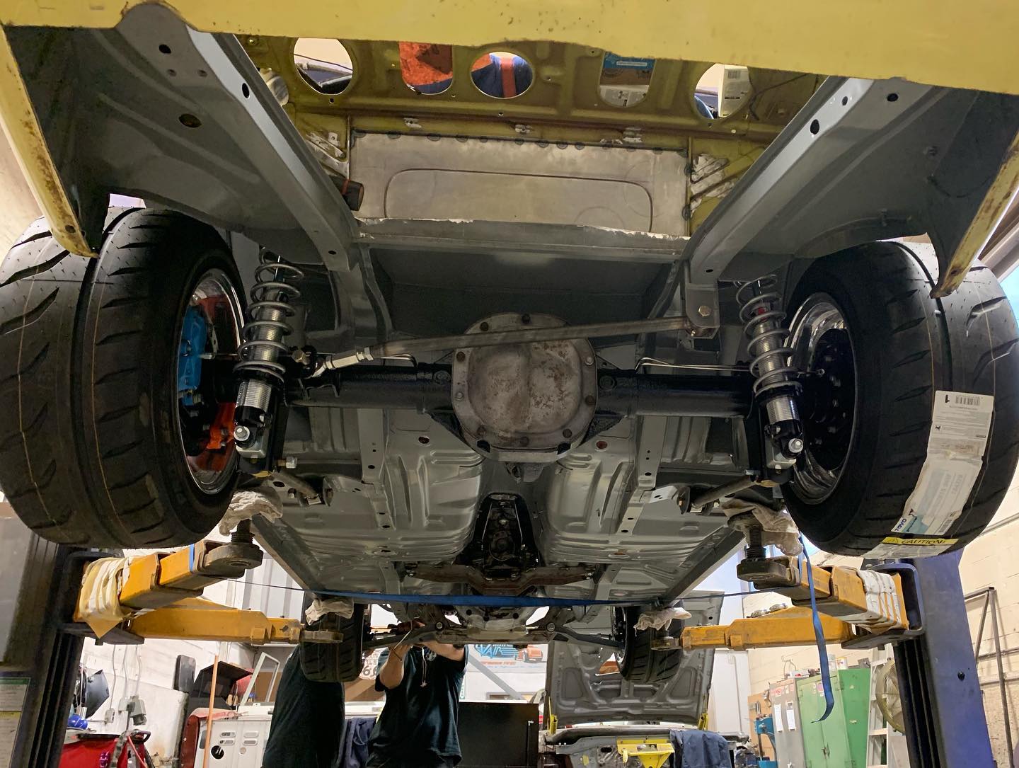 In the back the original suspension was also removed in favor of a Ford 8.8 posi rear axle with 3.73 gears, which originally called a Ford Explorer home. A custom Parallel 4 link was designed around its new axle and 2 of the original suspension points. In order to maximize strength and clearance for other vital components like the larger trunk mounted fuel tank and exhaust, a complete redesign was required. A set of Custom colored Wilwood calipers are also fitted to the narrowed rear axle and handle traditional braking as well as a set connected to a locking hydraulic handbrake mounted in the cabin.