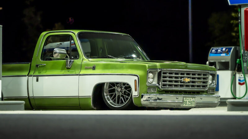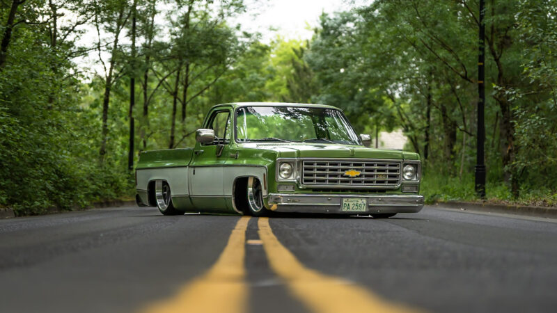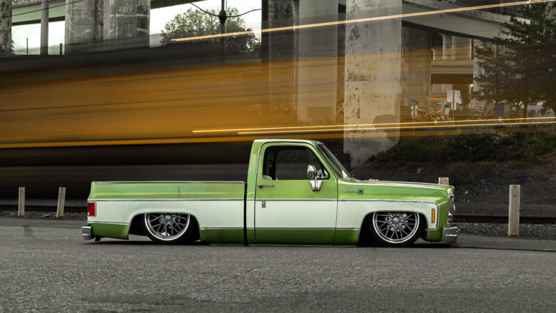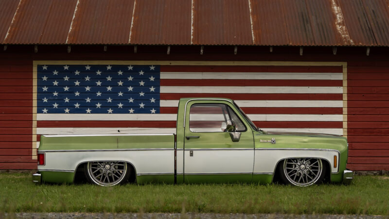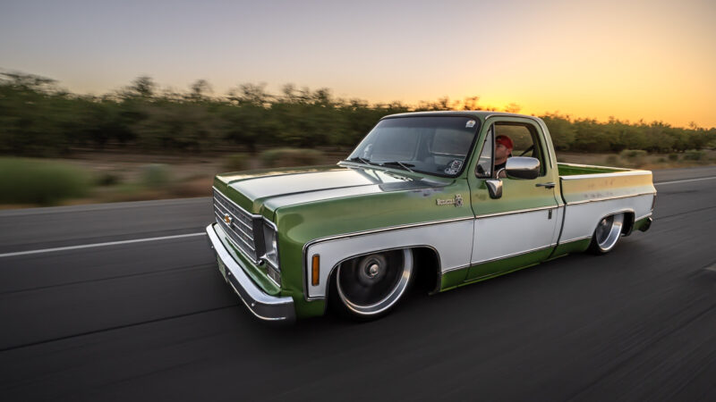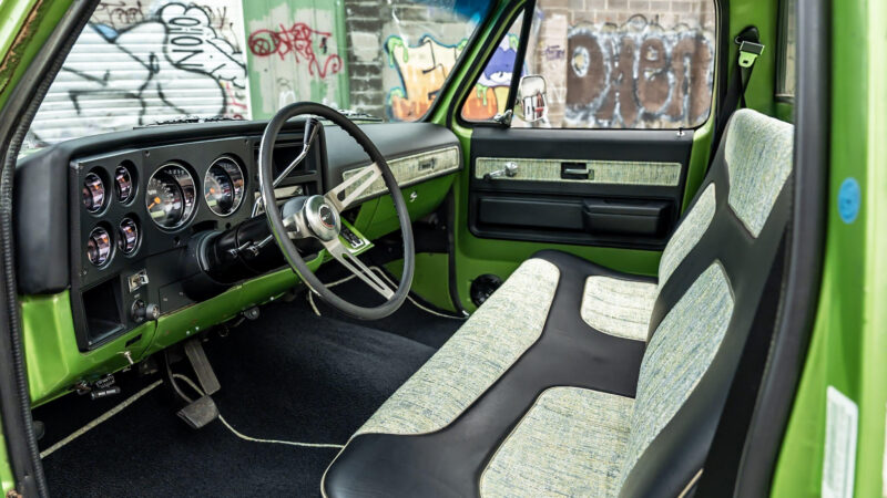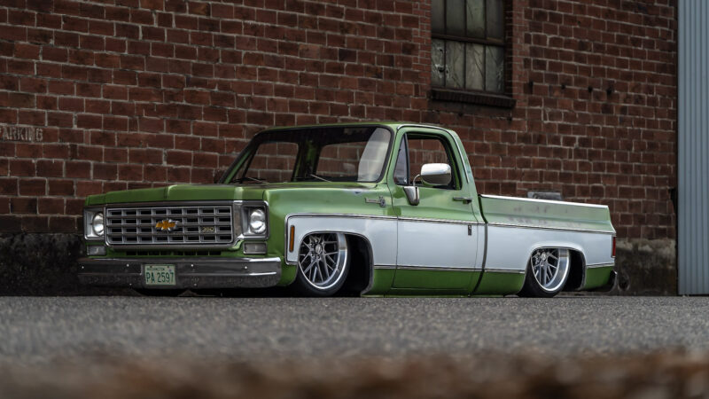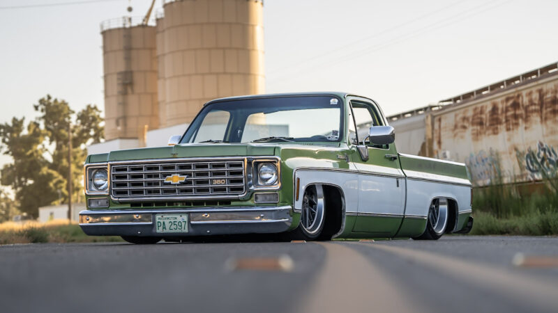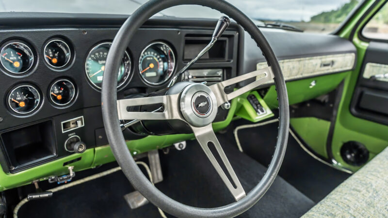 Like most people, my passion for Squarebodies began at a fairly young age. Fast forward 30 years and a few Squarebodies later, I bought my 1976 C10 Bonanza in June of 2022 with every intention of giving it a 5/7 drop and cruising with my sons. After speaking with a friend and local chassis shop owner, we all agreed the truck needed to be bagged, quickly spiraling into what it is today. With the help of Nick Muros at Choice Chassis, the truck was built rather quickly with the right group of people helping out. The truck sits on a Choppin Block Extreme chassis, with Accuair suspension, riding on 22” Corsart Kingpins. The truck is powered by a 5.3L LM7 LS engine, built by EFI solutions. The interior came together with the help of Phil Cato at Cato’s Custom Upholstery, along with Dakota Digital Squarebody Syndicate Series gauges and a Squarebody Syndicate shortened steering column. The bed floor was taken from a long bed, cut down and bolted back into the original shortbed and getting a fresh coat of BASF-Limco Spring Green paint. The truck was built on a crazy amount of overtime and was eventually named “Time N’ Half” by Ronnie Wetch.