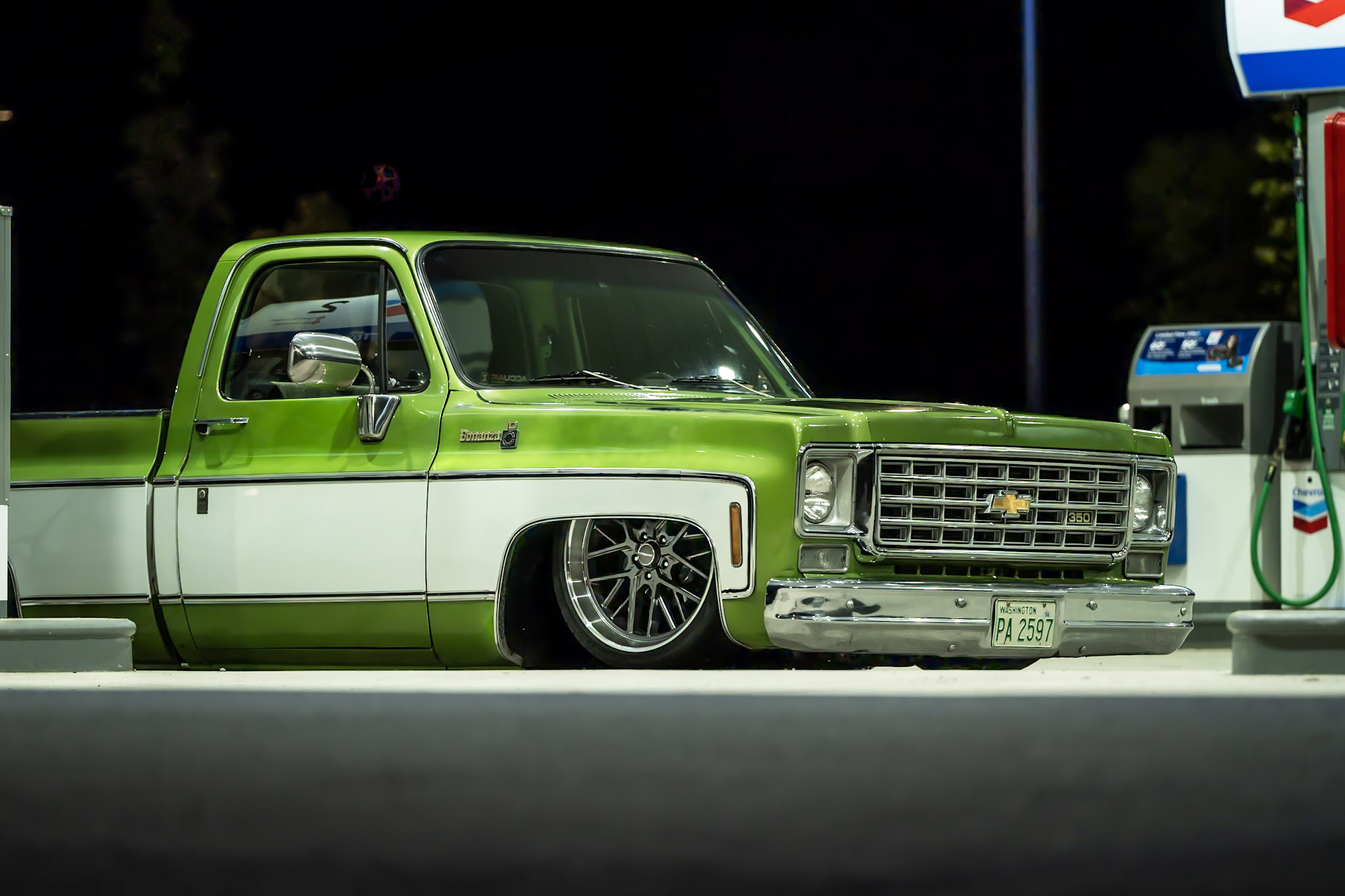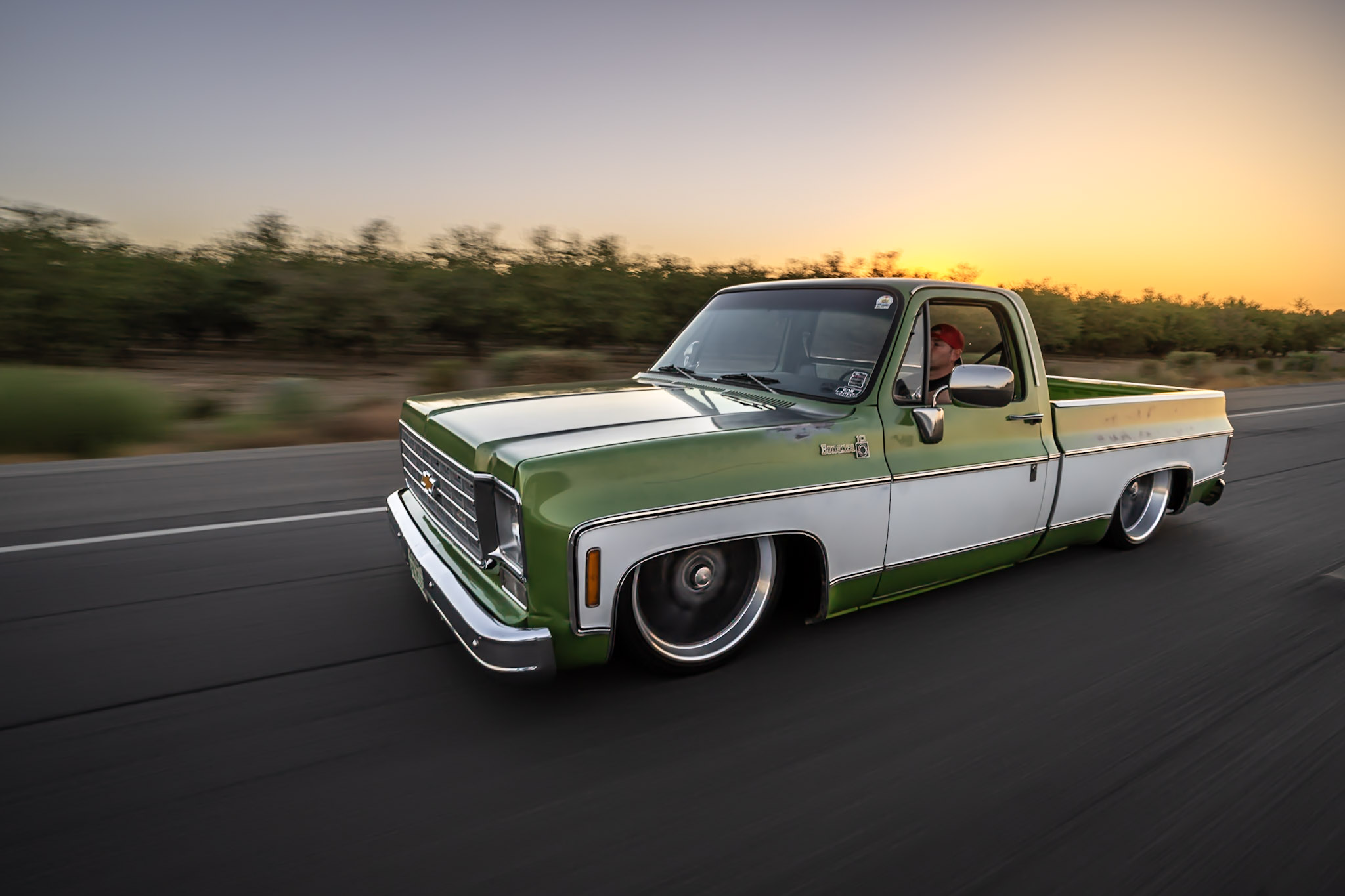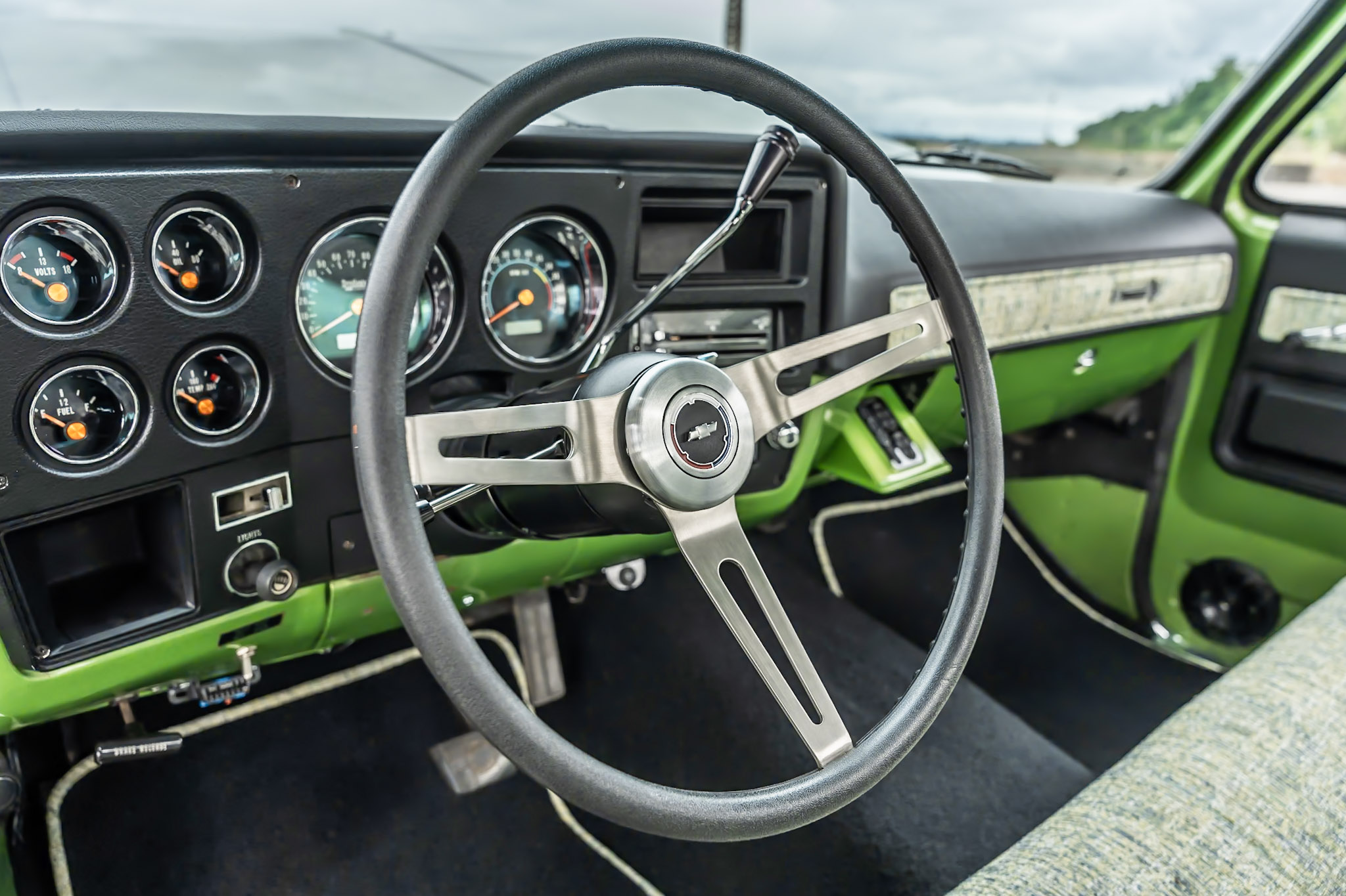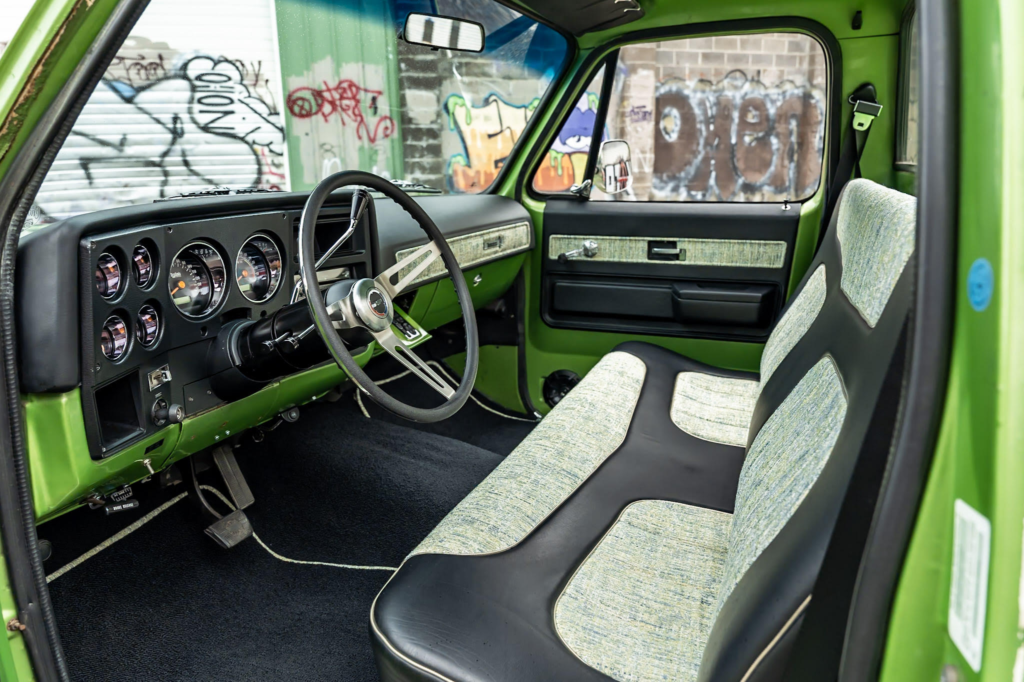 Like most people, my passion for Squarebodies began at a fairly young age. Fast forward 30 years and a few Squarebodies later, I bought my 1976 C10 Bonanza in June of 2022 with every intention of giving it a 5/7 drop and cruising with my sons. After speaking with a friend and local chassis shop owner, we all agreed the truck needed to be bagged, quickly spiraling into what it is today. With the help of Nick Muros at Choice Chassis, the truck was built rather quickly with the right group of people helping out. The truck sits on a Choppin Block Extreme chassis, with Accuair suspension, riding on 22” Corsart Kingpins. The truck is powered by a 5.3L LM7 LS engine, built by EFI solutions. The interior came together with the help of Phil Cato at Cato’s Custom Upholstery, along with Dakota Digital Squarebody Syndicate Series gauges and a Squarebody Syndicate shortened steering column. The bed floor was taken from a long bed, cut down and bolted back into the original shortbed and getting a fresh coat of BASF-Limco Spring Green paint. The truck was built on a crazy amount of overtime and was eventually named “Time N’ Half” by Ronnie Wetch.
