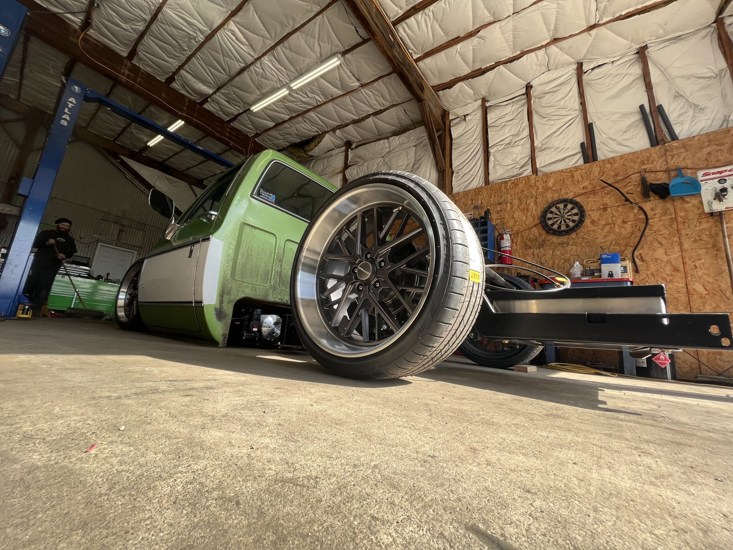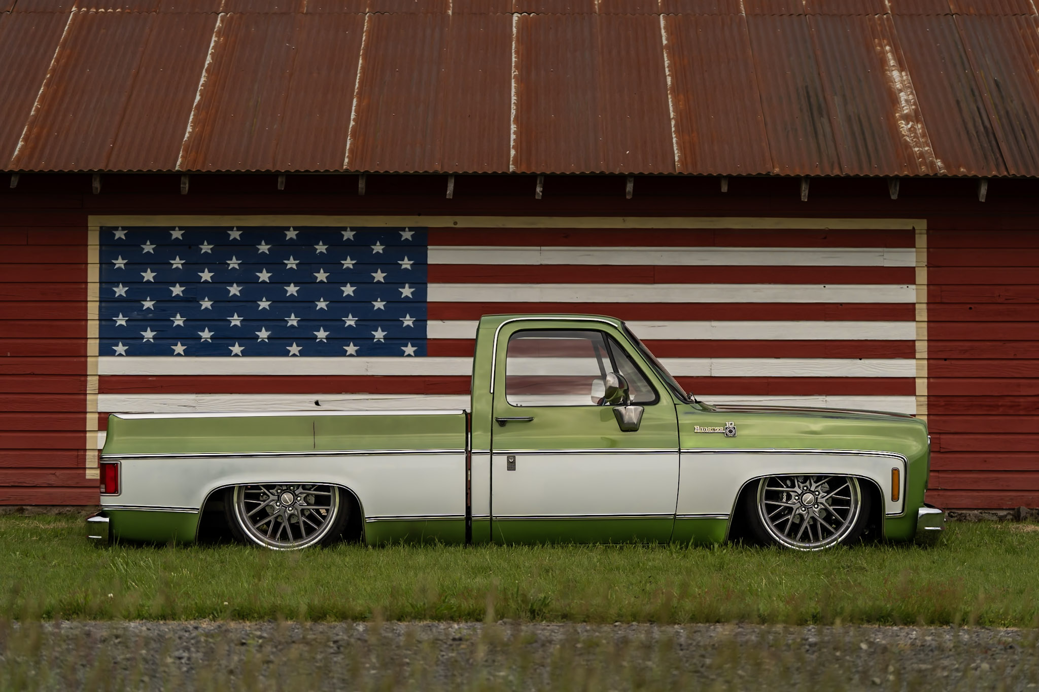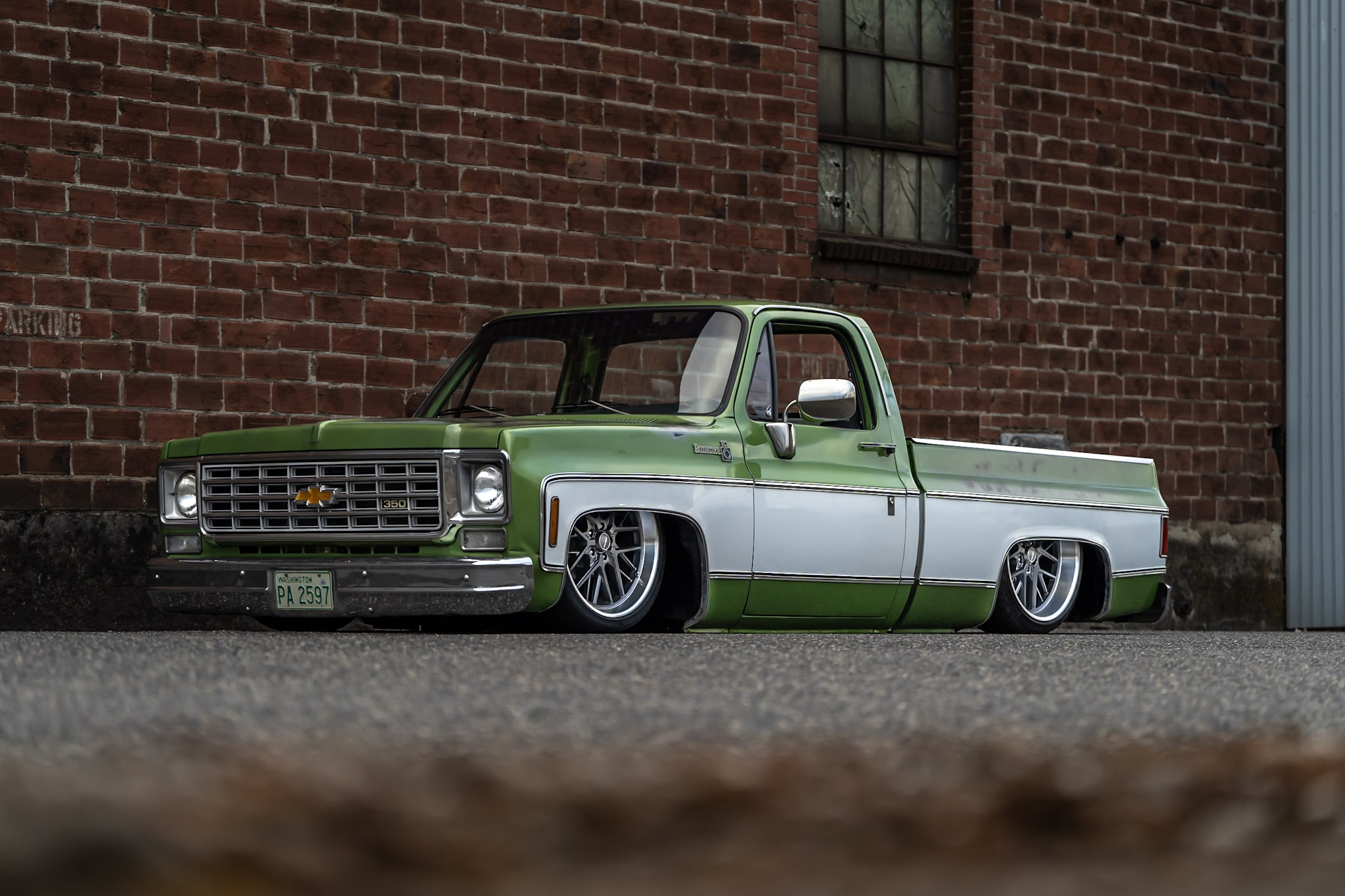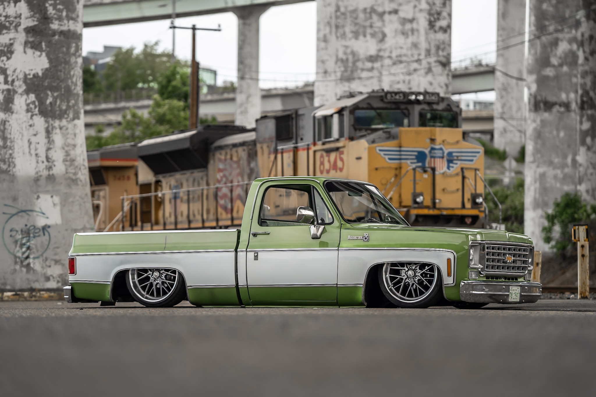Like most people, my passion for Squarebodies began at a fairly young age. Fast forward 30 years and a few Squarebodies later, I bought my 1976 C10 Bonanza in June of 2022 with every intention of giving it a 5/7 drop and cruising with my sons. After speaking with a friend and local chassis shop owner, we all agreed the truck needed to be bagged, quickly spiraling into what it is today. With the help of Nick Muros at Choice Chassis, the truck was built rather quickly with the right group of people helping out. The truck sits on a Choppin Block Extreme chassis, with Accuair suspension, riding on 22” Corsart Kingpins. The truck is powered by a 5.3L LM7 LS engine, built by EFI solutions. The interior came together with the help of Phil Cato at Cato’s Custom Upholstery, along with Dakota Digital Squarebody Syndicate Series gauges and a Squarebody Syndicate shortened steering column. The bed floor was taken from a long bed, cut down and bolted back into the original shortbed and getting a fresh coat of BASF-Limco Spring Green paint. The truck was built on a crazy amount of overtime and was eventually named “Time N’ Half” by Ronnie Wetch.
