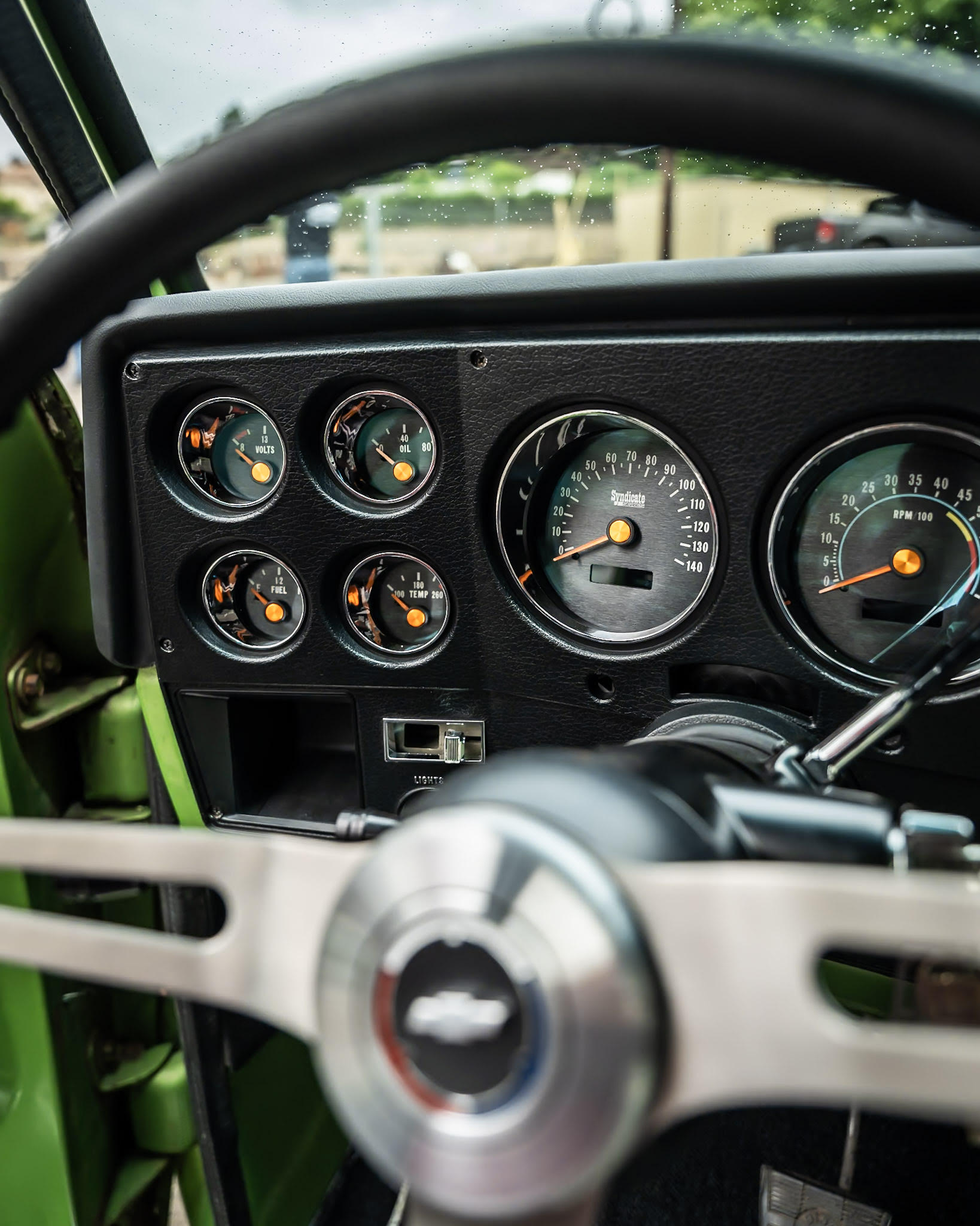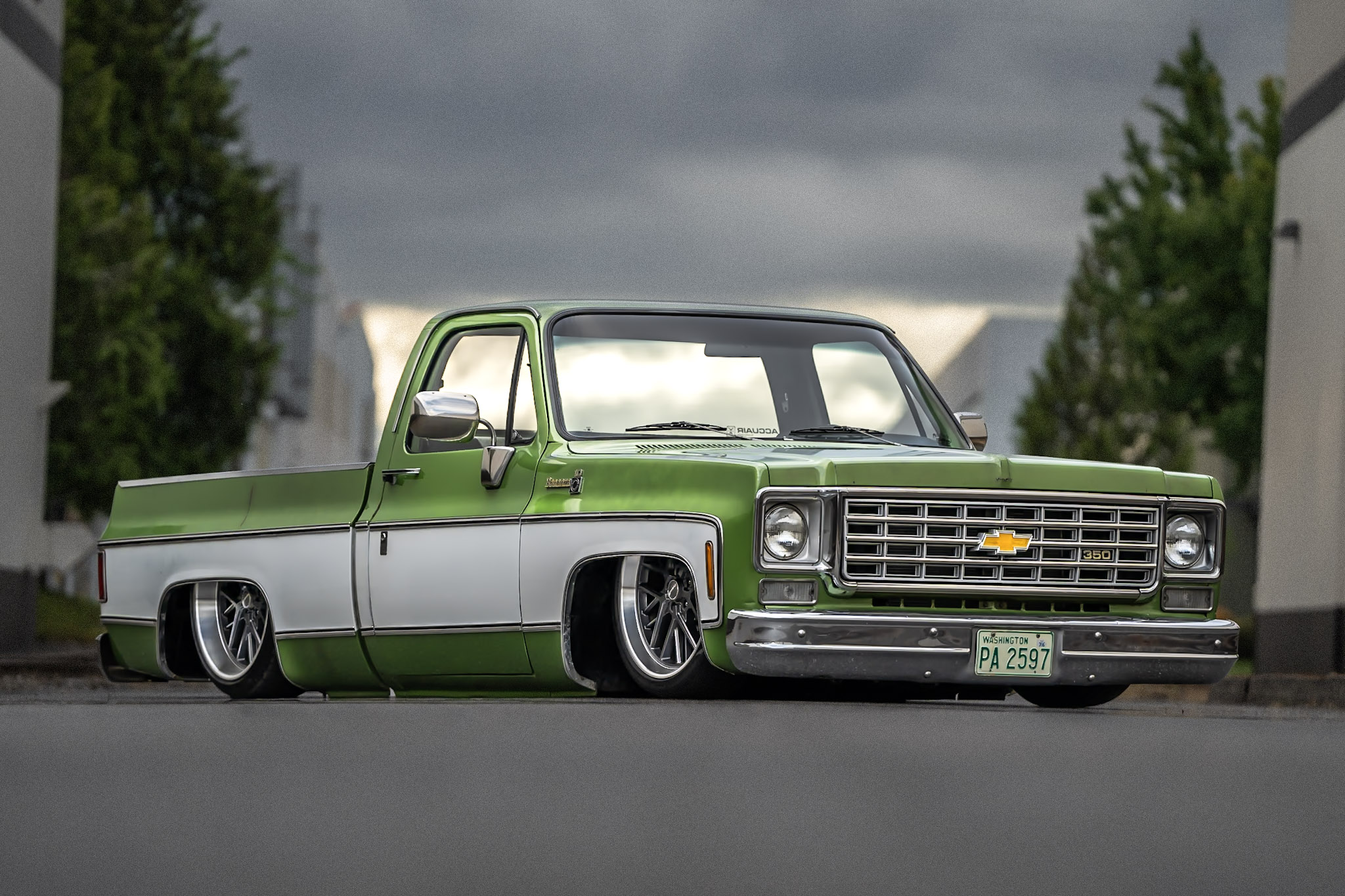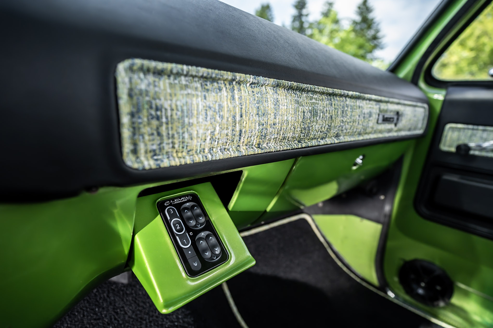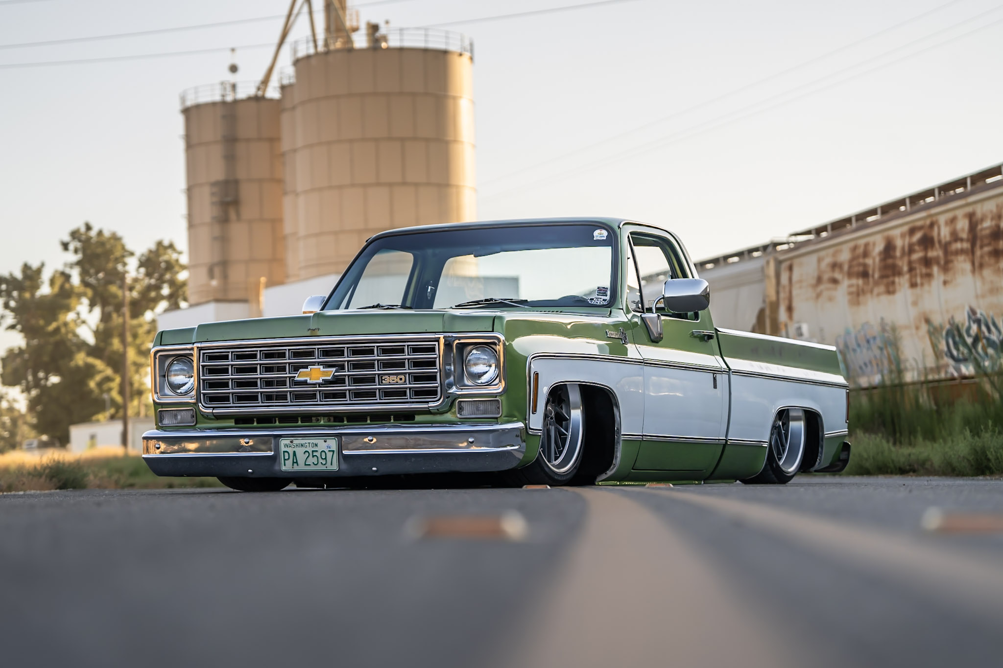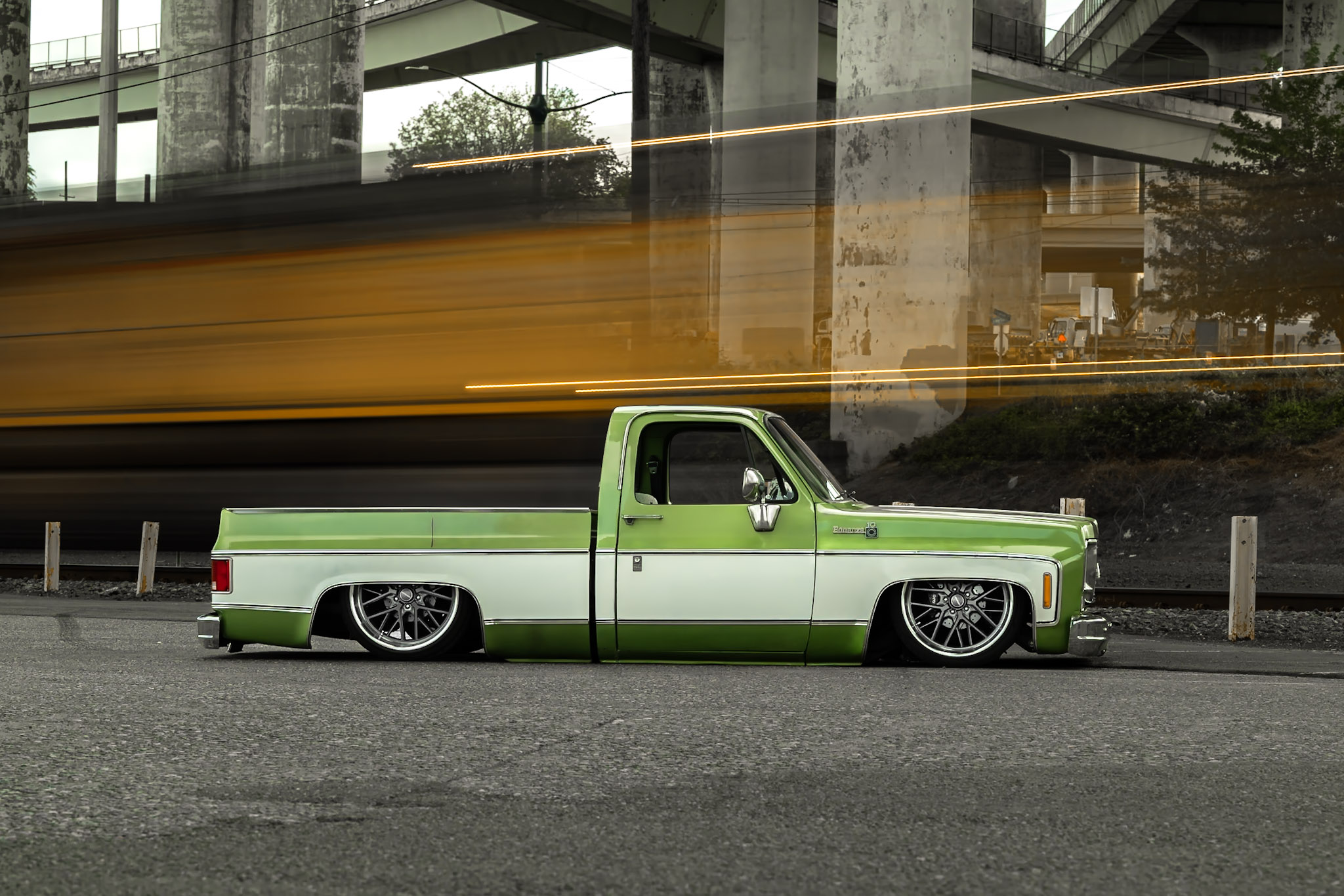 Like most people, my passion for Squarebodies began at a fairly young age. Fast forward 30 years and a few Squarebodies later, I bought my 1976 C10 Bonanza in June of 2022 with every intention of giving it a 5/7 drop and cruising with my sons. After speaking with a friend and local chassis shop owner, we all agreed the truck needed to be bagged, quickly spiraling into what it is today. With the help of Nick Muros at Choice Chassis, the truck was built rather quickly with the right group of people helping out. The truck sits on a Choppin Block Extreme chassis, with Accuair suspension, riding on 22” Corsart Kingpins. The truck is powered by a 5.3L LM7 LS engine, built by EFI solutions. The interior came together with the help of Phil Cato at Cato’s Custom Upholstery, along with Dakota Digital Squarebody Syndicate Series gauges and a Squarebody Syndicate shortened steering column. The bed floor was taken from a long bed, cut down and bolted back into the original shortbed and getting a fresh coat of BASF-Limco Spring Green paint. The truck was built on a crazy amount of overtime and was eventually named “Time N’ Half” by Ronnie Wetch.