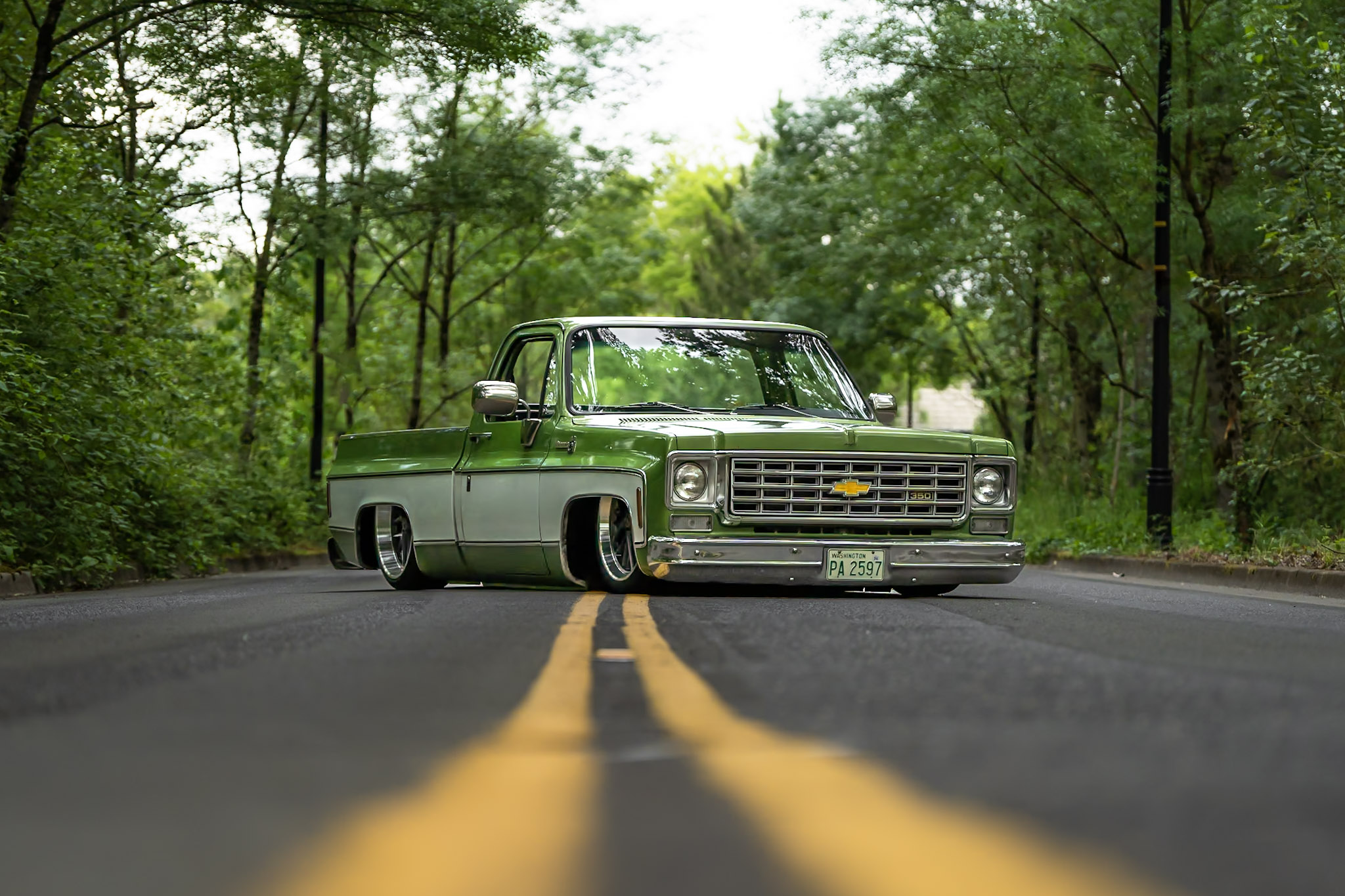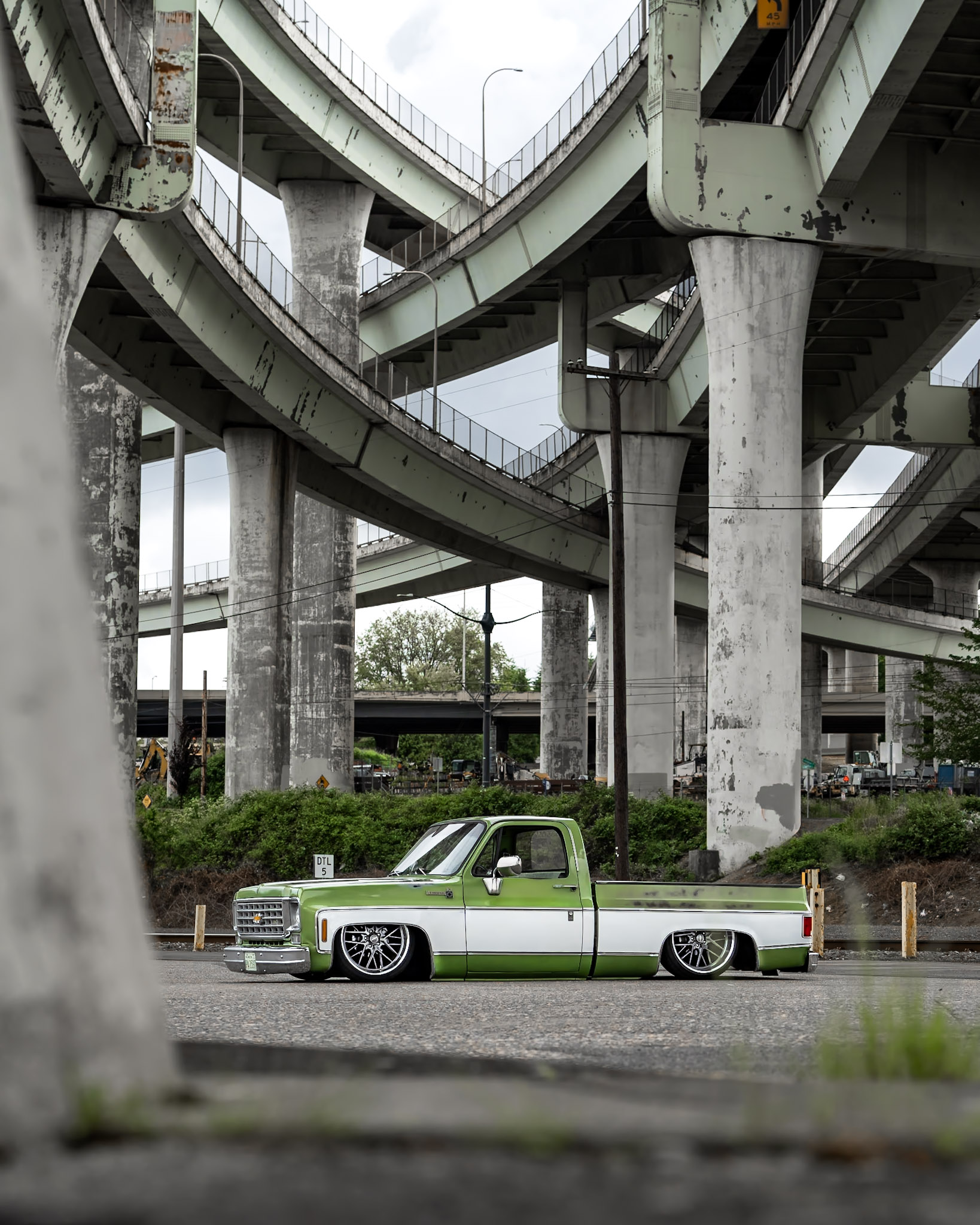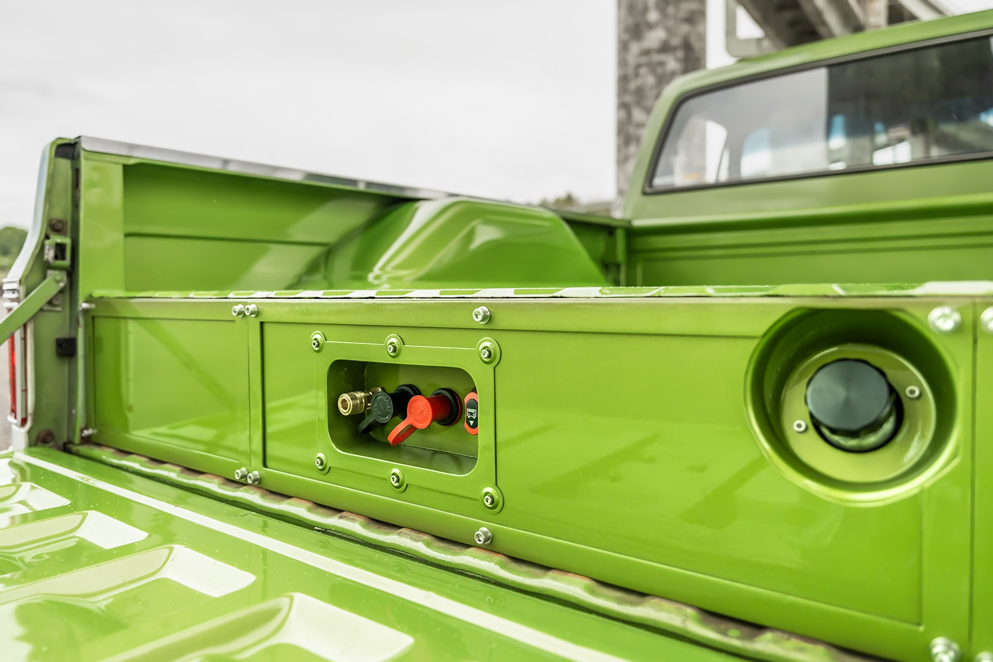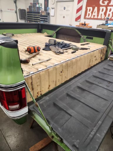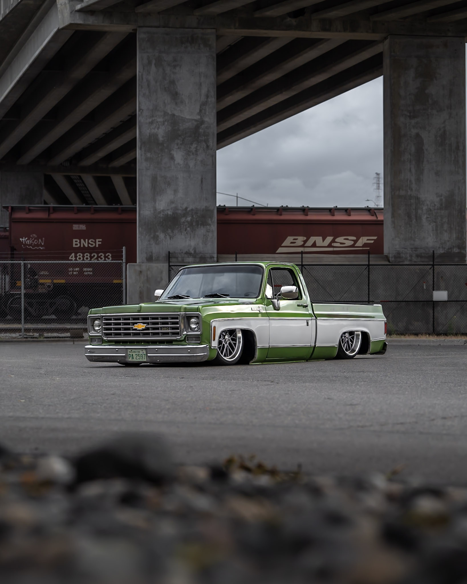 Like most people, my passion for Squarebodies began at a fairly young age. Fast forward 30 years and a few Squarebodies later, I bought my 1976 C10 Bonanza in June of 2022 with every intention of giving it a 5/7 drop and cruising with my sons. After speaking with a friend and local chassis shop owner, we all agreed the truck needed to be bagged, quickly spiraling into what it is today. With the help of Nick Muros at Choice Chassis, the truck was built rather quickly with the right group of people helping out. The truck sits on a Choppin Block Extreme chassis, with Accuair suspension, riding on 22” Corsart Kingpins. The truck is powered by a 5.3L LM7 LS engine, built by EFI solutions. The interior came together with the help of Phil Cato at Cato’s Custom Upholstery, along with Dakota Digital Squarebody Syndicate Series gauges and a Squarebody Syndicate shortened steering column. The bed floor was taken from a long bed, cut down and bolted back into the original shortbed and getting a fresh coat of BASF-Limco Spring Green paint. The truck was built on a crazy amount of overtime and was eventually named “Time N’ Half” by Ronnie Wetch.