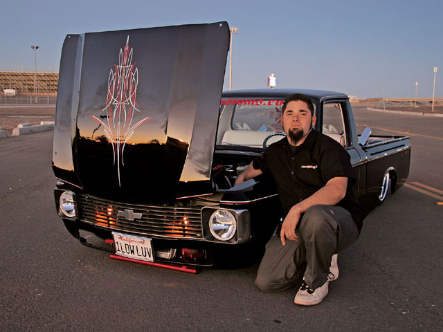 CHASSIS MODS: Suspension type = AIR. Front suspension: Z'd and narrowed Toyota front clip. Rear suspension: A custom designed triangulated four-link by Needfulthingz. Airbag/cylinder type & size: (Front) 2500 Conitech, (Rear) 2600 Conitech. Control arms: Custom A-arms with S-10 ball joints. Shocks: Toxic. Valves: Chrome 1/2" AirLifts. Compressors: Dual Air Zenith. Air line: Parker 1/2" stainless steel lines. Frame material: 3 X 3" 1/4" thick stock floor, 3 x 2" 1/4"thick back half. Gas Tank: Custom built 15 gal. aluminum fuel cell Stafford Fabrications. Brakes: Toyota up front & Ford 9" in the rear and a 85' Chevy Sprint booster. Detail Work: Powder coated frame. Misc: Chevy LUV body over a Toyota frame. Performed by Lukasz Granicy of Lancaster, Ca. BODY MODS: Shaved: Fender markers, door handles, key locks, cab vents, bed seams by taillights, bed hooks, tailgate logo, bed markers, antenna, cowl vents, wiper holes, stock mirrors, emblems, tailgate latches. Body dropped:Body dropped past the rocker. Front end: 72'Chevy LUV valance, 80' Chevy LUV headlights, 2 1/2" cowl. Back end: shaved tailgate. Exterior bolt-ons: Hot Rod mirrors. Performed by Lukasz Granicy of Lancaster, Ca. PAINT: Brand & Colors: PPG Black and three coats of Clear. Style: Old Skool. Pinstriping: Bob Coslett. Performed by: Dave Little from Little Designs. INTERIOR: Seats: Toyota bench seat cut down 3" with headrests removed. Material: White leather. Dash: 57' Chevy truck dash narrowed with relocated gauge cluster. Door panels: Wrapped old skool style all white with red piping. Flooring: Red carpeting. Gauges: Dakota Digital. ENGINE PERFORMANCE: Displacement: 2.6L. Model/Year: 1989 Toyota 4 cylinders. Head Type: LC Engineering, port & polished. Camshaft: LC Engineering. Supercharger: Eaton M-62 w/ 18 lbs. of boost. Transmission: 95' Toyota 5-speed. Intake: Custom by Stafford Fabrication. Header/exhaust: Stafford Fabrication. Ignition: MSD. Rearend type: Ford 9" by Currie. Battery: Optima Red Top custom mounted in the frame. Inner fenders: Custom designed floating rear fenders by Needfulthingz Hot Rod Shop.