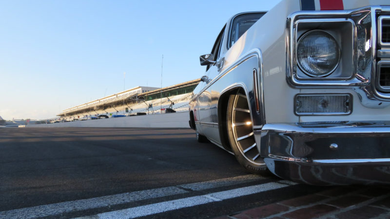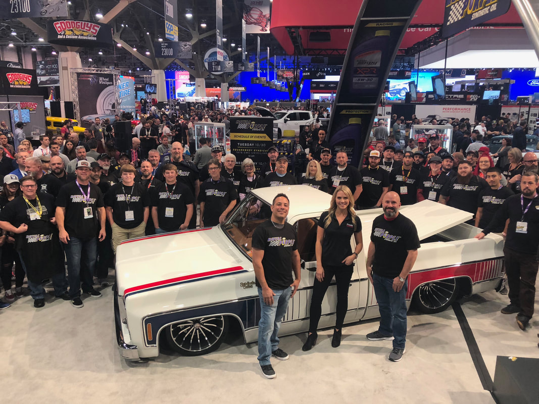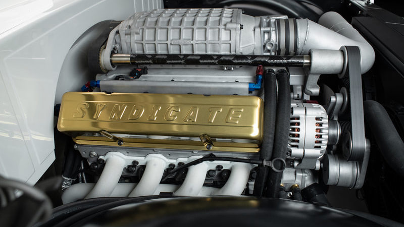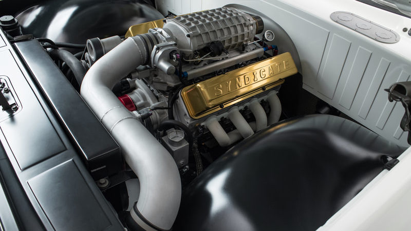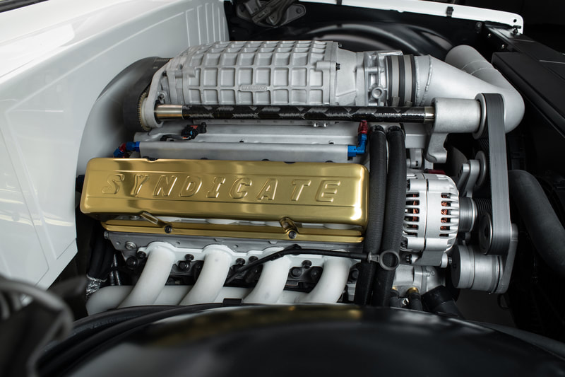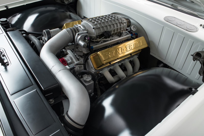 Charles Hendrickson, at Pro Dyno in Chandler, Arizona, took care of all the internals including a custom camshaft. To match the finish of the engine, a one-off set of Drive Junky accessory pulleys were media blasted, then blasted again, and again, with different grits until they finally had the exact look needed to dress the front of the engine. Up top, the LS was dressed with blue and red anodized hose fittings coming in and out of the Holley fuel system, a raw Magnuson Supercharger sixth generation TVS2300 and a set of gold anodized Syndicate Series billet valve covers from G.S.I. to finish it off. Rob began tucking away the Painless Performance wire harness underneath the Jet-Hot white coated Hooker Headers while the engine sat cradled in its final home with plenty of room thanks to the Holley oil pan. And lastly, a Frostbite Radiator, cooling fans, topped off with Prestone anti-freeze, keep everything cool. To handle the power, Joe turned to American Powertrain to send out a 2018 Tremec Magnum 6-speed manual transmission with a White Lightning shifter, Hydramax hydraulic clutch kit and PST 3.5 inch driveshaft. Rob and Dave Melian installed a Hays Dragon Claw clutch and Quick Time bell housing to finish off the raw, finished transmission easily capable of taking the abuse Joe intends to inflict. A custom built MagnaFlow 3-inch stainless steel exhaust fabricated by Hubcaps Hotrod and Custom, follows along the driveshaft to the Narrowed Currie Enterprises 9-inch rear end and aluminum 3rd member. Syndicate Series by Baer Brakes Pro + 14-inch rotors and calipers were utilized to stop the one-off set of Syndicate Series turbine style wheels commissioned to Curtis Speed. Joe decided on 20x9s in the front and 20x11s in the rear to allow room to “bring back the bulge” in tires he had envisioned since the beginning of the build. The front 12-inch wide Michelin Pilot Sport tires with 2-inch sidewalls and rear 14-inch tires, with 3-inch sidewalls, did just the trick to mimic that 70’s fat tire look we all remember. The wheels where also powder coated to a crinkle finish by Kevin at Pacific Powder Coating. An E-Stopp electronic parking brake system was also installed.