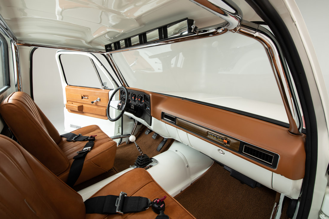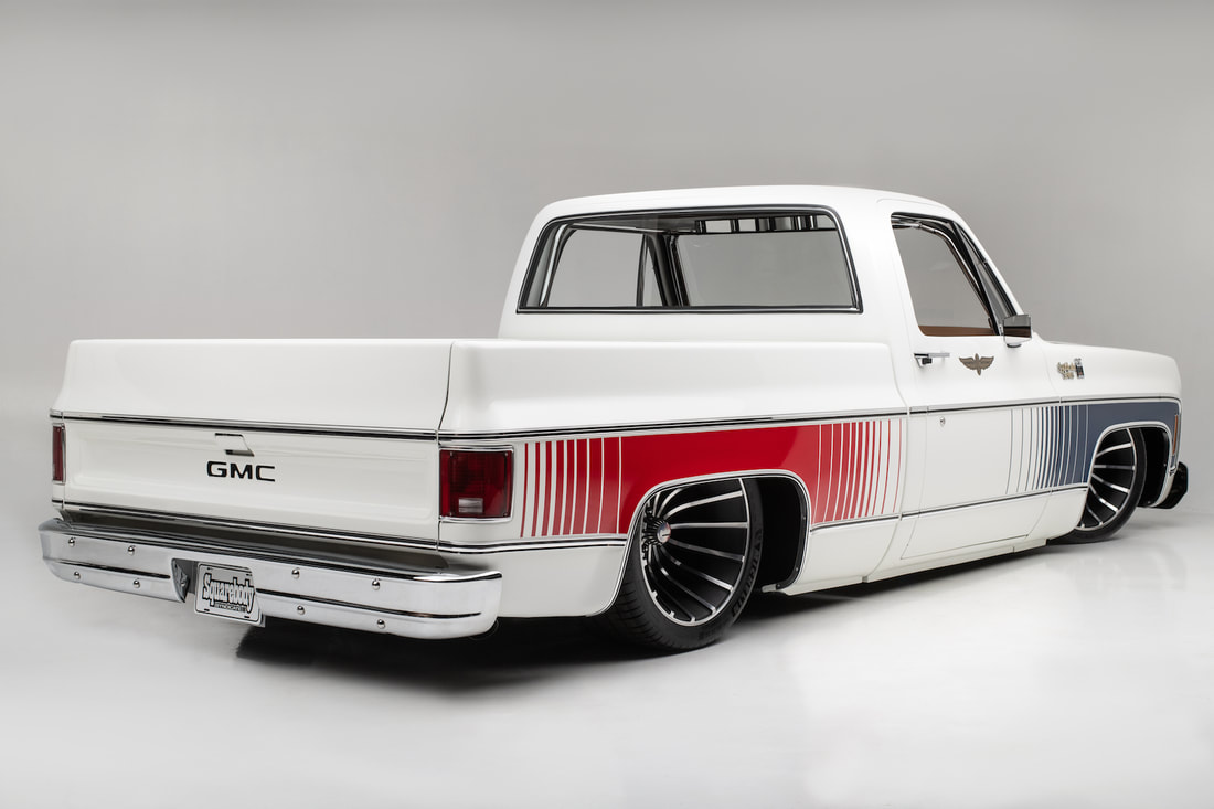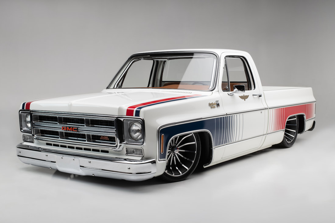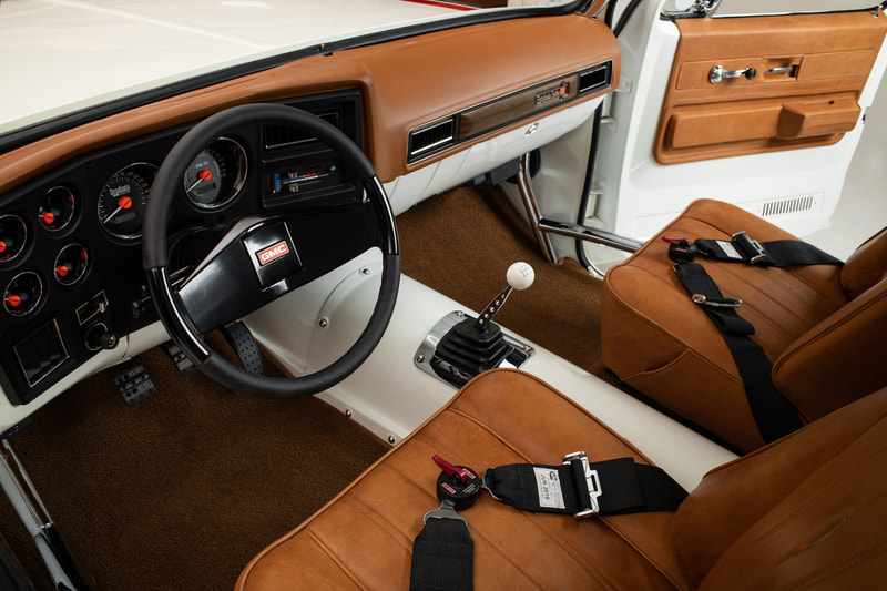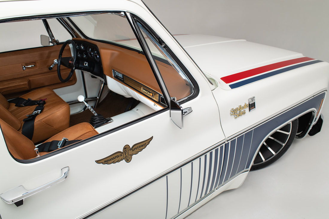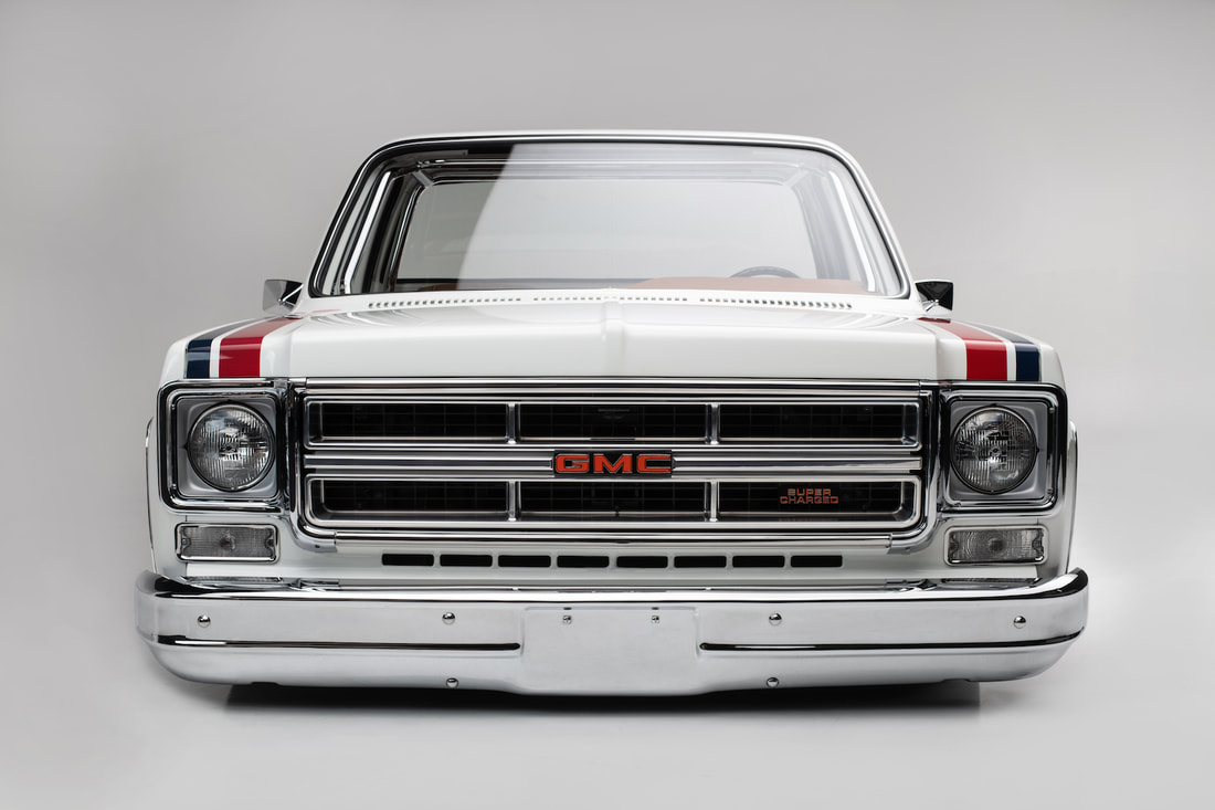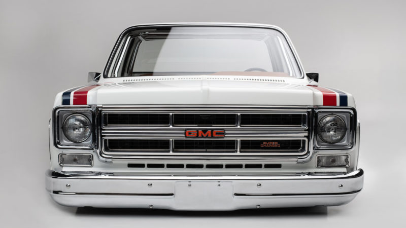 To keep a traditional feel, Joe decided to use vinyl graphics for the iconic red and blue strobe pattern. If you happened to stop by the shop at any time during the two weeks that Joe was deciding exactly what shade of blue and red to use, you may have left with blurry vision after sifting through the stacks of color swatches laying across the shop at any given time. In the end, it’s that dedication some may call obsessive that paid off as the depth and warmth of the colors chosen help highlight the rich white body of the future super truck. To help accentuate the graphics, Rob and Joe installed the very first set of laser straight Mar-K trim on the body and installed the brand new, crystal clear glass with rubber seals from Precision. N.O.S. parts were used throughout the build when at all possible, including all light covers and front trim. However, when a N.O.S. GMC grille could not be found, Joe knew he could turn to the team at G.S.I. to make a full billet grill to mimic the factory look, but even better. What was delivered in return was better than expected and really helped tie in the front end of the truck with the rest of the build. Below the grill, a chrome LMC bumper paired nicely with the chromed Billet Badges on the fender.