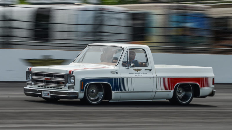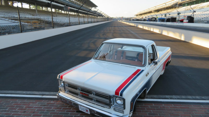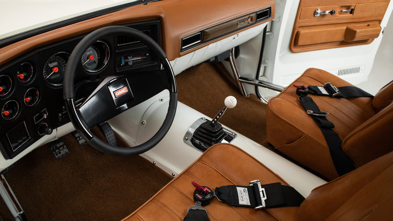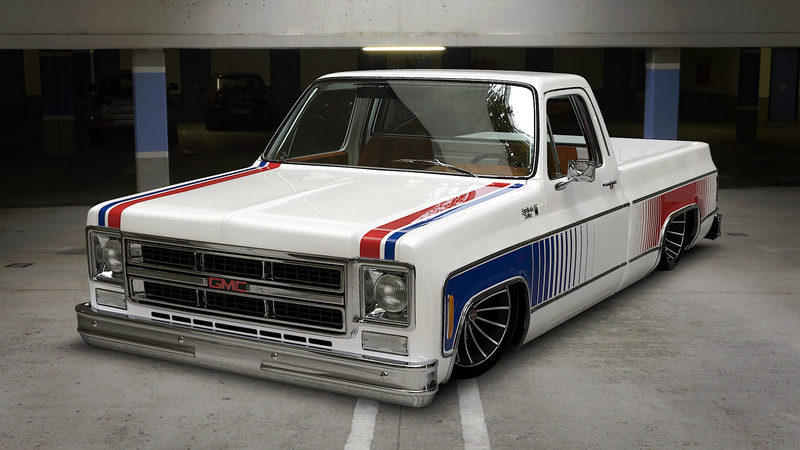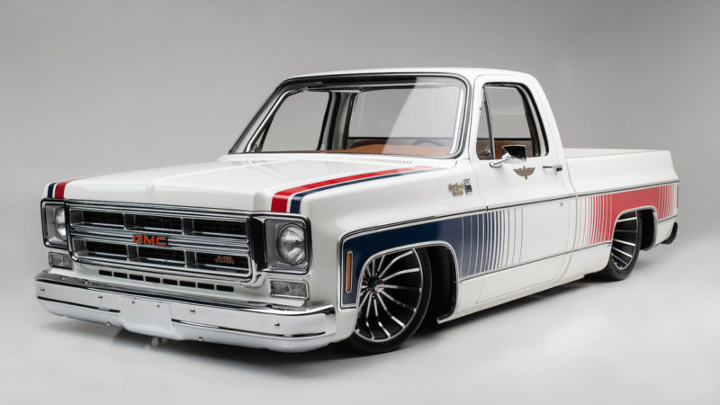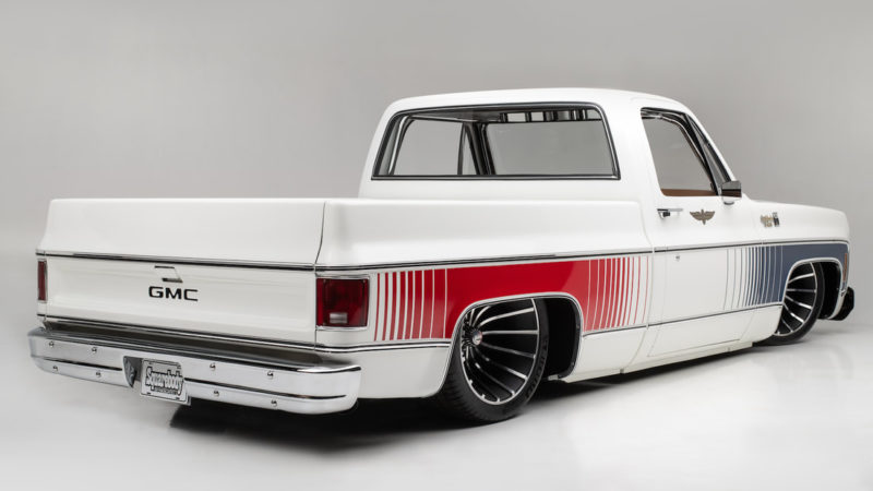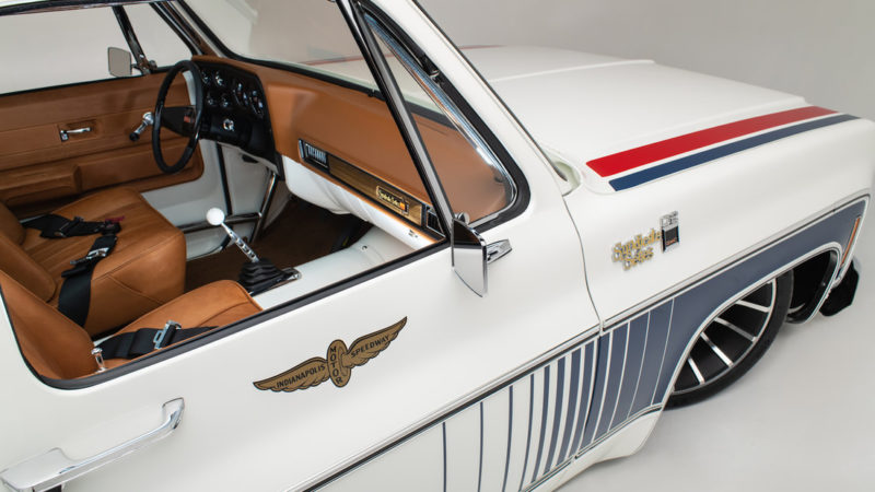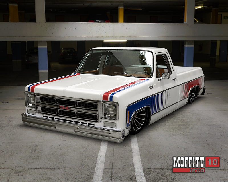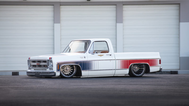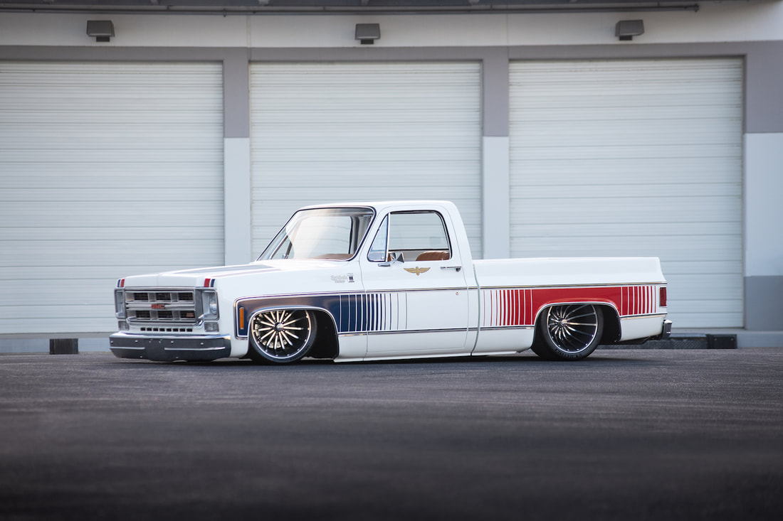 To keep a traditional feel, Joe decided to use vinyl graphics for the iconic red and blue strobe pattern. If you happened to stop by the shop at any time during the two weeks that Joe was deciding exactly what shade of blue and red to use, you may have left with blurry vision after sifting through the stacks of color swatches laying across the shop at any given time. In the end, it’s that dedication some may call obsessive that paid off as the depth and warmth of the colors chosen help highlight the rich white body of the future super truck. To help accentuate the graphics, Rob and Joe installed the very first set of laser straight Mar-K trim on the body and installed the brand new, crystal clear glass with rubber seals from Precision. N.O.S. parts were used throughout the build when at all possible, including all light covers and front trim. However, when a N.O.S. GMC grille could not be found, Joe knew he could turn to the team at G.S.I. to make a full billet grill to mimic the factory look, but even better. What was delivered in return was better than expected and really helped tie in the front end of the truck with the rest of the build. Below the grill, a chrome LMC bumper paired nicely with the chromed Billet Badges on the fender.