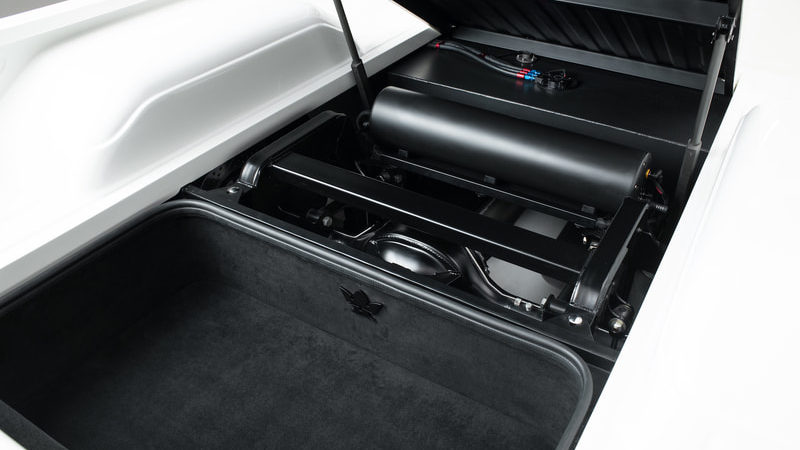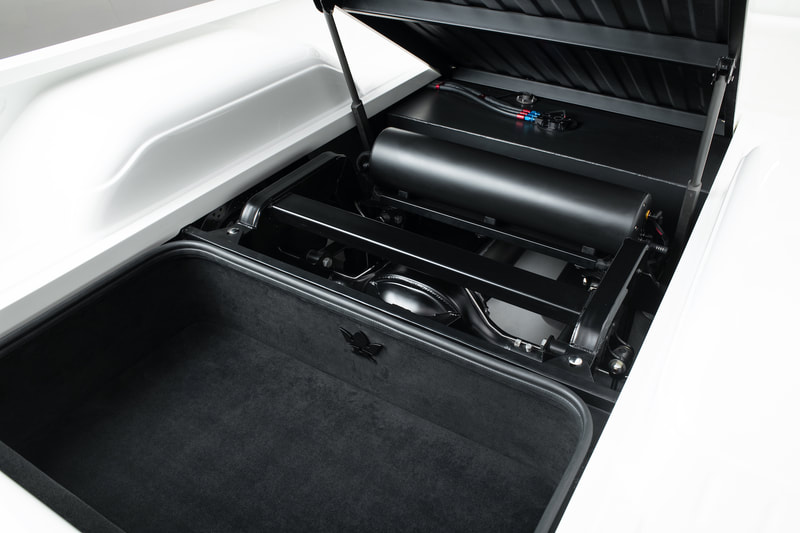 Out back under the electronic self-raising bed floor, Joe once again went against the grain and brought the fuel tank to the front of the bed above the frame rails and across the whole width of the truck to give himself 28 gallons of fuel storage thanks to David over at Boyde Welding. Behind the giant tank sits the Accuair CVT system for easy access and finally a weatherproofed two-level suede lined trunk. This design was very important to Joe after driving SS01 on long distance trips where storage space was limited. Now, there is plenty of room for a couple bags, as well as cleaning supplies under the false floor.