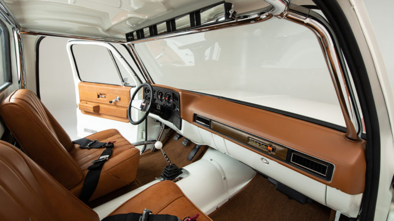 Next, Joe set his attention on the 2017 GM LS3 crate engine. This inspiration came from a Keith Black small block that graced the cover of a magazine in 1979 that always stuck in his mind. The process began with Joe rounding out all the sharp edges and points of the block. Then he headed out into the Phoenix heat of 120 degrees, in a full head mask, to media blast the entire engine three times to create the perfect, subtle, mechanical finish that looked more like something from a 70s Indy car than what we are used to seeing in high-end truck builds. Some people might think going that extreme on an engine block is crazy, and they’d be right, but it’s that extreme detail and patience that set Squarebody Syndicate Series trucks apart from the rest.