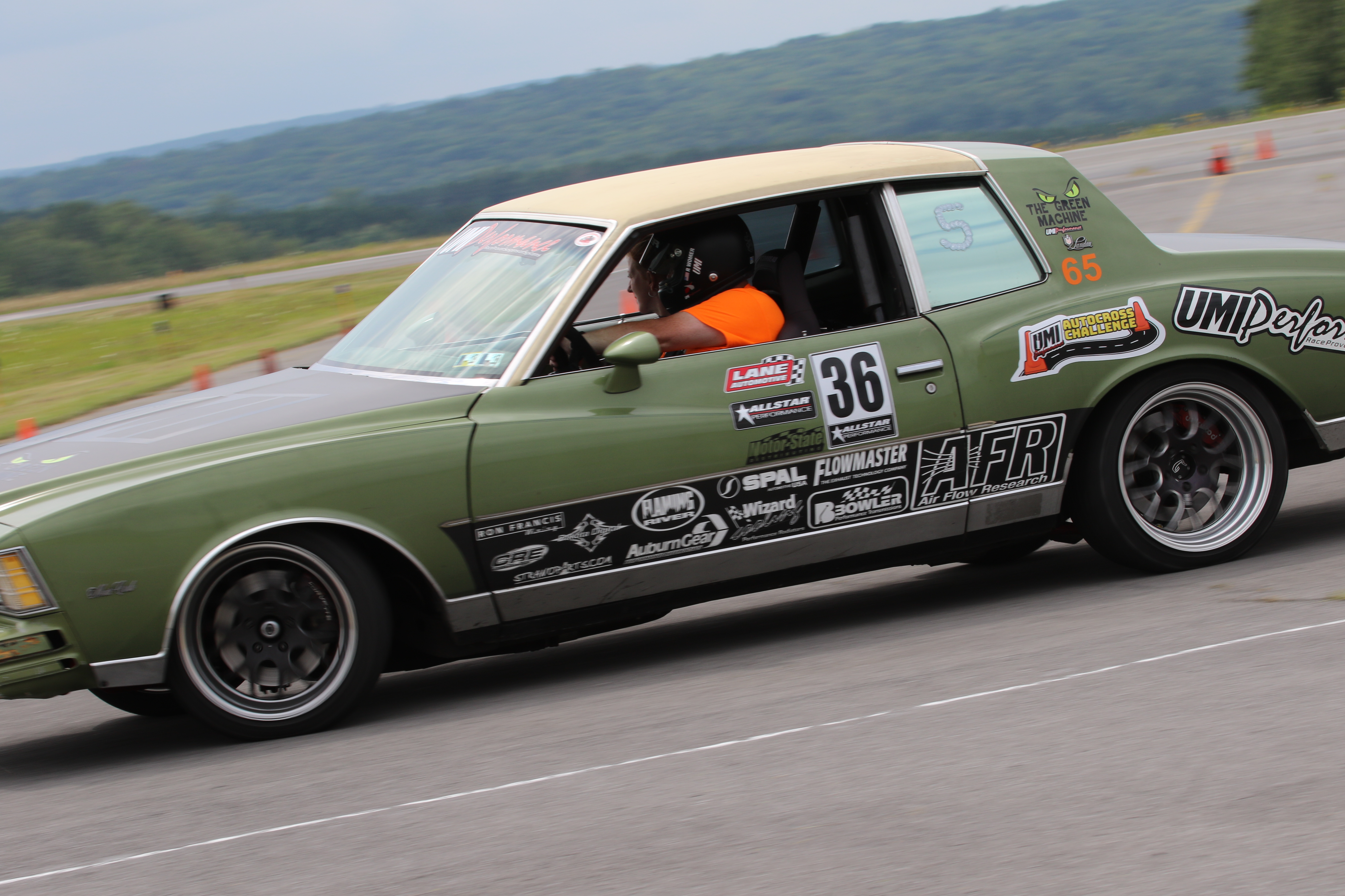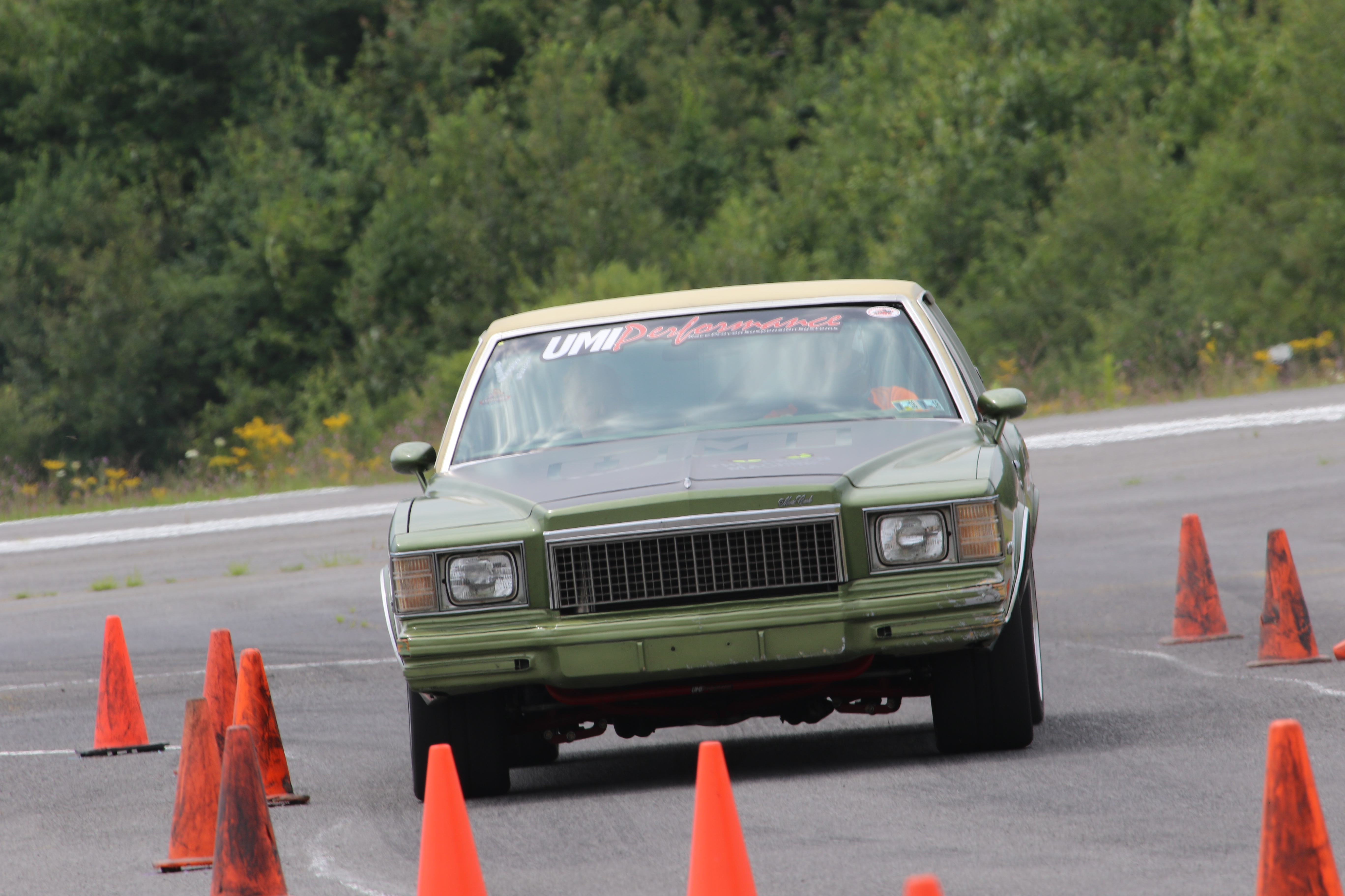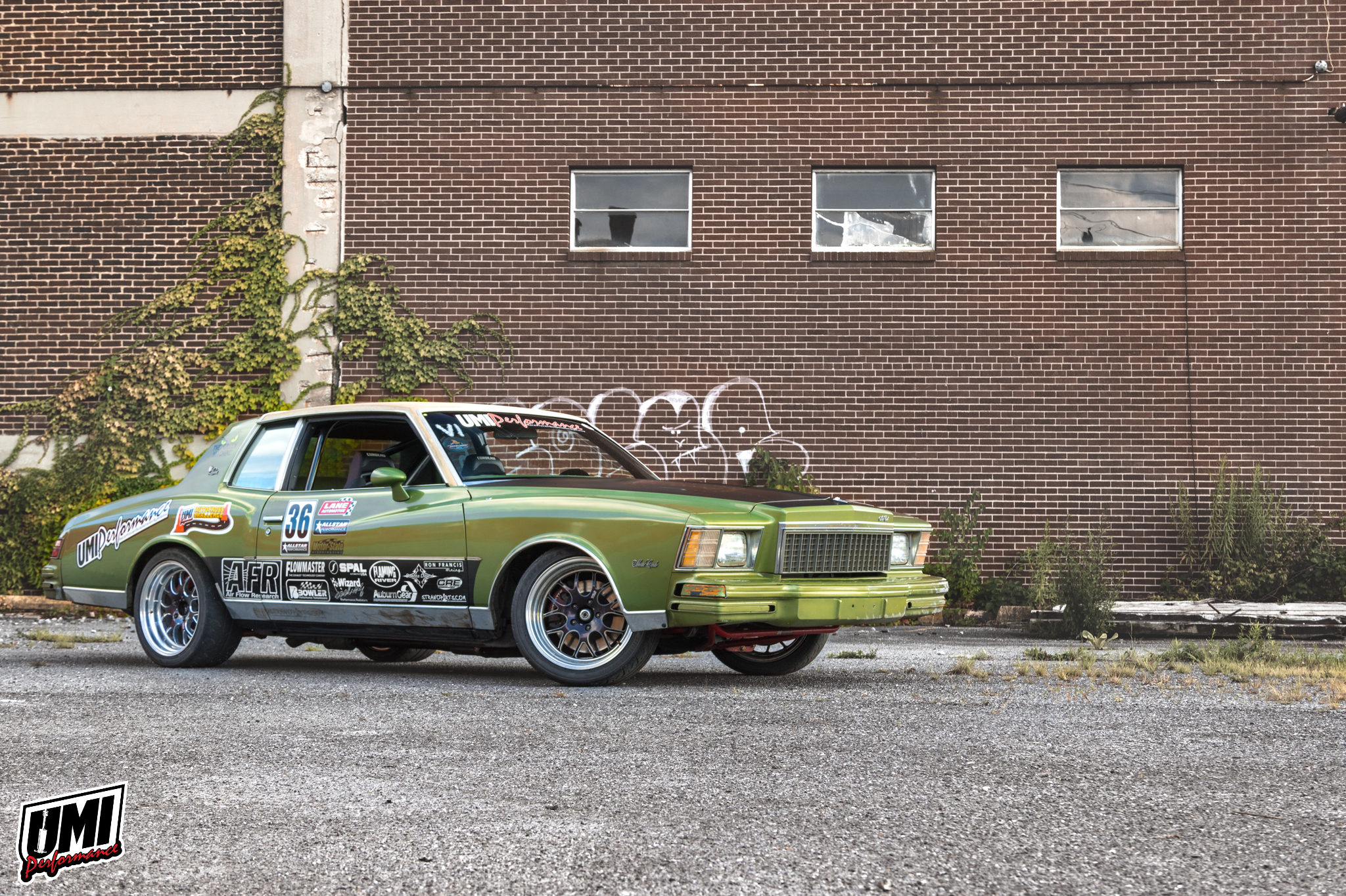 The UMI Green Machine is a 1979 Monte Carlo Landau with UMI suspension, big tires, big horsepower, and ground effects. We use it for the research and development of UMI's G-body line. This car excels at handling events and is also good at street driving and drag racing. It was the vision of UMI's President Ryan Kirkwood to have something not-so-pretty but still be very, very capable.