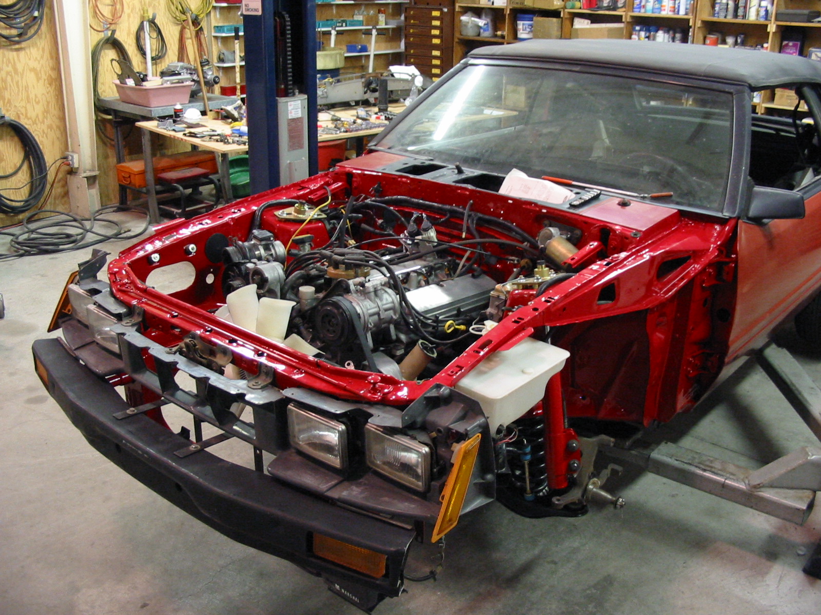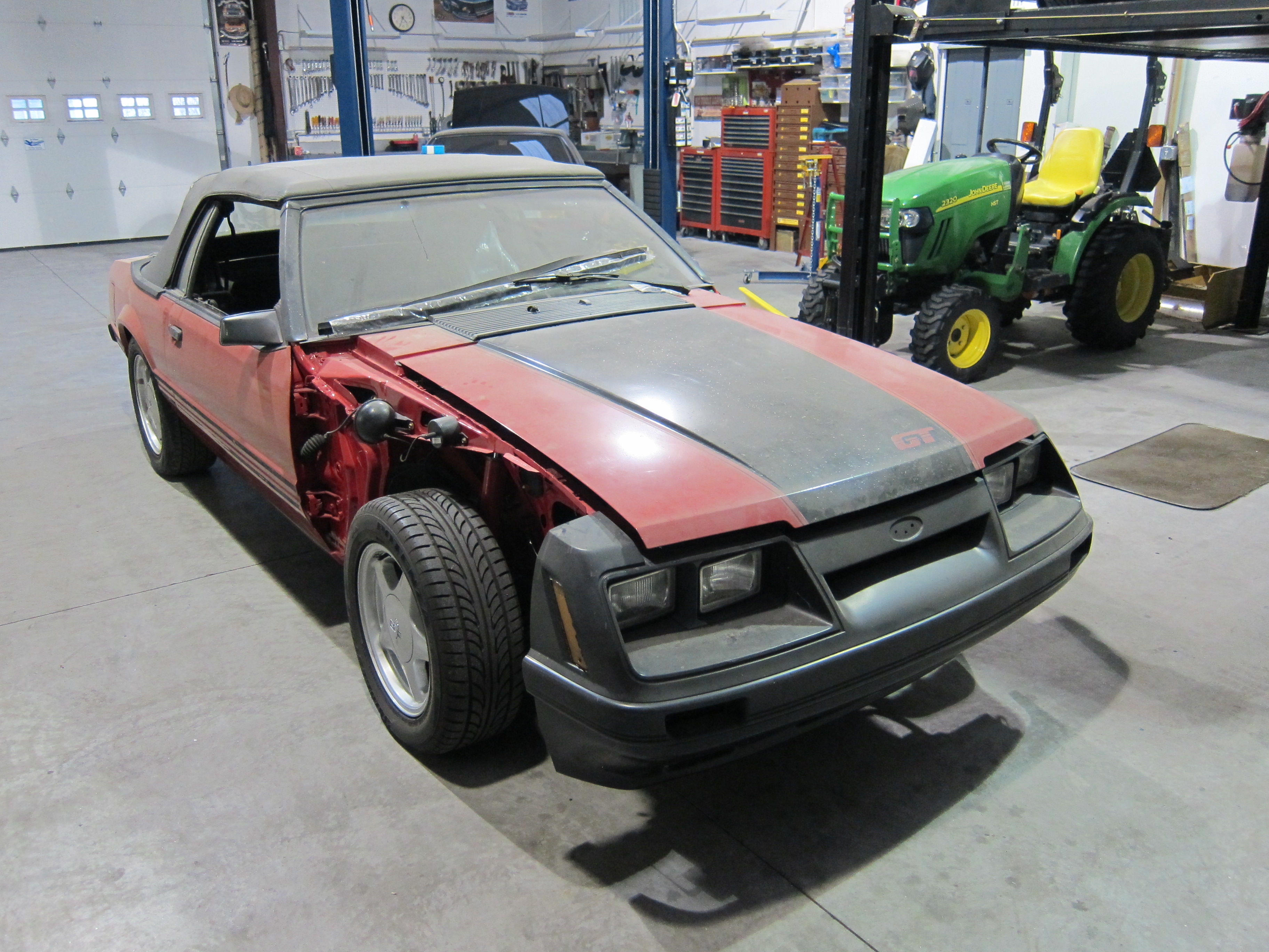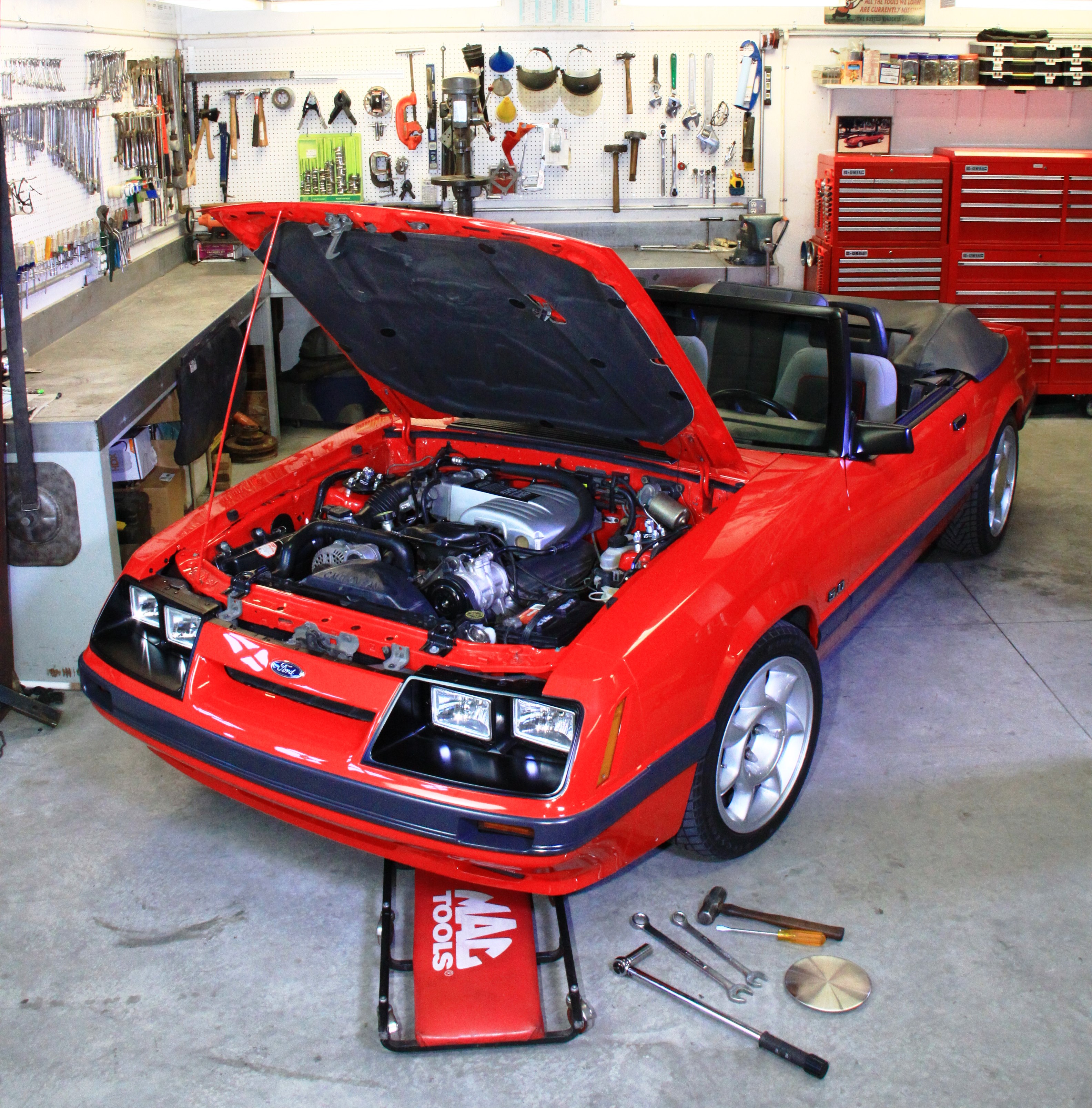This Mustang has had a long history and not many miles. Good friend Charlie Bruno purchase this car new and drive it for a few year before taking it apart for a brake upgrade. The part kept coming off and the project become much larger. Mustang was taken all the way down to complete weld the body and install two pairs of sub-frame connectors and outter extensions. From there the car laid rest on the car dolly for years in the back of Charlie's Mustang in San Jose, CA. I worked part time for Charlie in the evenings and weekends where a learned a lot about installed superchargers, big brakes, fuel injection, suspension and many other systems. Charlie passed away in Dec or 2001 and the car was left outside on the same car dolly. The future of this car was in question. The Bruno brothers did not know what to do with what was left of the Mustang. I showed interest in the Mustang and talk them into letting me have promising to bring the car back to life. In 2006 I had plans to move to Idaho so I had to bolt on as many parts I had found on the car to make the transport easier. So, a mad dash to make the Mustang a roller happened in summer of 2006. Anything that was not bolted on the car was place in box and loaded into the trunk and interior. The car was trailed up to Idaho behind a hot-rodded 74 Ford Econoline van sporting a fuel injected 410ci windsor. Once in Idaho the poor Mustang had to wait again for my new house and shop to be built to begin the rest of the restoration. In 2010 I finally had time to get the Mustang running again. The motor that was installed was the 5.0HO that was in my 88 Mustang GT that was stolen and recovered in 2003, but that is other story. The T-5 with a 2.95 first gear was build in my shop at Modern Driveline.