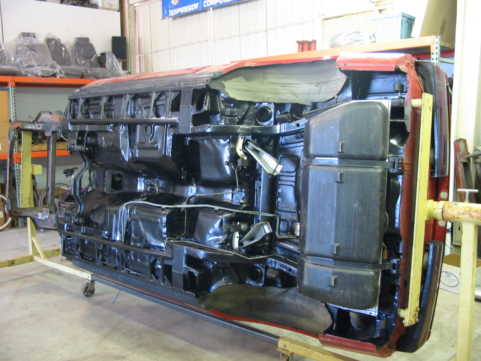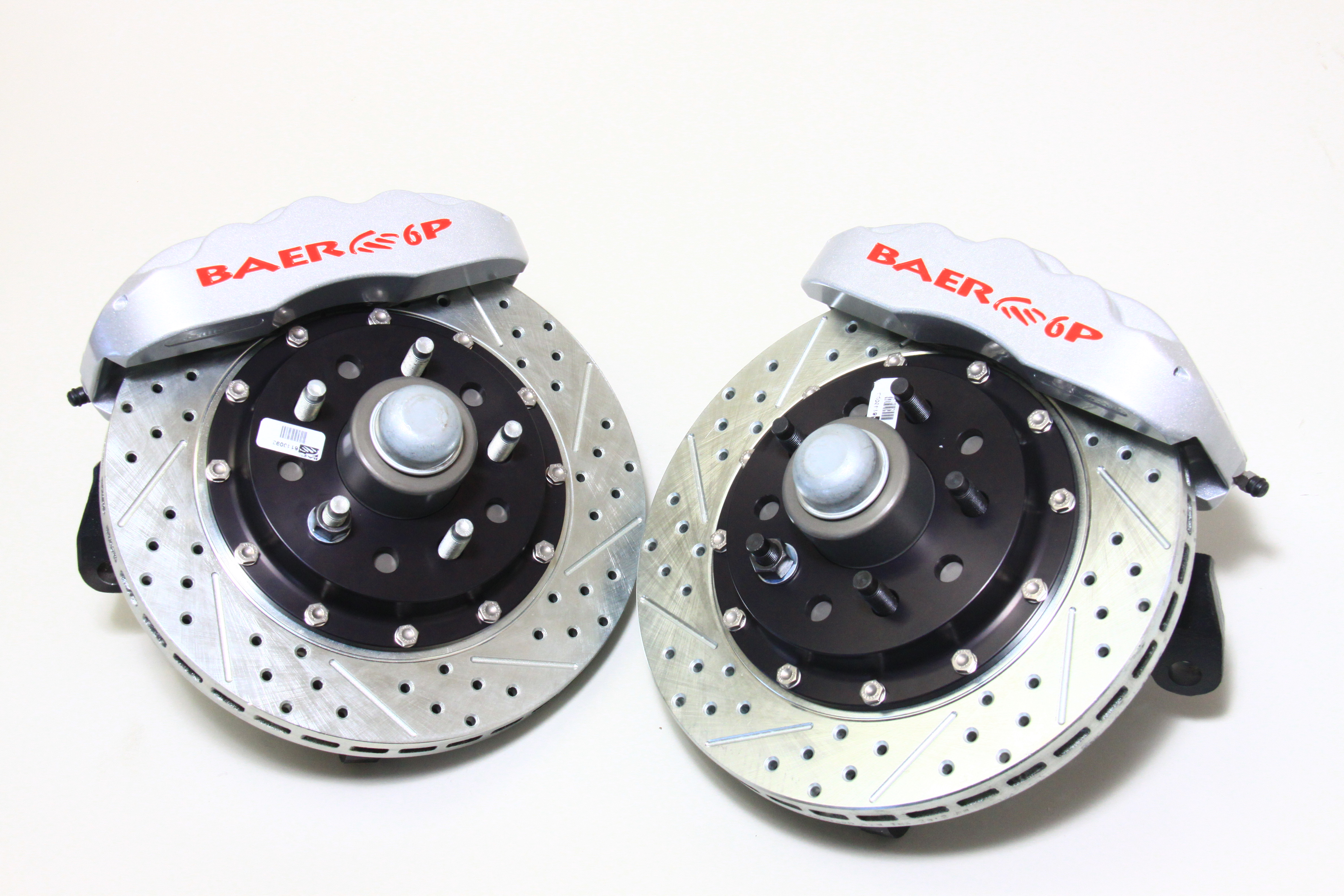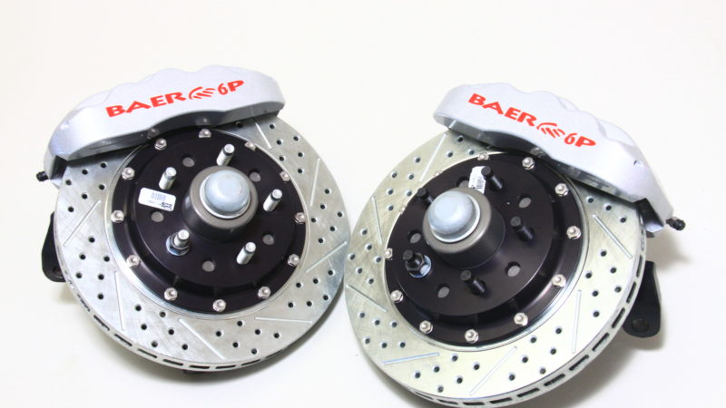 At first I installed upgraded brakes using 93 Cobra disk conversion and 87-93 Mustang front brakes but that did not last long. Charlie sold and installed Baer brake and the rest the car came apart so after talking with Dutch Miller at Baer brakes, a complete 12.5" Baer kit was donated to the project. Six piston 6P up front with a four piston S4 in the rear. The stock suspension was removed and replaced with a complete Maximum Motorsport suspension. Front tubular front K-member, coil over in the front and adjustable height control arms the rear. The suspension come complete with struts, shocks, caster and camber plates. Being this a "date night car" we kept the ride soft but right for curving Idaho mountain roads. It does this well.