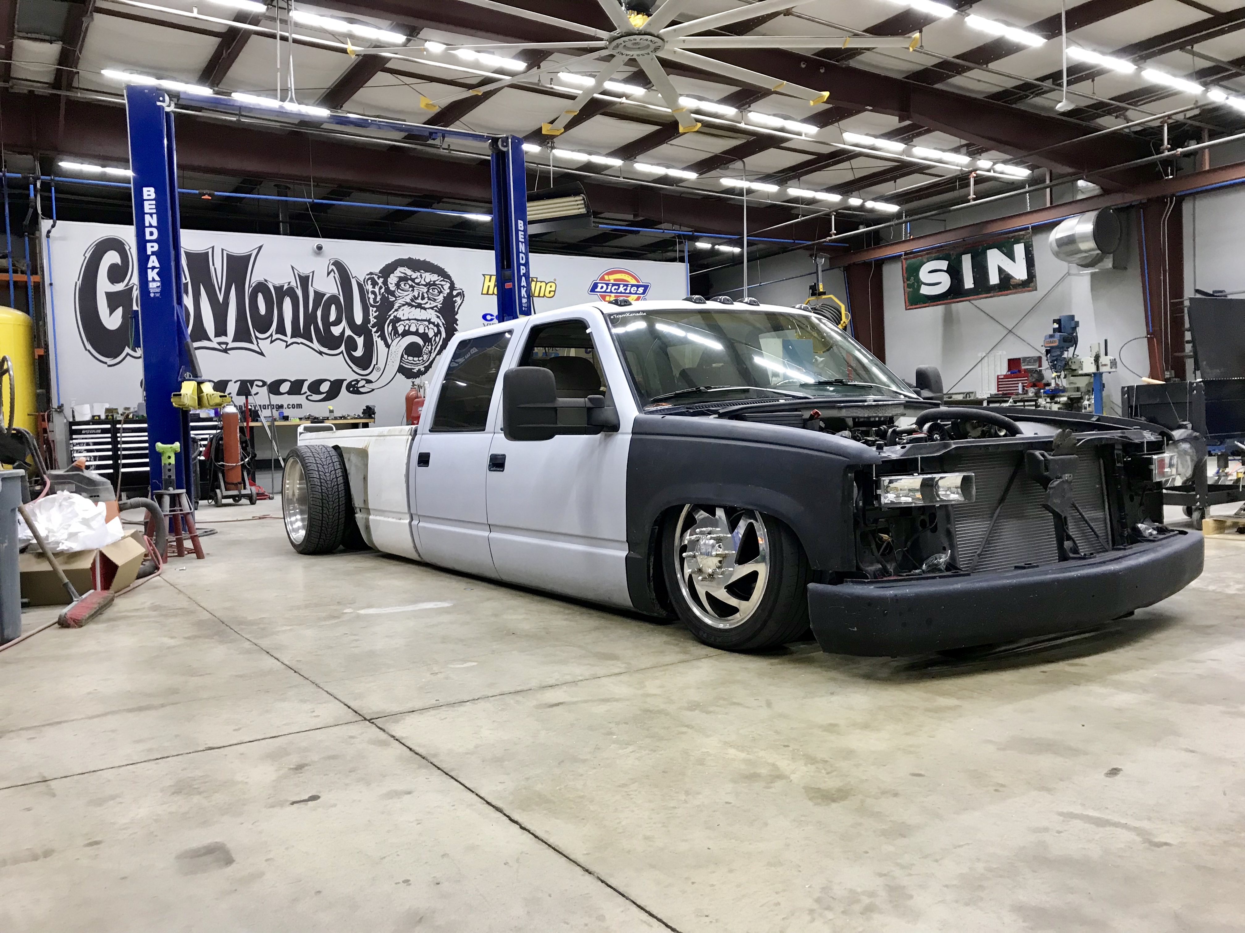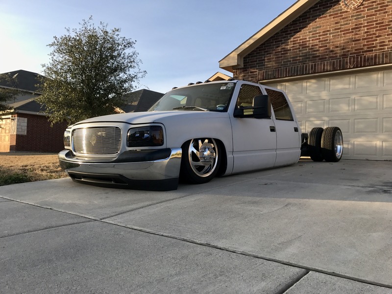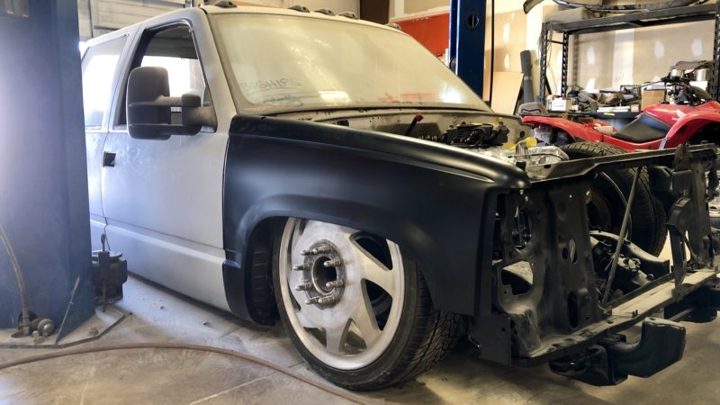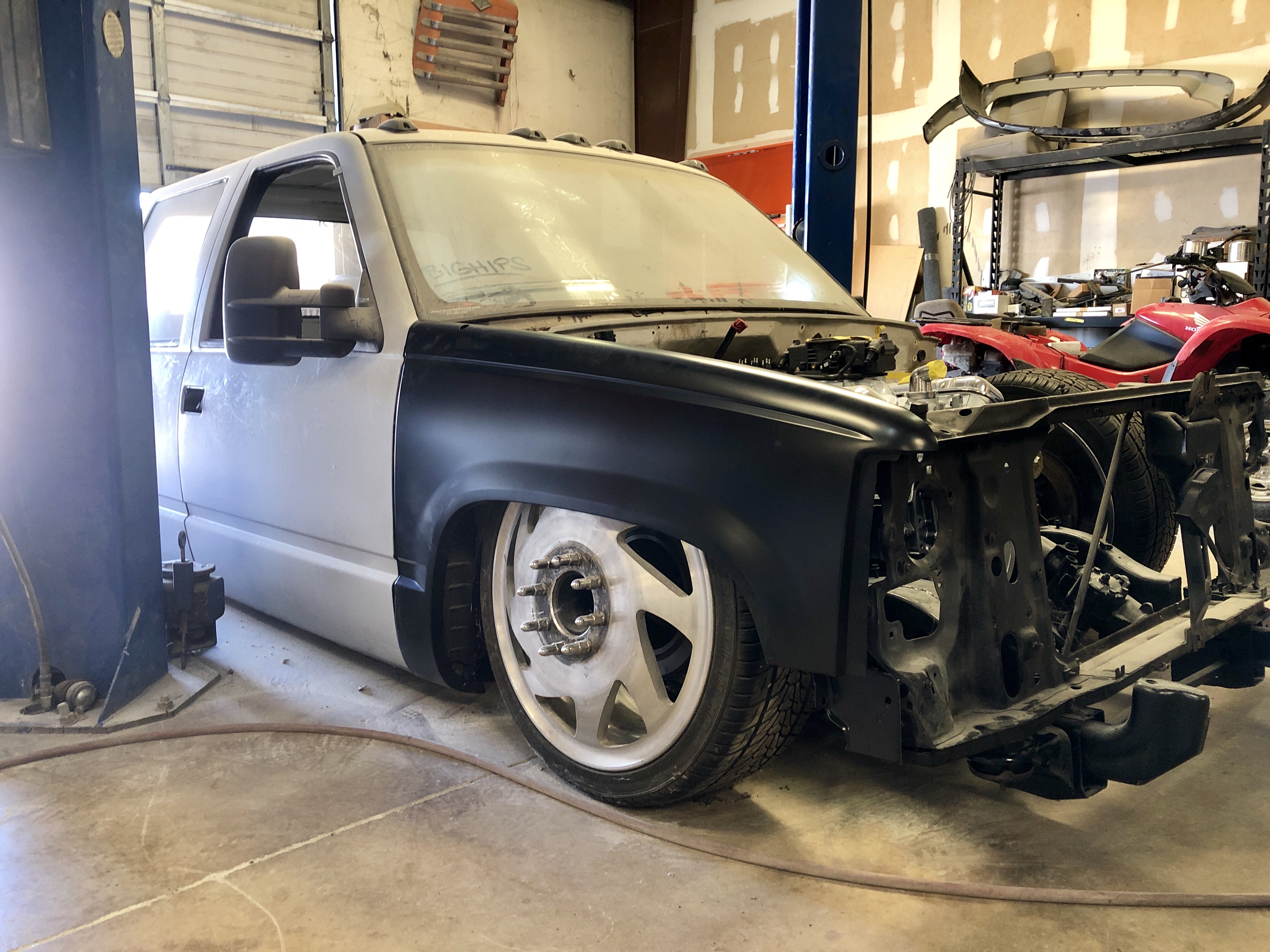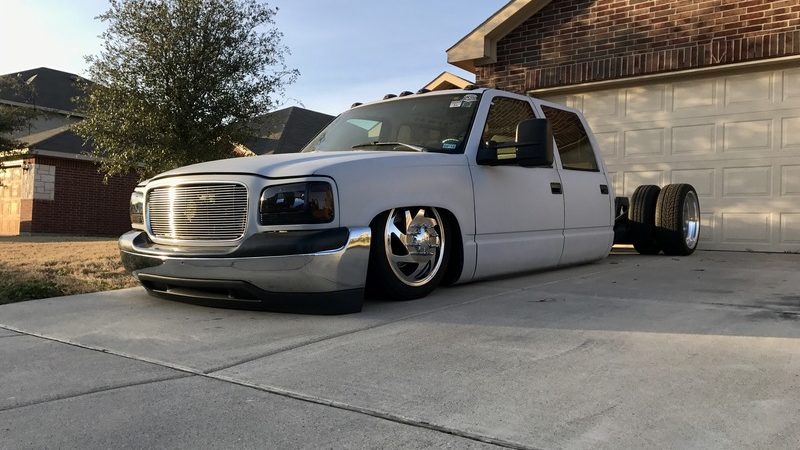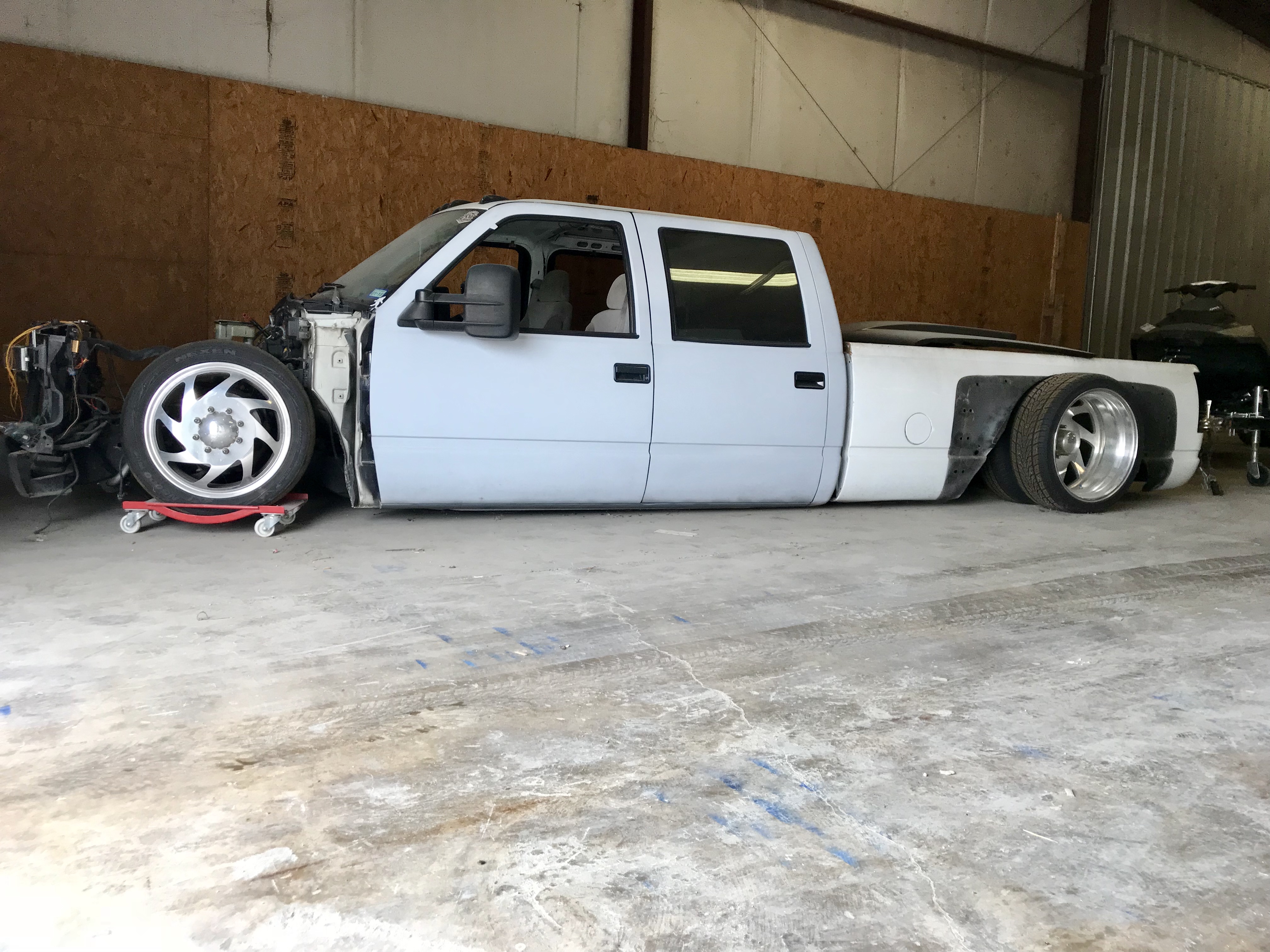The truck is traditional body dropped and I’m running Slam Specialties SS-8 front bags, 3200lb Firestone bags in the rear, NFamus Watts link, Sean’s Garage 4-link, Accuair Endo tank with E-Level and dual stealth Viair 480 compressors. The engine is a 454 bored .30 over running a Lunati cam and a Holley Terminator EFI kit with custom headers and Magnaflow exhaust. The truck has 22” American Force Wheels as well as Rocky Hinge suicide rear doors and the interior will have a 1962 Chevy truck dash with custom door panels and 4 bucket seats in leather and the plastics will be wrapped and painted as well, we are building a custom center console that will go from the dash to the back of the cab. It will also be running Vintage Air air conditioning