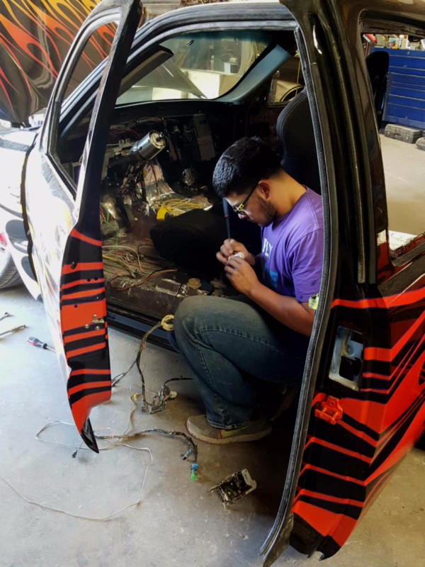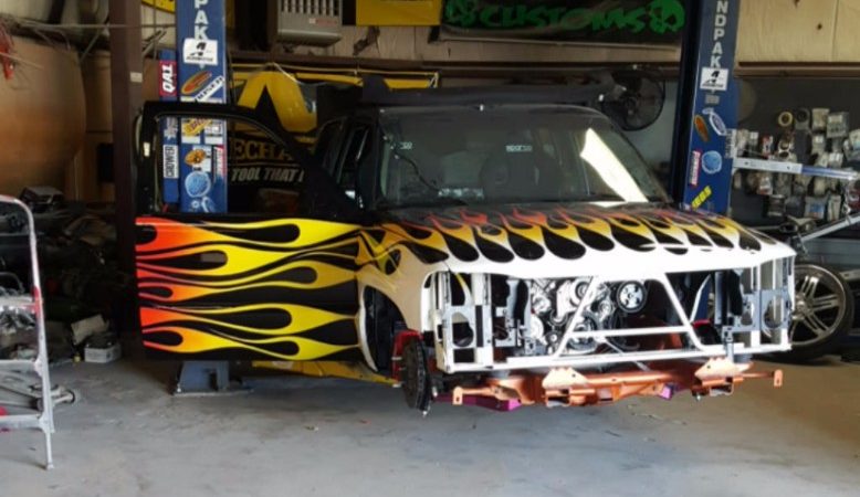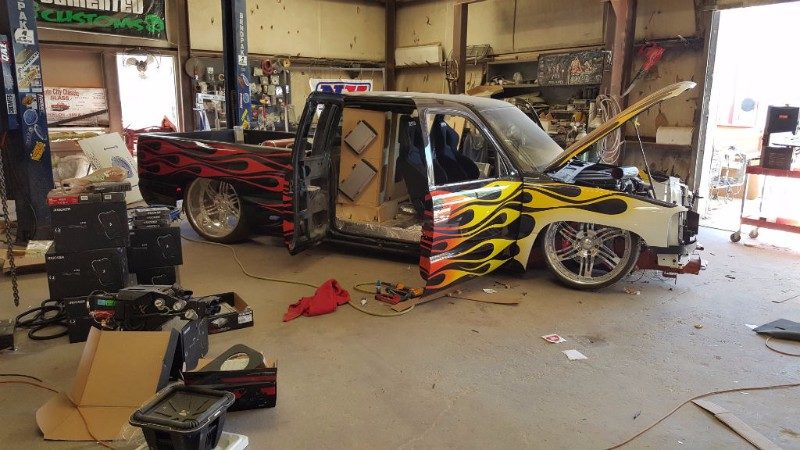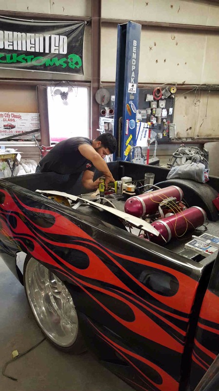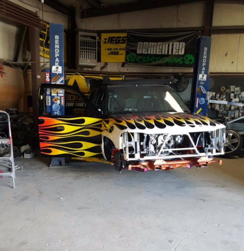 Entire build is being completed at Demented Customs by James Torrez and his 3 oldest sons, Jaime Torrez who is 22, Christian who is 19 and Paul who is 16. We are doing the entire build from frame to final wiring with no outsourcing at all for any of the work. This truck is a race truck theme with a roll cage and everything. We are doing it all, entirely, in 14 weeks.