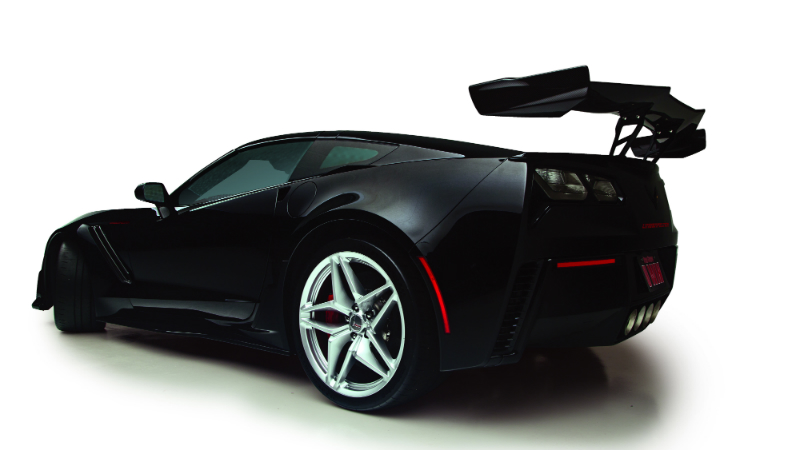 The optional ZTK Track Package, included in this grand-prize super Vette, adds a stanchion-mounted adjustable carbon fiber high wing, Michelin Pilot Super Sport Cup 2 tires, and performance suspension with specific shocks and springs.