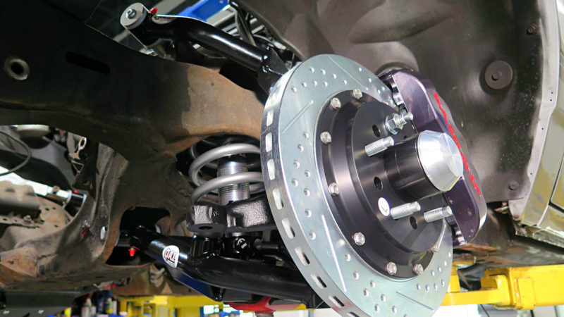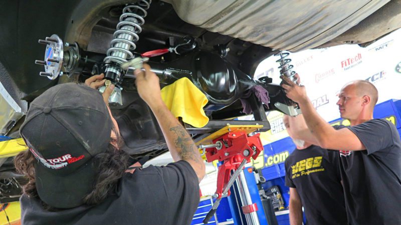 Monday we spent the morning stripping all the old parts from the Monte Carlo, which is actually pretty fun to do. After lunch though the real work began. Starting with the Currie 9-inch rearend we tackled the rear QA1 Level 3 rear suspension. Adjustable upper control arms, double-adjustable coilover shocks, and a performance sway bar will be a huge improvement over the stamped steel stuff we removed. Up front the we installed the other half of the QA1 Level 3 suspension kit which included their race-ready upper control arms, tubular lower arms (with high-durometer bushings), and a much stiffer hollow swap bar in addition to another pair of coilover double-adjustable shocks. For brakes Jegs sent a complete, ready to install, system from Baer which included 13-inch two-piece rotors and their 6P calipers in a clear black finish. The 6P calipers, front and rear, utilize a 6-piston arrangement and can run easy-to-source Corvette C6 brake pads. The brakes came pre-assembled complete with a G-body spindles, which saved us a ton of work.