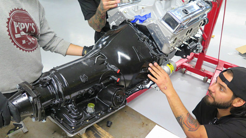 Day three of our Jegs Week To Wicked build was a bit of a grind. Mostly because it involved the less glamorous and somewhat tedious task of wiring and plumbing. Certainly necessary tasks, but somewhat less exciting than bolting on cool widgets. The Jegs supplied 4L60 transmission was mated to the 1987 Monte Carlo SS Aerocoupe’s shifter linkage and we continued hooking up the ATK 383 small-block. We did have a small hiccup when the headers didn’t fit since we didn’t realize the ATK stroker had raised port heads. After a quick call to Jegs the replacement headers were ordered and will be here tomorrow. Hey, it’s all part of hot rodding, right?