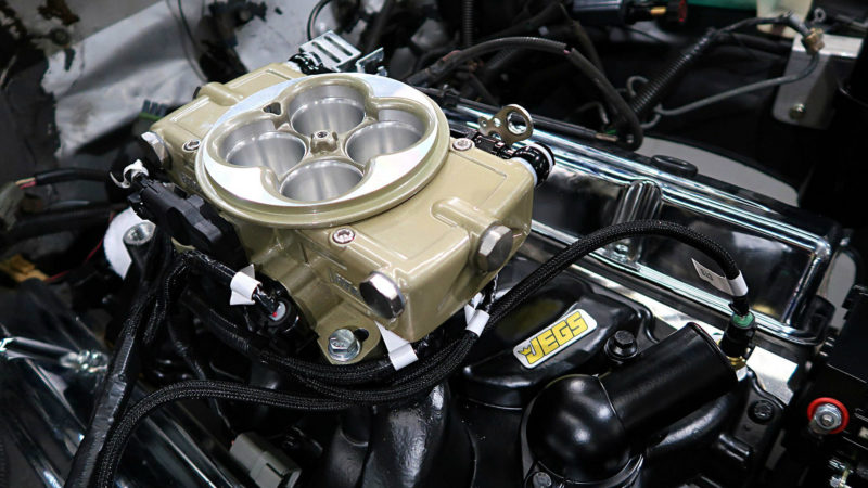 One of the last major parts to be installed was a complete FiTech EFI system. This was their new Classic system which is rated at 650 hp, more than enough to handle our 500+ hp ATK mill. The carburetor-styled EFI unit was mounted to a Jegs dual-plane intake and will be fed by FiTech’s new Command Center 2. This compact tank is fed by the low-pressure mechanical fuel pump and then pressurizes the fuel for the EFI system. The Command Center two came with an integrated regulator and pressure gauge along with fittings and some push lock hose. It’s a super easy way to get EFI performance and as a bonus it looks great. The throttle body uses carb-style linkage, so it was very easy to integrate into our SS. Once the FiTech was in place we set the engine to TDC and dropped in the Jegs distributor.