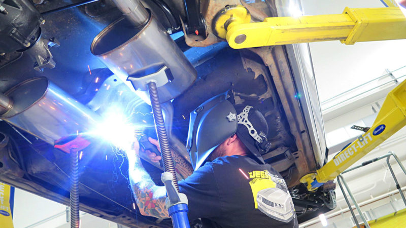 In other happy news our headers arrived from Jegs and they fit the tight confines of our engine bay perfectly, even with the raised ports on the ATK heads. With that done we could turn our attention to one of the last “big” projects, the exhaust system. Jegs had send us over a very nice G-body kit featuring pre-bent, stainless, 2.5-inch pipes and a pair of stainless high-performance mufflers. Having the pre-made kit saved us a ton of time, but we still spent time making sure everything was exactly where we wanted it before tacking it place. The only part we had to make was the transitions from the mid-length headers to the Jegs exhaust system. Overall the kit was easy to get in, looked great, and we can’t wait to hear how it sounds tomorrow when we finally fire up our ’87 Aerocoupe project.