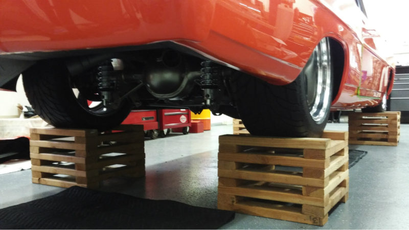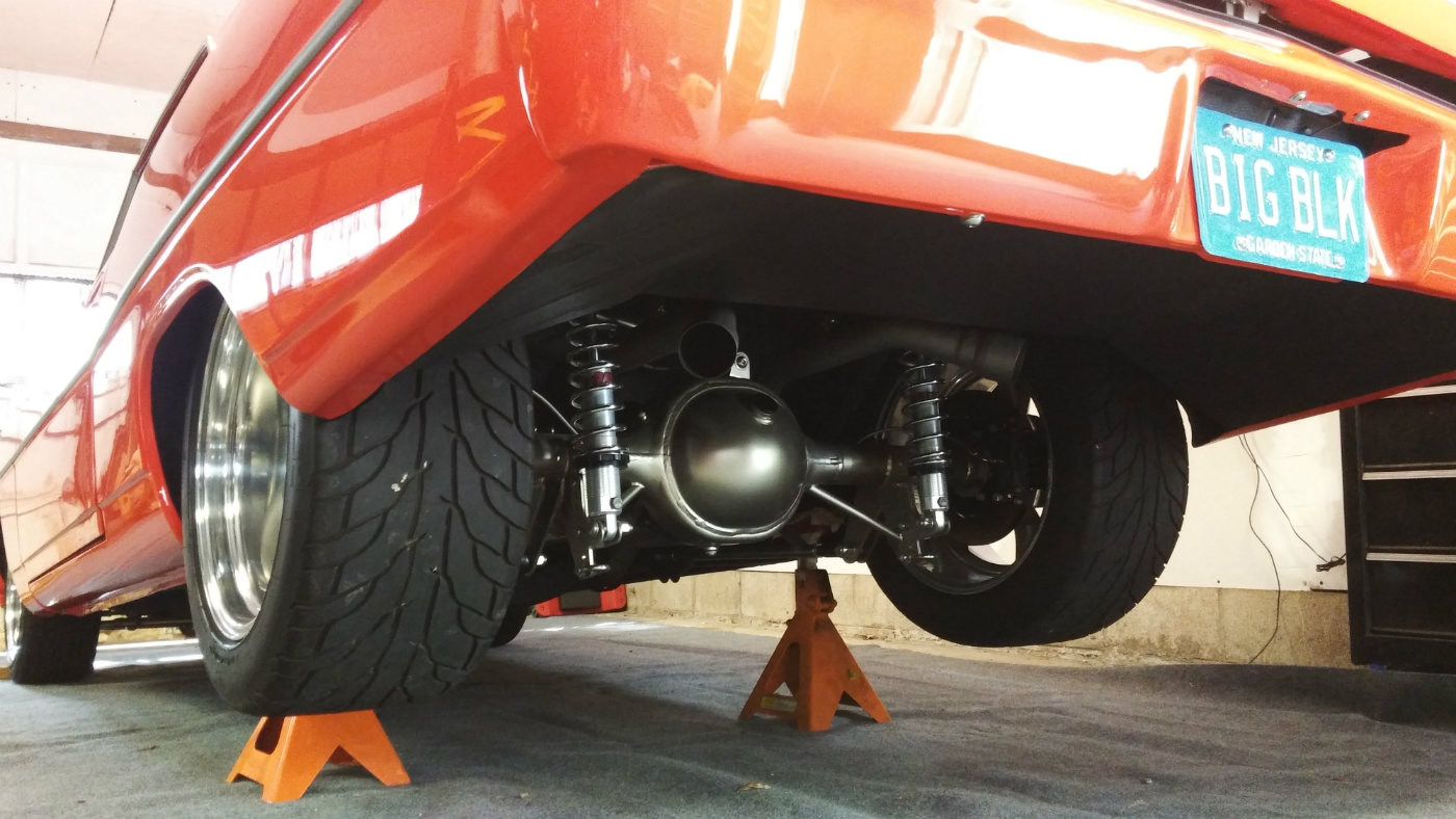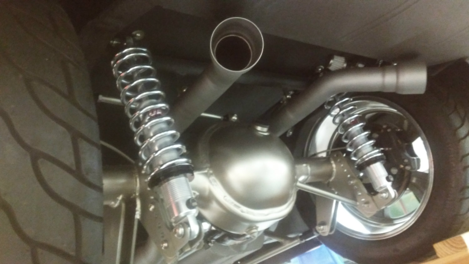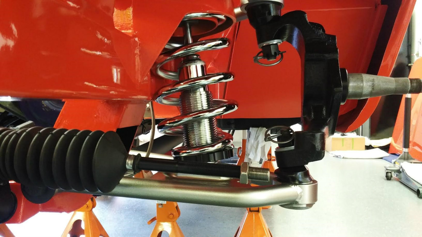 S&W Race Cars Ladder Bar suspension Aldan adjustable coil-over shocks (front/rear) Wilwood Disc Brakes (front/rear) Heidts Mustang II front suspension crossmember with manual steering rack Heidts Tubular Upper/Lower Control Arms Ididit Steering Column