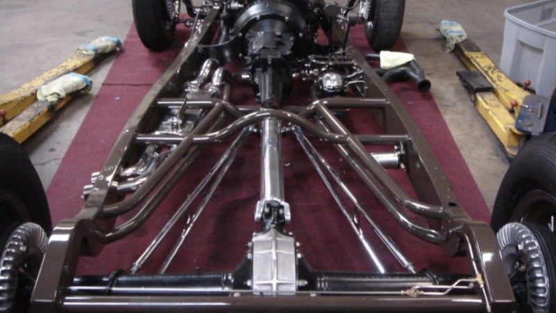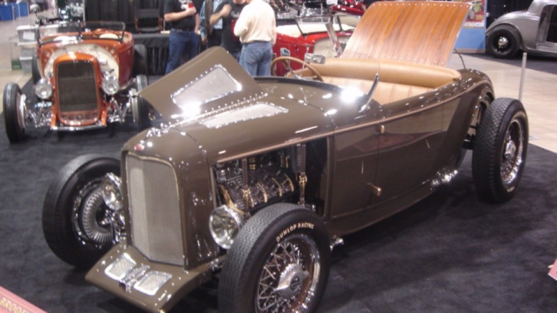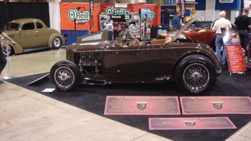 The “Brooklands Special” is a 1932 Ford roadster built as a tribute to Brooklands Raceway in Surrey England. It features a variety of unique features found on early European race cars and sports cars. It features extensive body modifications such as: right hand drive, 2″ sectioned body, completely re-worked trunk area, wood inlay deck lid, flush fit frame rails, extended grill shell, handmade aluminum details, and much more. The engine features Elco twin plug heads, three 97′s and a host of rare speed equipment, backed by a 5 speed manual trans and “no change” aluminum center sectioned banjo rear end.