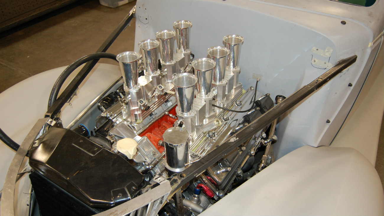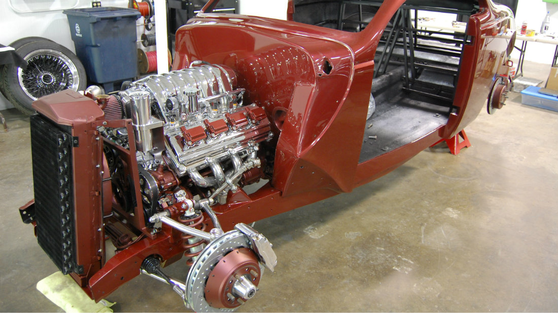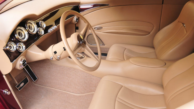 Joe’s ‘37 is based on a Manoti fiberglass body, with a TCI Chassis. The engine and transmission is a 6.1 liter Hemi with a 5 speed automatic. Custom touches include one-off wheels, headlight bezels that surround Mercedes headlights, hand fabricated trim, GAC tail lights, and a one-off steering wheel.