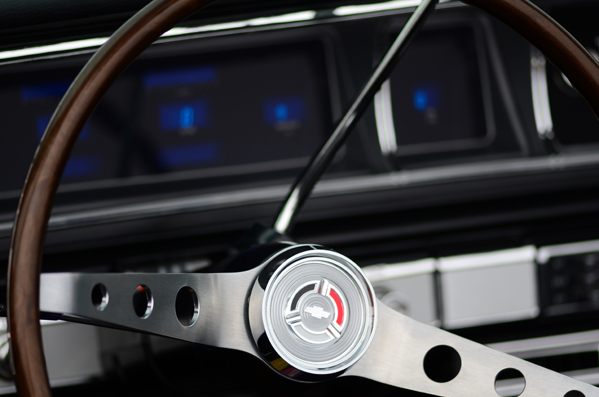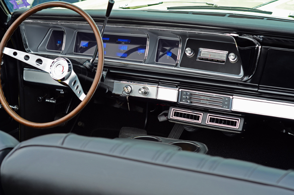 Looking to the inside, knowing that many hours were to be spent in the office, Ken wisely brought the interior back up to OEM condition. Can’t beat the original threads in a muscle car. A direct-fit digital instrument system was tucked into the dash, along with a host of other Dakota Digital products; a controller for the electric fans, gear-position indicator and LED taillights out back.