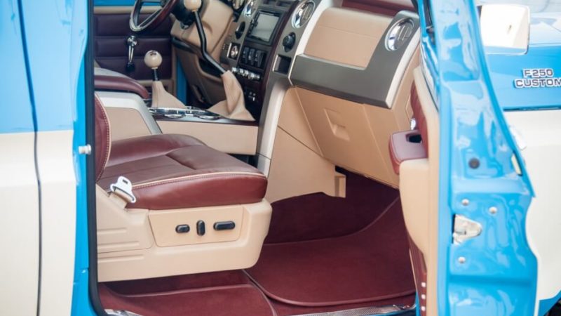 Since most of Fulks’ time would be spent inside the ’77, the original interior wouldn’t even come close to cutting it. So Bent metal Customs sourced a complete interior from a 2012 King Ranch Super Duty to be transplanted. After modifying the interior, the body panels were Dynamated to reduce noise and help keep temperatures in check. Brunner then fit all the pieces. The seats , however, were not that easy and required extensive modification to fit them in. Once he’d made all the necessary modifications and everything was fitting the way it should, the stereo was installed (featuring multiple parts from JL Audio, Kenwood, and Memphis Audio). Before sending it off to Gillin Design, a ton of work was done: the headliner was made from scratch, complete with a built-in, drop-down TV screen. High-end Mercedes English Wall carpet was laid down; door panels were built from scratch and installed; multiple select parts were wrapped in leather, and the rear seats were reupholstered. The truck then made it back to Bent Metal Customs where final touches were made before it could be returned to Kip Fulks.