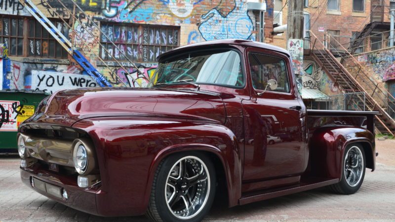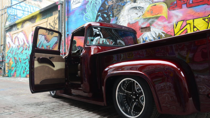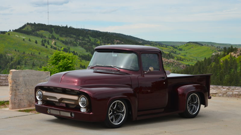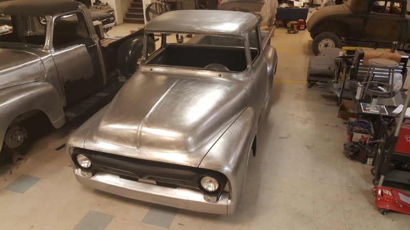 Now for Body mods; most all the body mods are very subtle also done by Jason Millard. Let’s start with the front fenders. The fenders on these fords of the 50’s have very large wheel opening. TCI did a good job centering the wheel in the opening, but we thought we should bring the rear of the front fender opening and move it forward 2 inches. It just gives it a better cleaner look that is not very noticeable but nice. One more thing we do to all our builds is we welded in some 3/16 round rod to the inside lip of all the fenders. It smooths them up and ads a little strength to them, no sharp edges. Actually, on this build we added the round rod to every sharp edge of metal on the entire truck. The doors on these trucks have square corners, well that did not work for us, we rounded all square corners. With nicely painted running boards, person never wants to step on them. So, we took the running boards and cut a good 2 inch off them to make them narrower, now easy to step over the running board instead of on them. Also, the way the boards fit to the fenders was a little out of place for us, so we made the running boards fit up to the fenders much better than Ford did. Any factory seams on the truck was cut out and the welds was hammered smooth, like the truck had no seams at all, one big stamping. The rear of the bed was crying for a roll-pan, so we gave it a very tasteful one with the exhaust tips recessed up into the roll pan. I have always like the 37 Ford car taillights. The 37 taillights got recessed into the stake pockets down low, very nice look. Mark wanted to make sure the person behind him could see the lights and yes, they can see those LED light for a good distance away from Speedway Motors.
