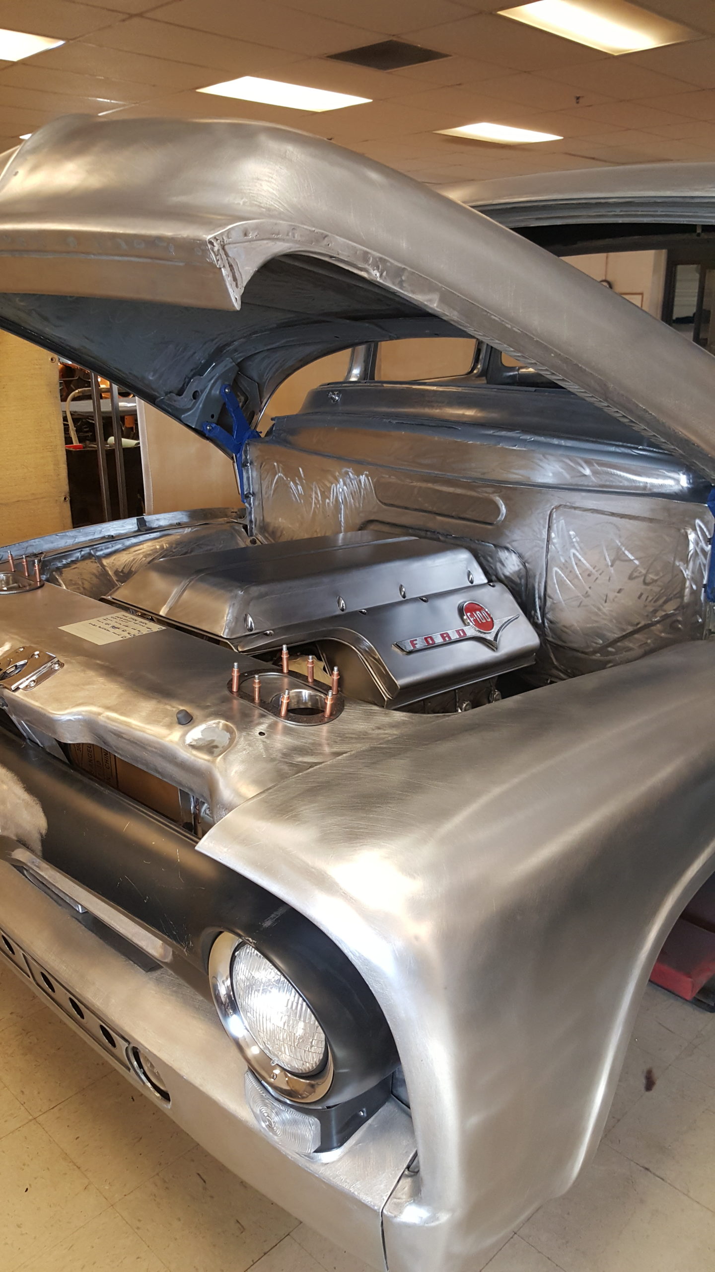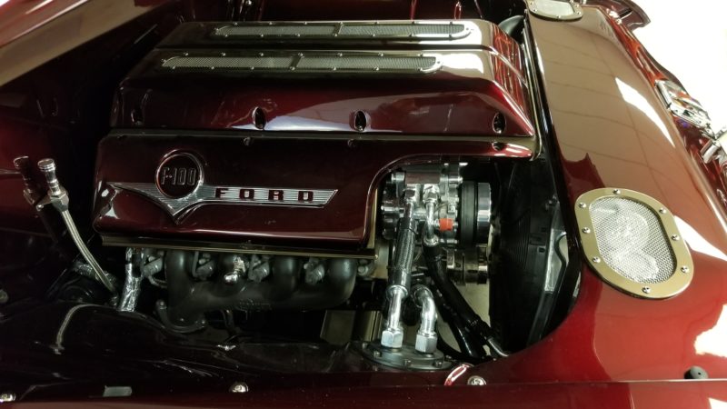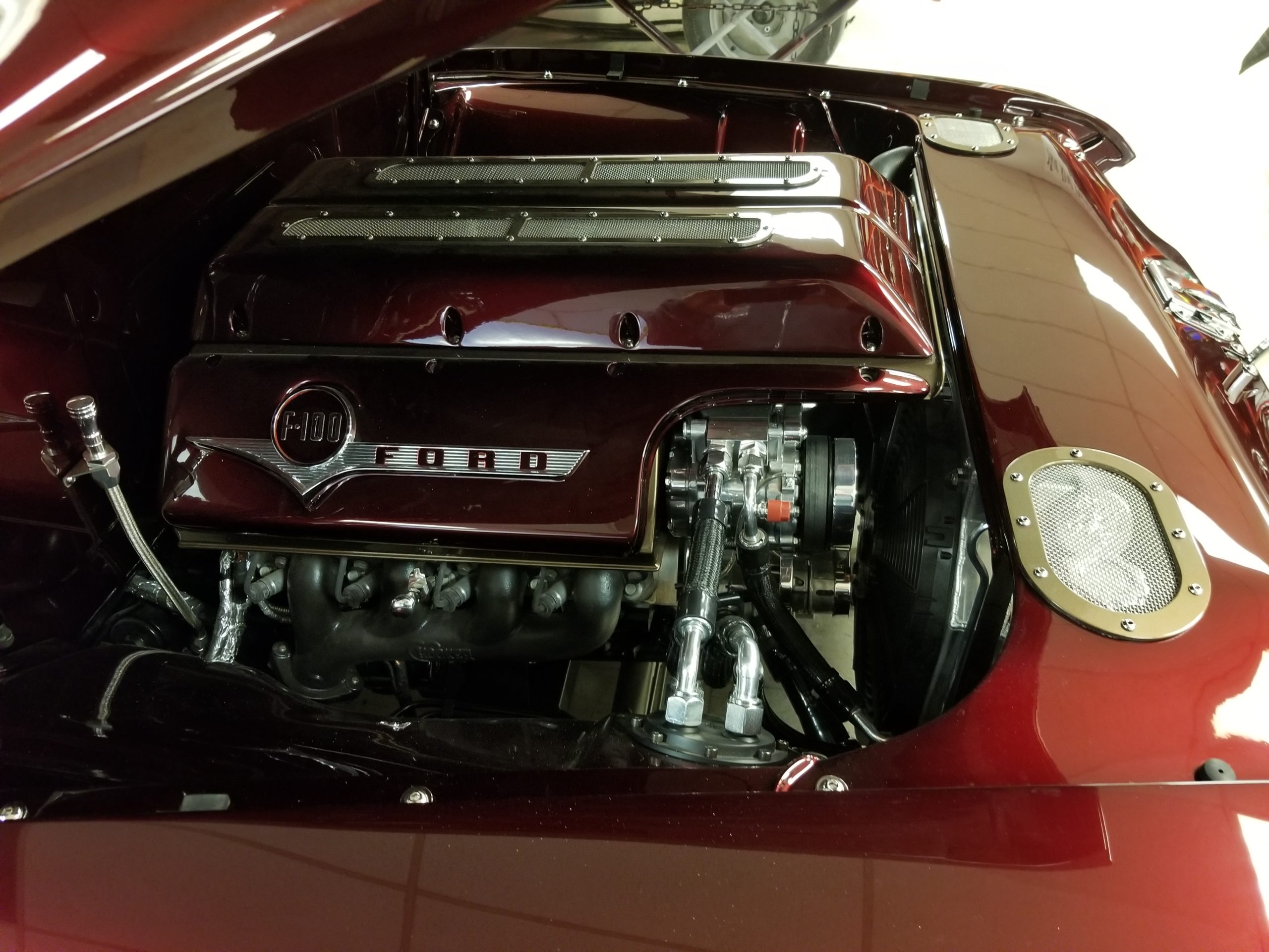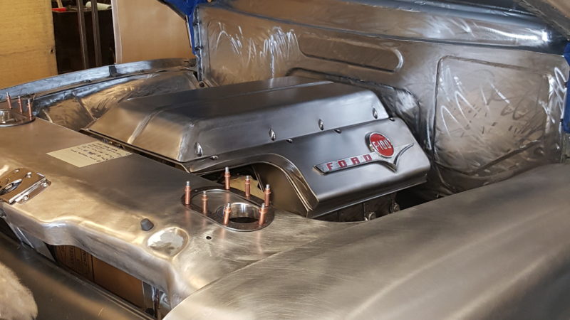 to hide that ugly LS engine and coil packs. Everything was fabricated from 18-gauge cold rolled steel. We did put a new emblem that should have been on the side of the hood into the cover over the coil packs. It says Ford, so how many people are we going to fool, a lot. Under the engine cover is where the computer box is hiding and there is a K&N air filter under there.