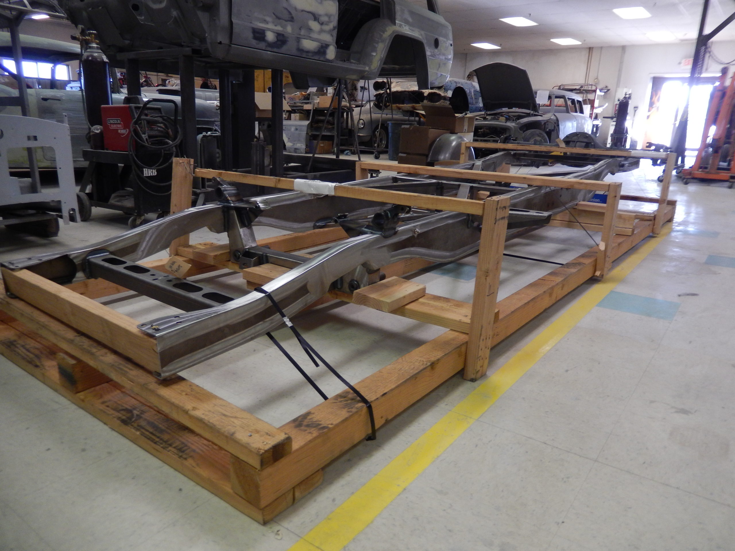 The chassis came from Total Cost Involved (TCI). We called TCI up and asked for the best riding and handling chassis they had. We talked to a guy there that had a F100 and drove it from California to Kentucky with his wife and he said she enjoyed the ride, very smooth. So that is the chassis we went with. The Chassis can complete less assembly. Front suspension, four bar rear suspension with a 9-inch ford rear (3:70 posi rear gear ratio). 12-inch Wilwood breaks all the way around. Ride Tech coilover shocks, ride awesome. All the breaks were plumbed, master cylinder mounted on the frame with buster. Very nice and complete chassis with some assembly required. Frame came with all the sway bars, front and rear. The Chassis was bought through Alan at BAD racing in Black Hawk SD.