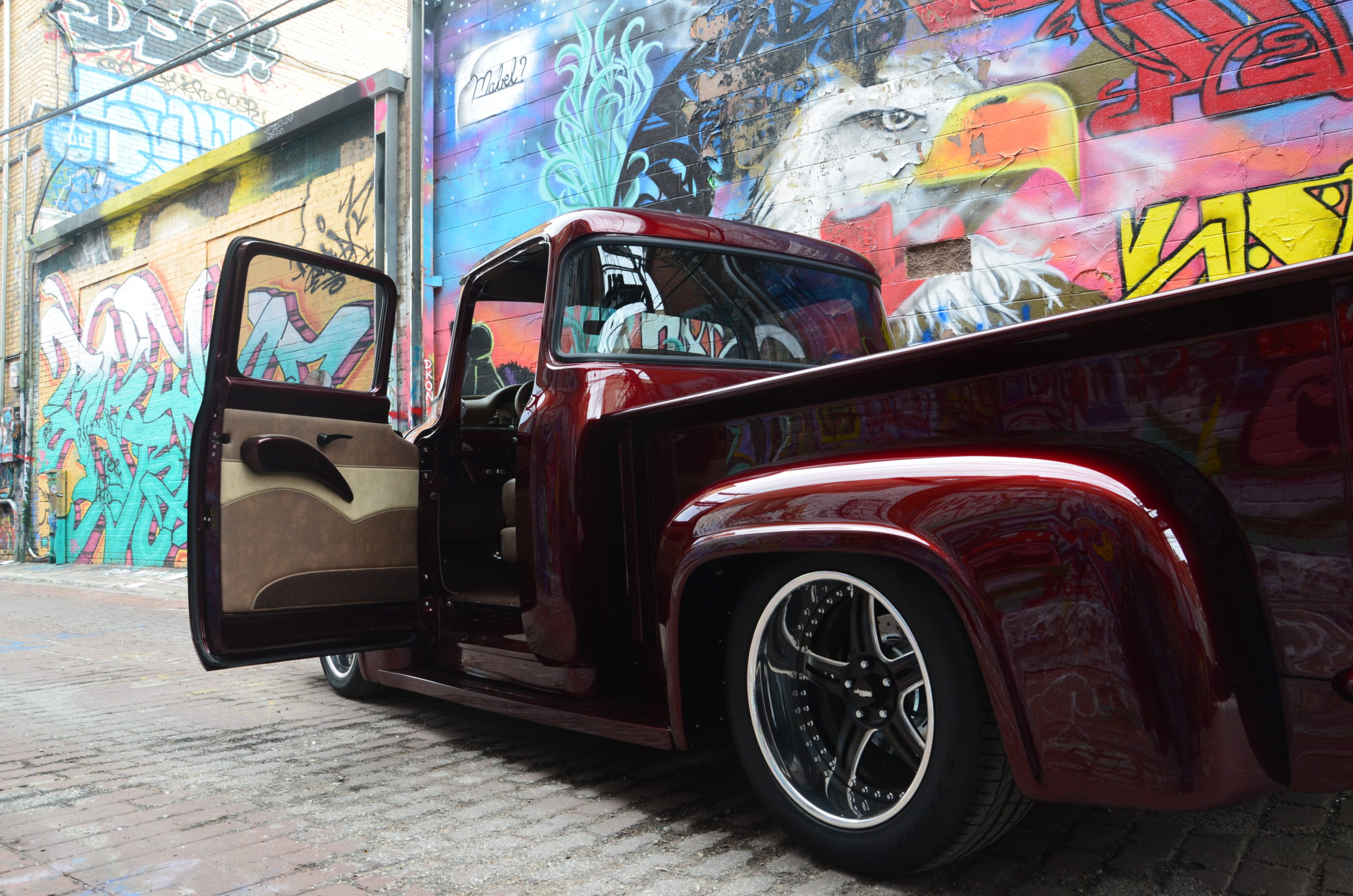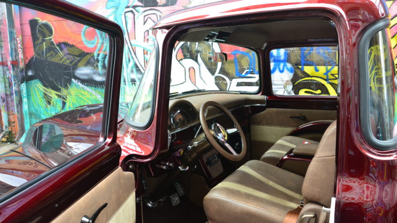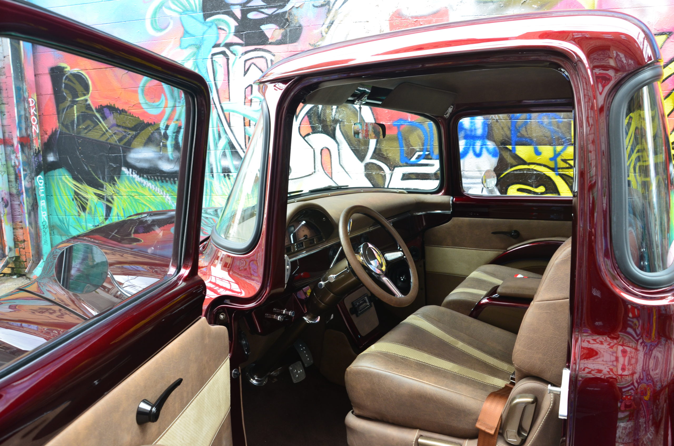 The Paint is from House of Kolor, Candy Brandy Wine. The brandy wine is much more user friendly since HOK made a base coat candy version of the iconic Candy Brandy Wine. We used a black sealer, just like Jon K. himself told us to do. It gives that deep on the dark side rich color. Our head paint in the Rod Shop, Kelly Hebbring can really lay the paint down. Then the zero texture and extreme gloss was brought forth by the hard work and keen eye of Danny LaRue. Between Kelly and Danny, wow it is as nice as it comes. Kelly laid down 3 coats of the base candy and 5 coats of the clear, so Danny could sand a couple coats off and polish and polish. Did you notice the tasteful stripping and lettering on the truck? Eldon Amero our Refinishing instructor is very handy with a pin stripping brush. Mark is also very patriotic and had GBA on his license plate, it means God Bless America. So instead of Mark having to tell everyone what it GBA meant he had Eldon paint the word on the tailgate. Pinstripes were tastefully laid down all over the truck; tailgate letters, wheels, steering wheel and don’t forget the cool design on the rear differential and some more I probably forgot about. Headlights was ordered online, no big deal there. The outside mirrors are the swan neck from Speedway Motors. The outside door handles are from Ring Brothers, very nice piece. The upper part of the door handle was pained the accent brown and the lower was left black powder coat.